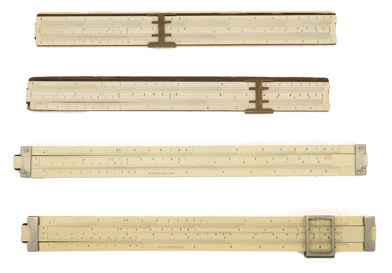 3rd item: K&E 4087-T 20 in Duplex slide rule. Composed of two-sided celluloid coated mahogany, with laminated edges, with glass “clamshell” indicator in an unmarked metal frame; metal L bracket end pieces. Marked “Keuffel & Esser Co. N.Y.” with patent dates “Pat. June 5, ’00” and “Dec. 22, ’08”. Overall 22 1/4 in. L x 1 7/8 in. W.