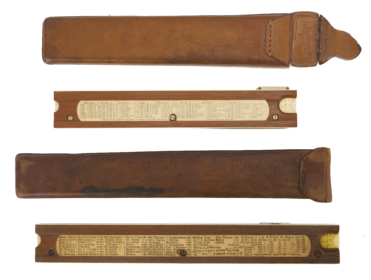 4th item: K&E N4035 8 in. Mannheim slide rule, “improved” metal rimmed cursor, mahogany construction with celluloid surfacing; scales labeled on left, marked , “Pat. June 5, 1900” and “Keuffel & Esser Co. N.Y.” on top rail as well as side of cursor; both frame and slide with serial number 416966 corresponding to year 1933. Contained in orange leather case with “K&E Mannheim Slide Rule” to top of flap. Rule overall 8 11/16 in L.