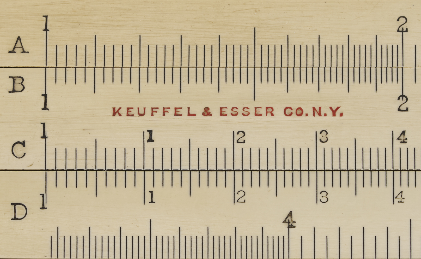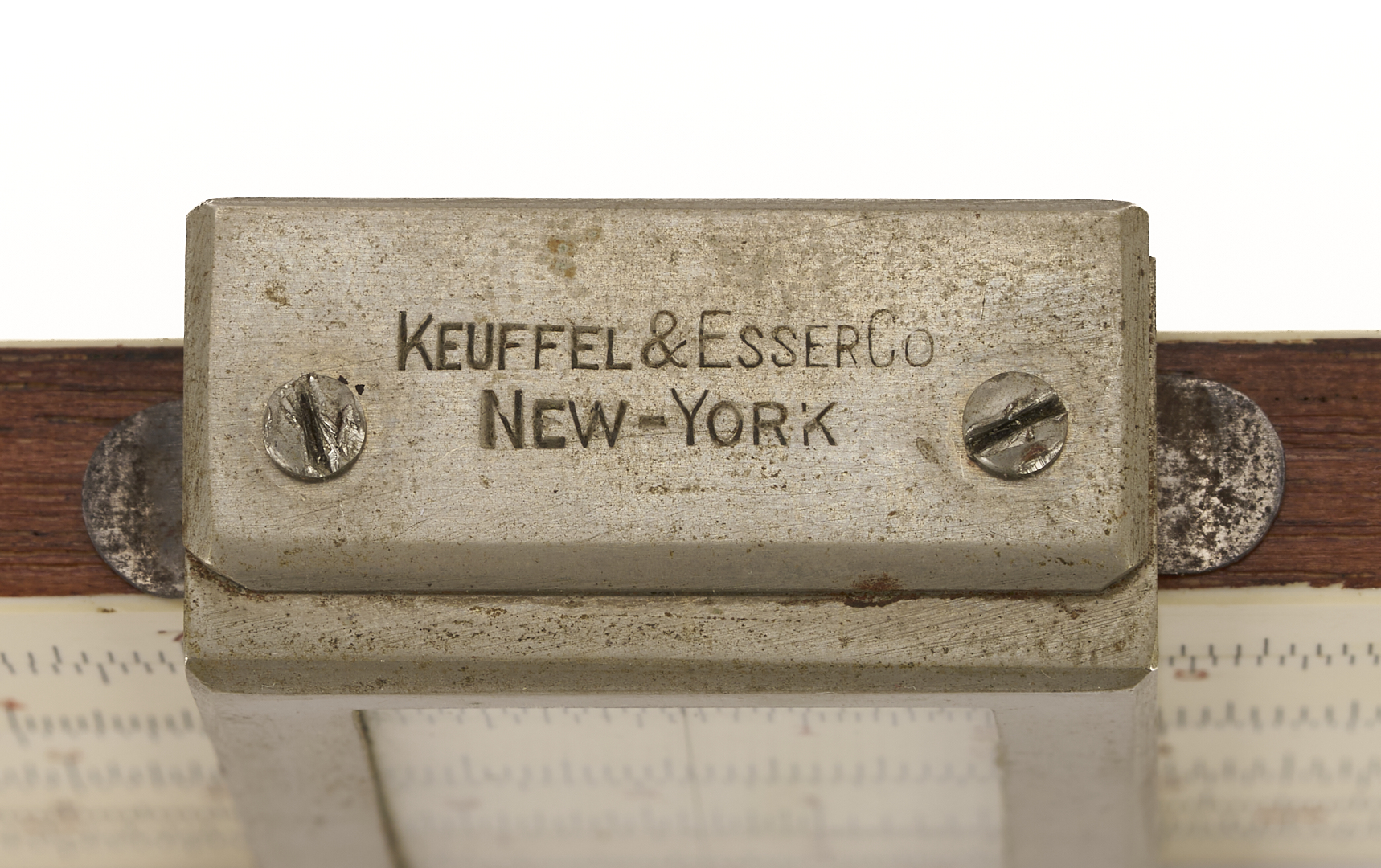 K&E 4090 Universal 10″ Slide Rule. A scarce, early “dual slide” design with three rails and two conjoined slides. The additional rails made more calculations possible, but was prohibitively expensive to purchase and was discontinued soon after. Mahogany wood covered in celluloid, with a glass indicator. Marked <4090> on one slide, along with “Keuffel & Esser Co. N.Y.” and “Pat. Mar.21, ’99 Pat. June 5, ’00 Dec. 22, ’08”. Front side scales: A [B, C] D, CF [CF, S] A. Back side: A [BI, CI] D, CF [CI, L, T] D. Ca. early 1908-1912. Overall 12 5/8 in. L x 2 1/8 in. W.