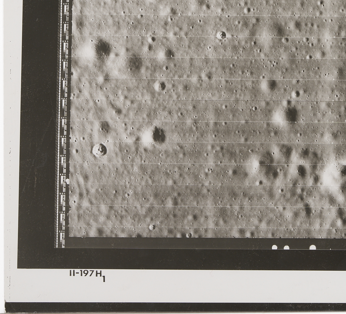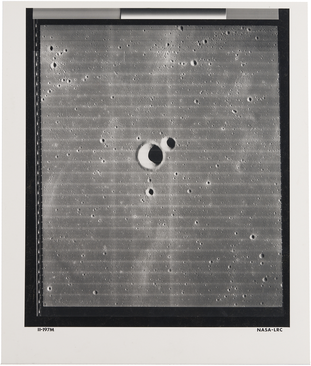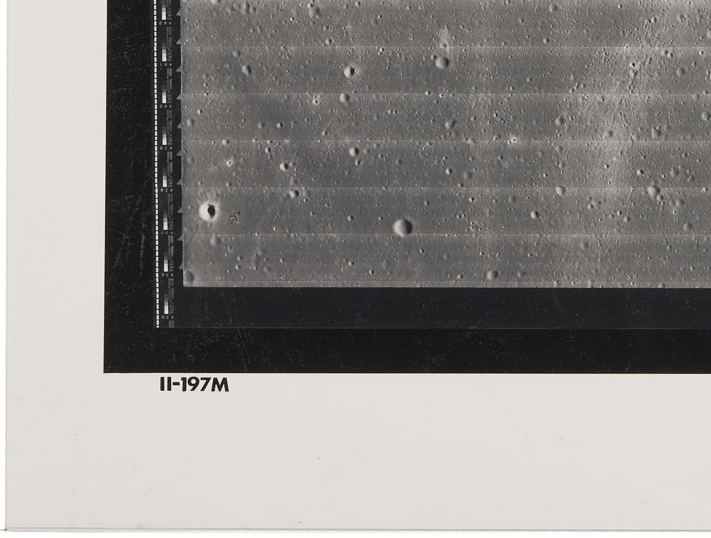 Four (4) original large-format vintage gelatin silver prints on glossy paper from NASA’s Second Lunar Orbiter mission, November 18-25, 1966. The photographs are designated II-197M, II-197H1, II-197H2, and II-197H3, lower left. A total of 215 sets of photographs were planned for the second orbiter mission in 1966, each consisting of one medium-resolution image and three high-resolution images of the same area. The four complementary images in group 197 show the Maestlin G crater and its smaller binary crater. The area in the main image slightly to the southeast of Maestlin G was designated as Landing Site 5 for the Apollo 11 and 12 missions, a backup site should the need arise. Unframed. Sheets measure 24″ H x 20″ W.