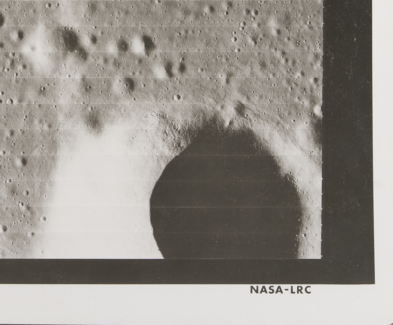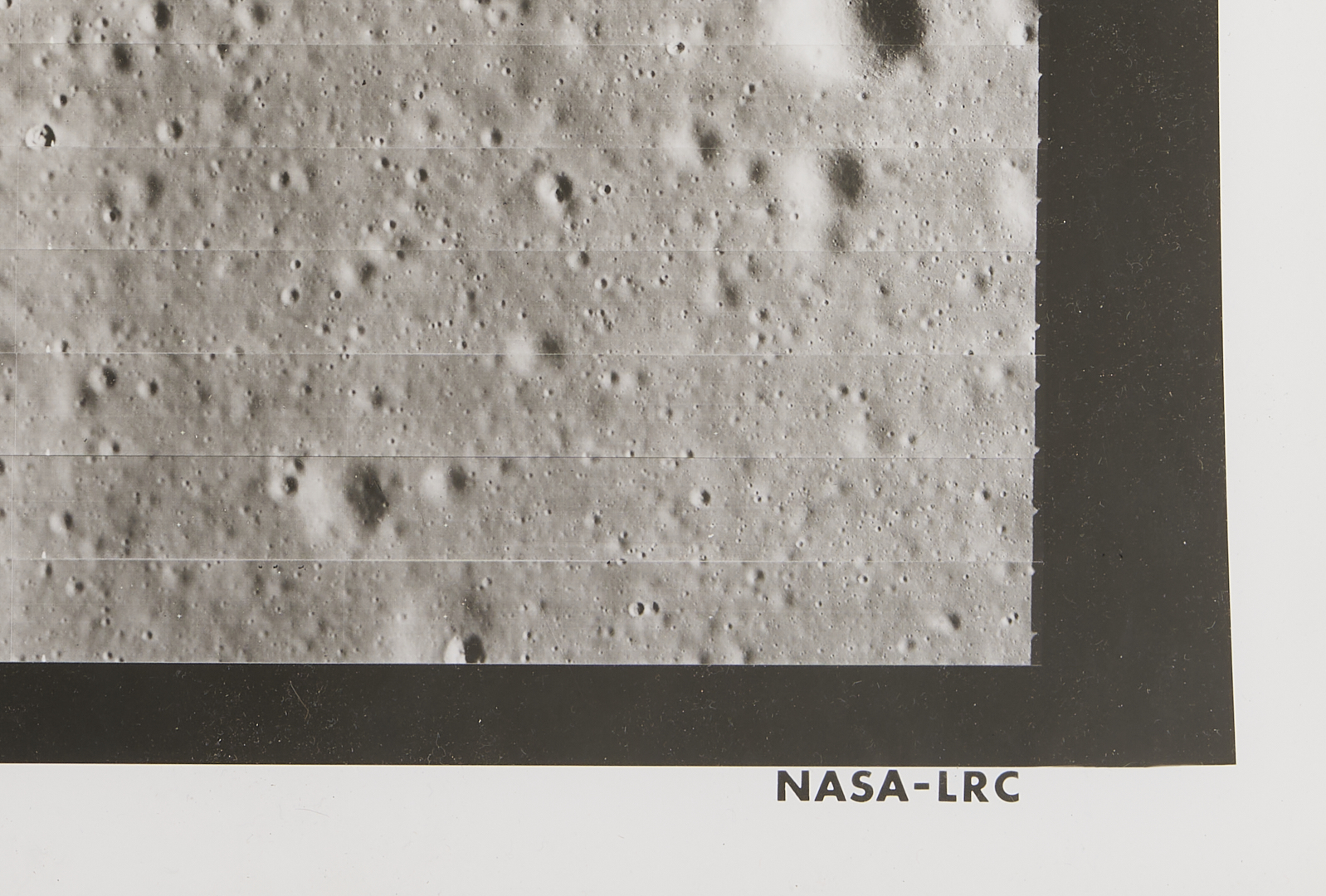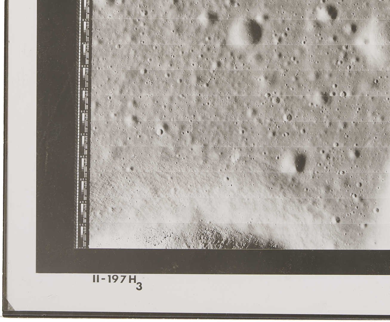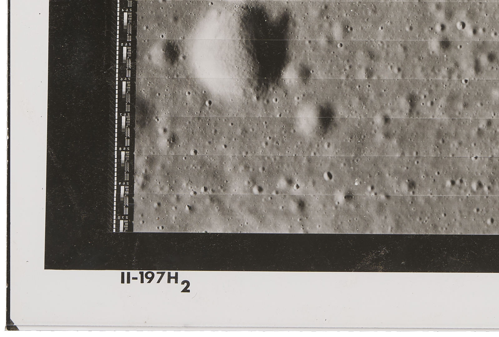 Four (4) original large-format vintage gelatin silver prints on glossy paper from NASA’s Second Lunar Orbiter mission, November 18-25, 1966. The photographs are designated II-197M, II-197H1, II-197H2, and II-197H3, lower left. A total of 215 sets of photographs were planned for the second orbiter mission in 1966, each consisting of one medium-resolution image and three high-resolution images of the same area. The four complementary images in group 197 show the Maestlin G crater and its smaller binary crater. The area in the main image slightly to the southeast of Maestlin G was designated as Landing Site 5 for the Apollo 11 and 12 missions, a backup site should the need arise. Unframed. Sheets measure 24″ H x 20″ W.