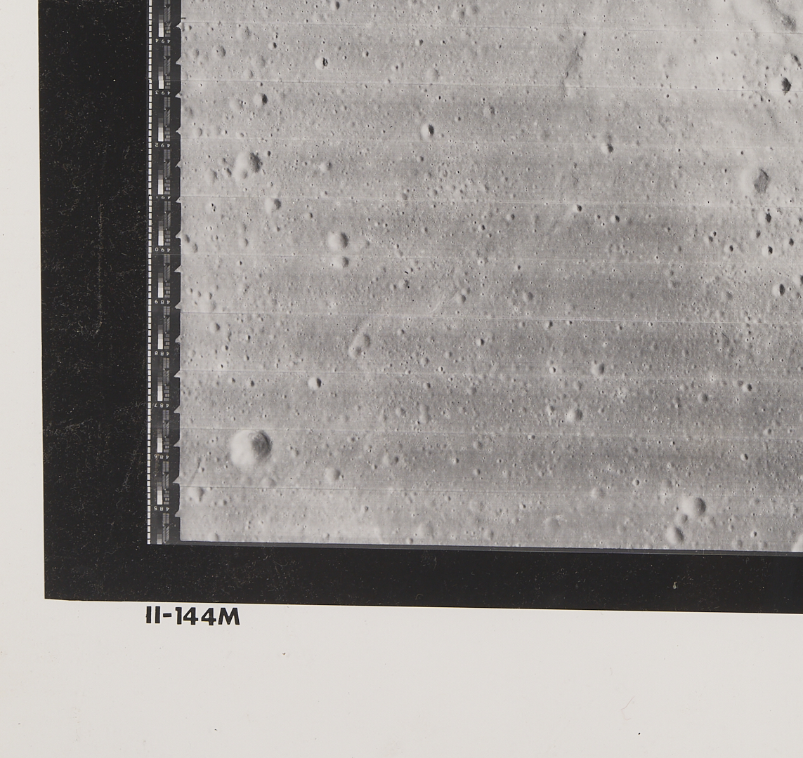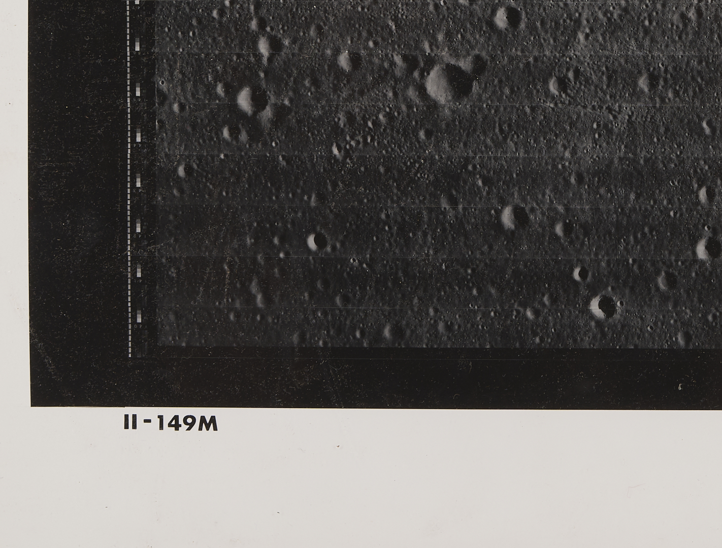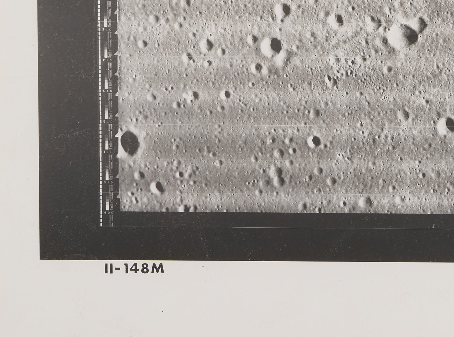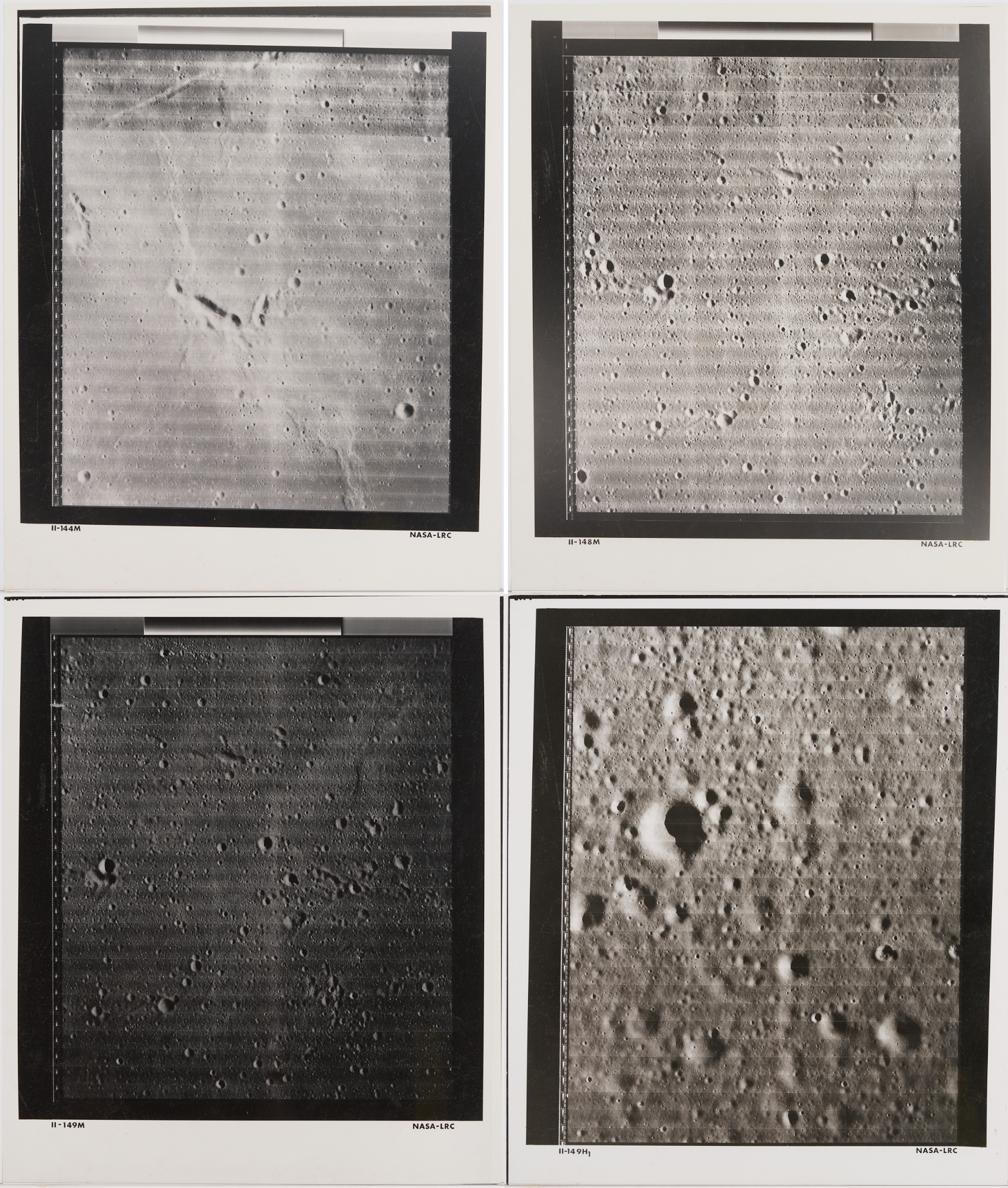 Four (4) original large-format vintage gelatin silver prints on glossy paper from NASA’s Second Lunar Orbiter mission, November 18-25, 1966. The photographs are designated 144M, 148M, 149M, and 149H1 lower left; 144M shows the area approximately 70 km East of Gambart Crater; the last three photos cover a small crater-strewn area of the Mare Insularum, west of Reinhold crater and north/northeast of Lansberg crater. Unframed. Sheets measure 24 in H x 20 in W. A total of 215 “sets” of photographs were planned for the second orbiter mission in 1966, each consisting of one medium-resolution image and three high-resolution images of the same area.