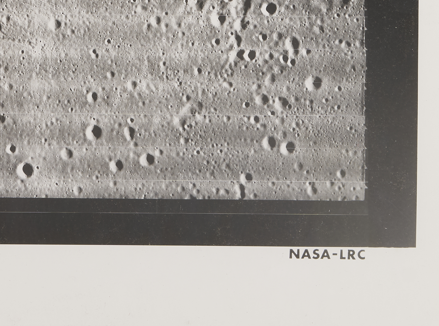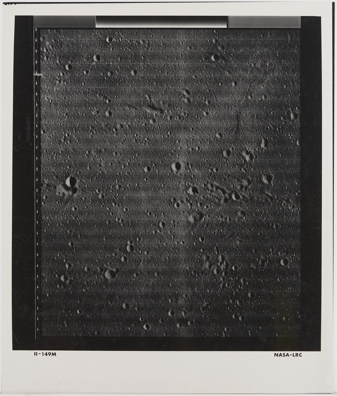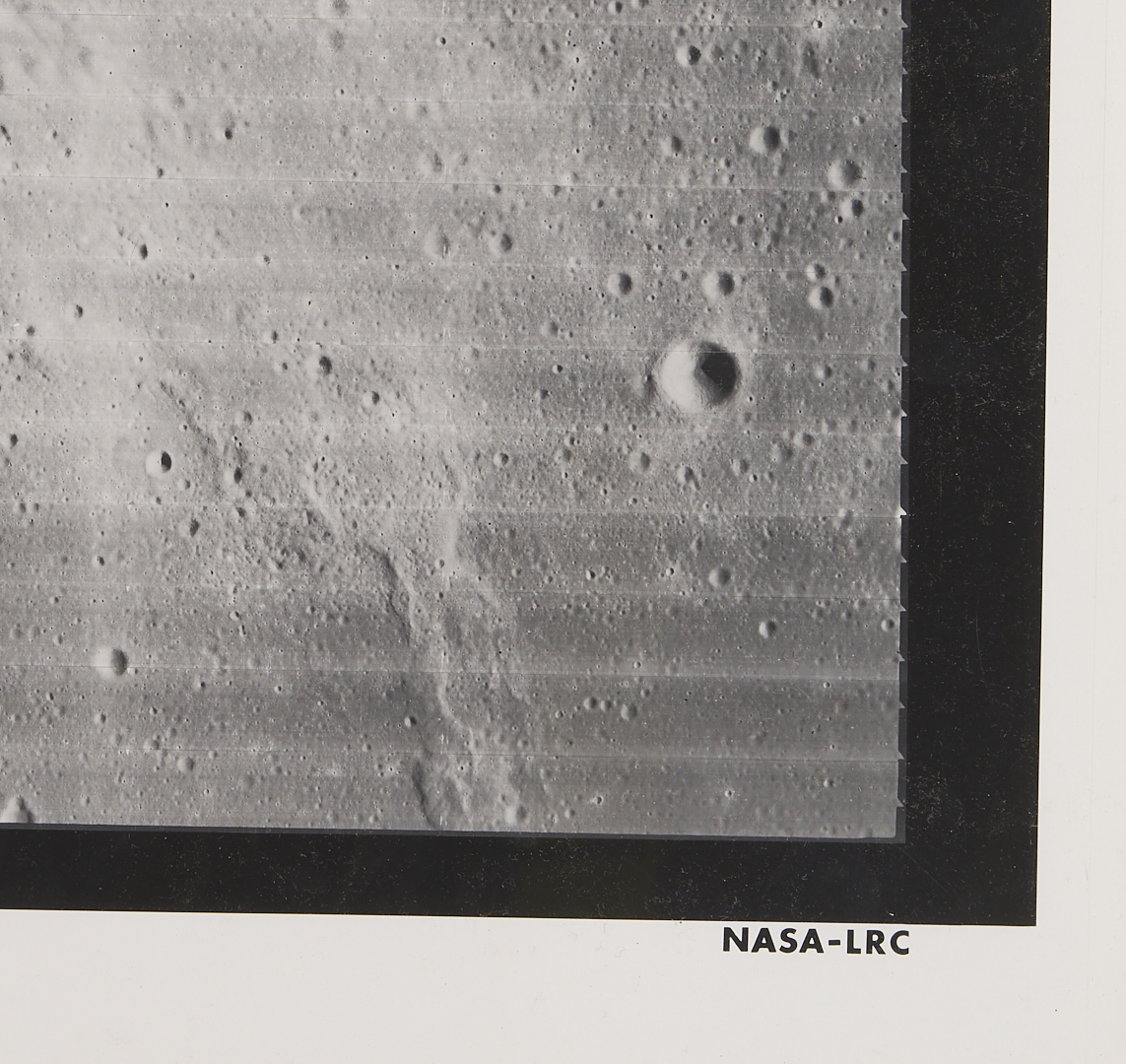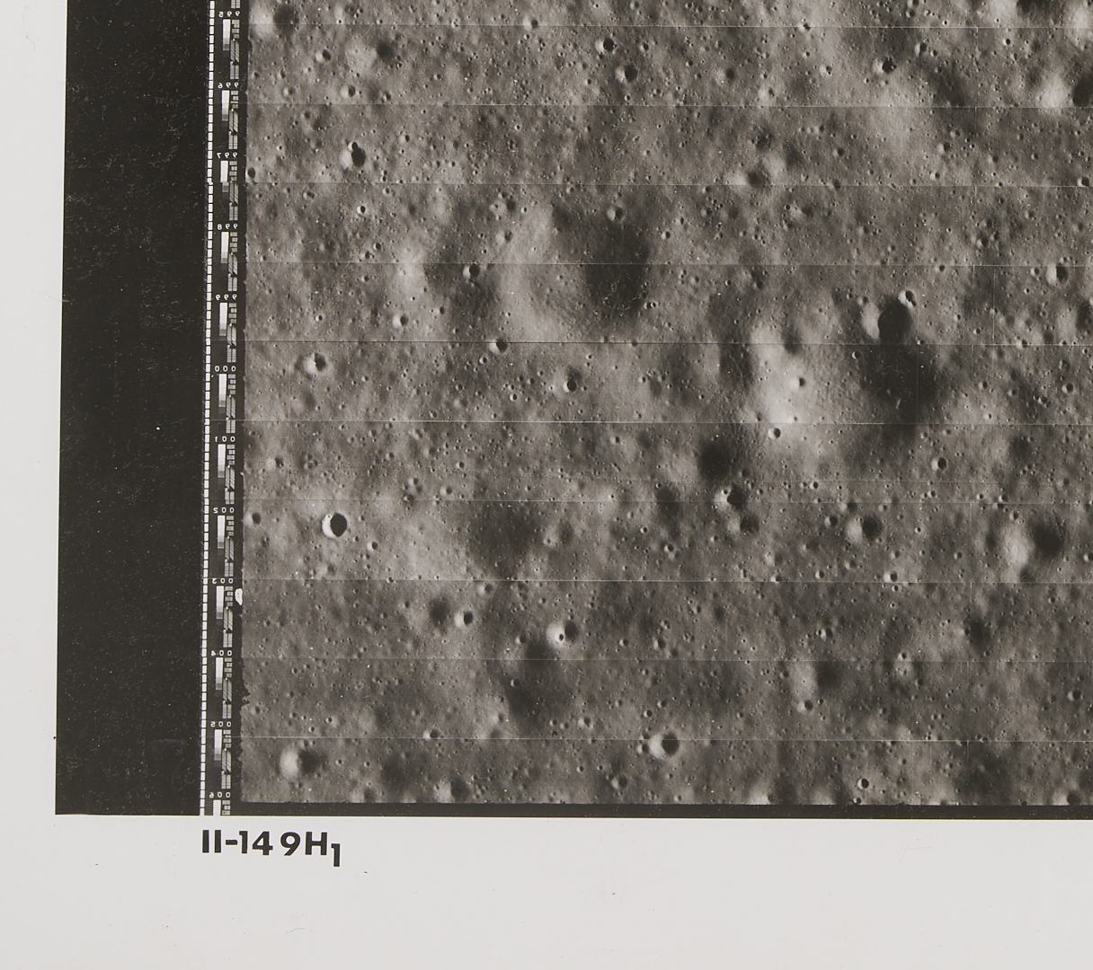Four (4) original large-format vintage gelatin silver prints on glossy paper from NASA’s Second Lunar Orbiter mission, November 18-25, 1966. The photographs are designated 144M, 148M, 149M, and 149H1 lower left; 144M shows the area approximately 70 km East of Gambart Crater; the last three photos cover a small crater-strewn area of the Mare Insularum, west of Reinhold crater and north/northeast of Lansberg crater. Unframed. Sheets measure 24 in H x 20 in W. A total of 215 “sets” of photographs were planned for the second orbiter mission in 1966, each consisting of one medium-resolution image and three high-resolution images of the same area.
