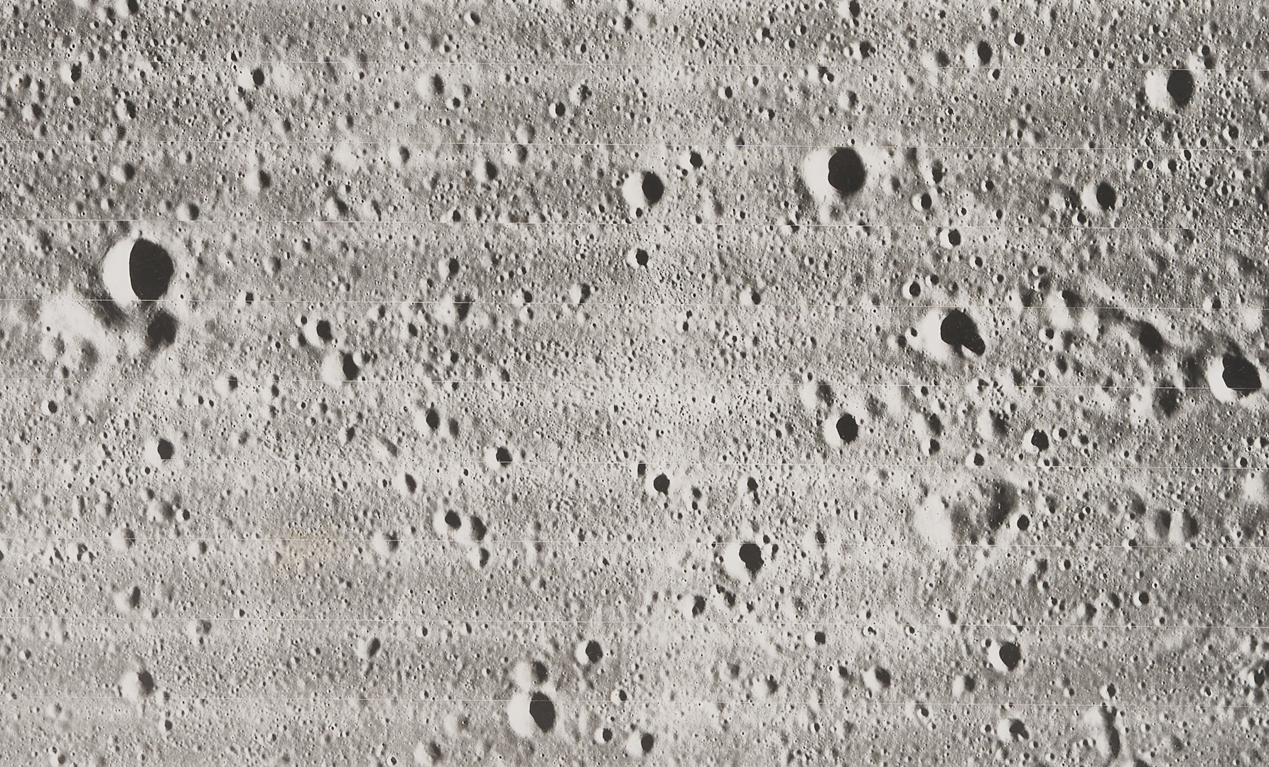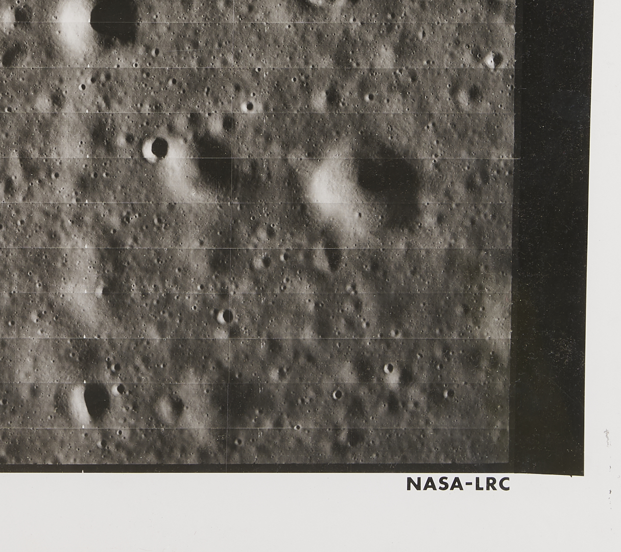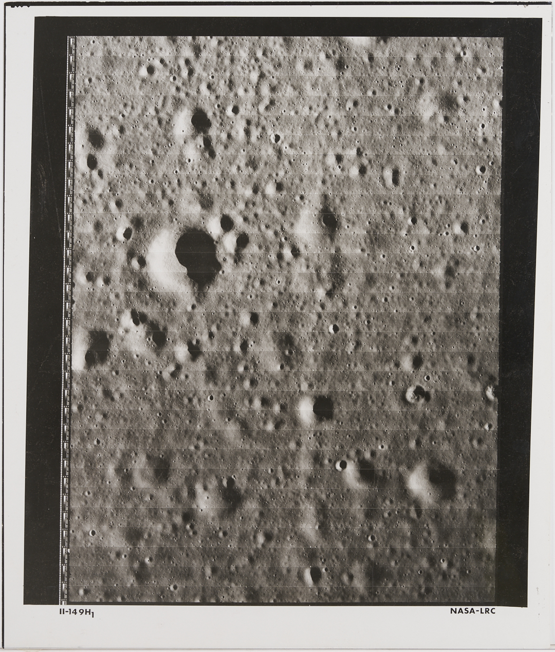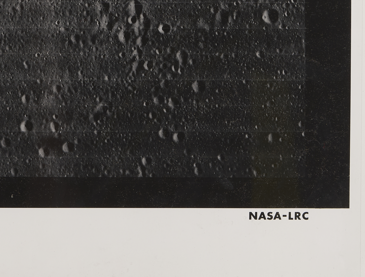 Four (4) original large-format vintage gelatin silver prints on glossy paper from NASA’s Second Lunar Orbiter mission, November 18-25, 1966. The photographs are designated 144M, 148M, 149M, and 149H1 lower left; 144M shows the area approximately 70 km East of Gambart Crater; the last three photos cover a small crater-strewn area of the Mare Insularum, west of Reinhold crater and north/northeast of Lansberg crater. Unframed. Sheets measure 24 in H x 20 in W. A total of 215 “sets” of photographs were planned for the second orbiter mission in 1966, each consisting of one medium-resolution image and three high-resolution images of the same area.