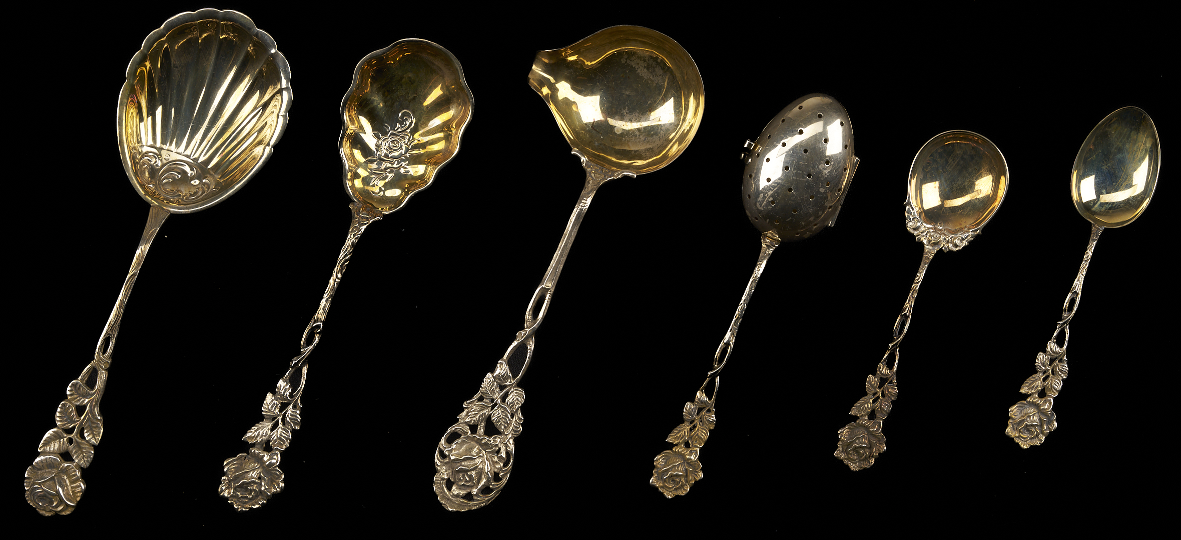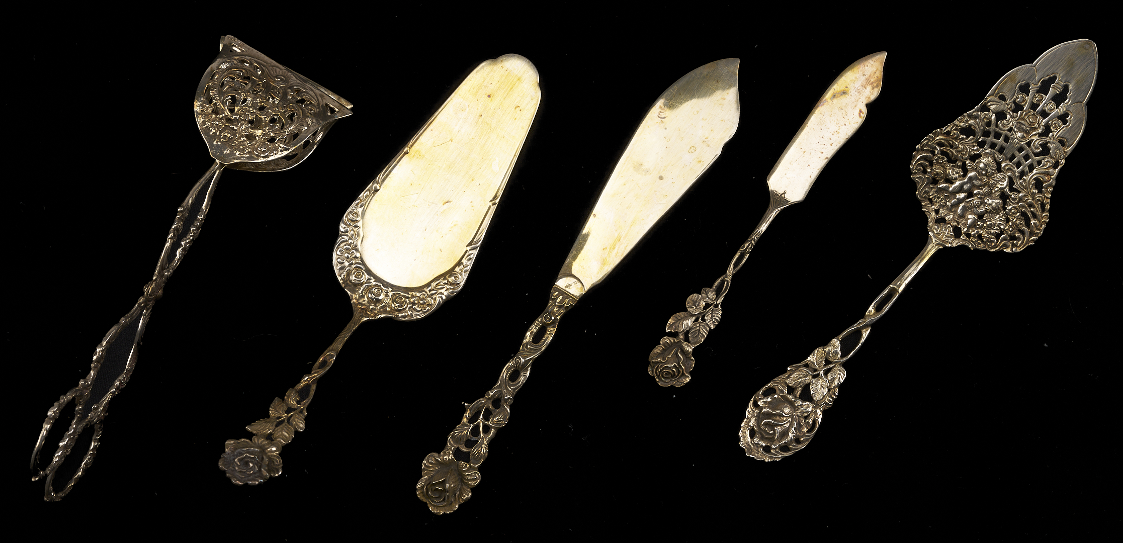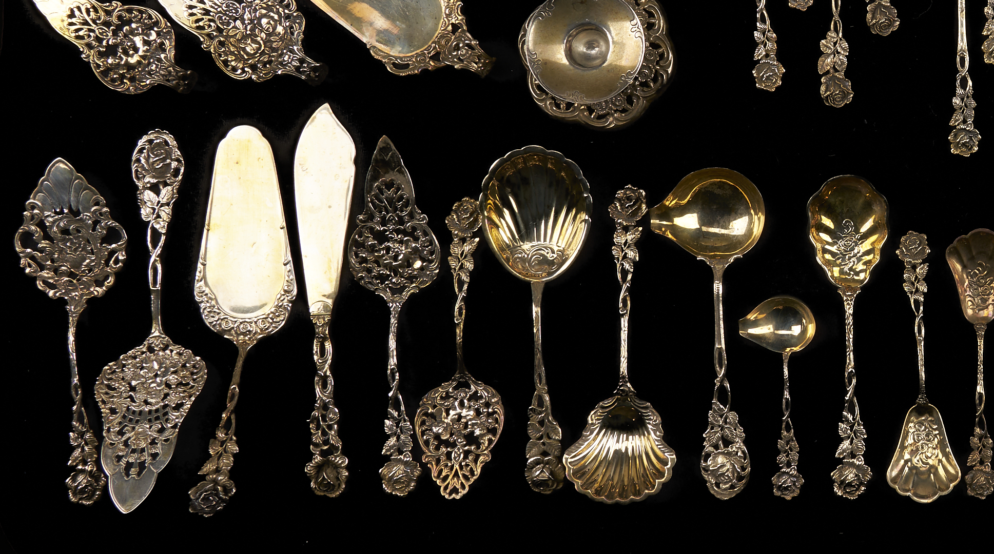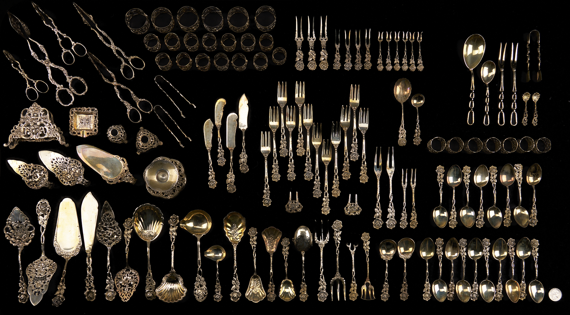 One hundred eleven (111) pieces of German .835 Hildesheimer Rose silver flatware, mostly dessert related, including: 12 pastry forks (5 3/8 in. L), 18 5 o’clock spoons (4 5/8 in. L), 4 assorted butter spreaders, 6 large napkin rings, 14 small napkin rings, 17 assorted two-tine forks, 2 three-tine forks, 2 ice cream spoons, 4 assorted pierced pastry servers, 2 pierced pastry servers with curled handles, 2 pastry server with solid blades, 5 assorted patry tongs,1 master pastry knife, 2 sugar tongs, 2 pouring spoons, 4 assorted shaped sugar shells, 1 sugar sifting spoon, 2 shell form serving spoons, 1 master salt spoon, 1 leaf form spoon, 1 olive/pickle shovel, 1 individual ashtray, 2 tripodal pierced holders, 1 napkin holder, 1 pedestal bowl, and 2 tow tine picks. Some pieces with marks, pieces XRF test .835 purity. 62.53 troy ounces. The lot also includes 14 miscellaneous pieces .835 German silver flatware, including 7 napkin rings, 2 salt spoons, 2 cocktail. forks, 1 5 o’clock spoon, 1 pair of sugar tongs, and 1 olive spoon. 4.46 Troy ounces. 66.99 total troy ounces.