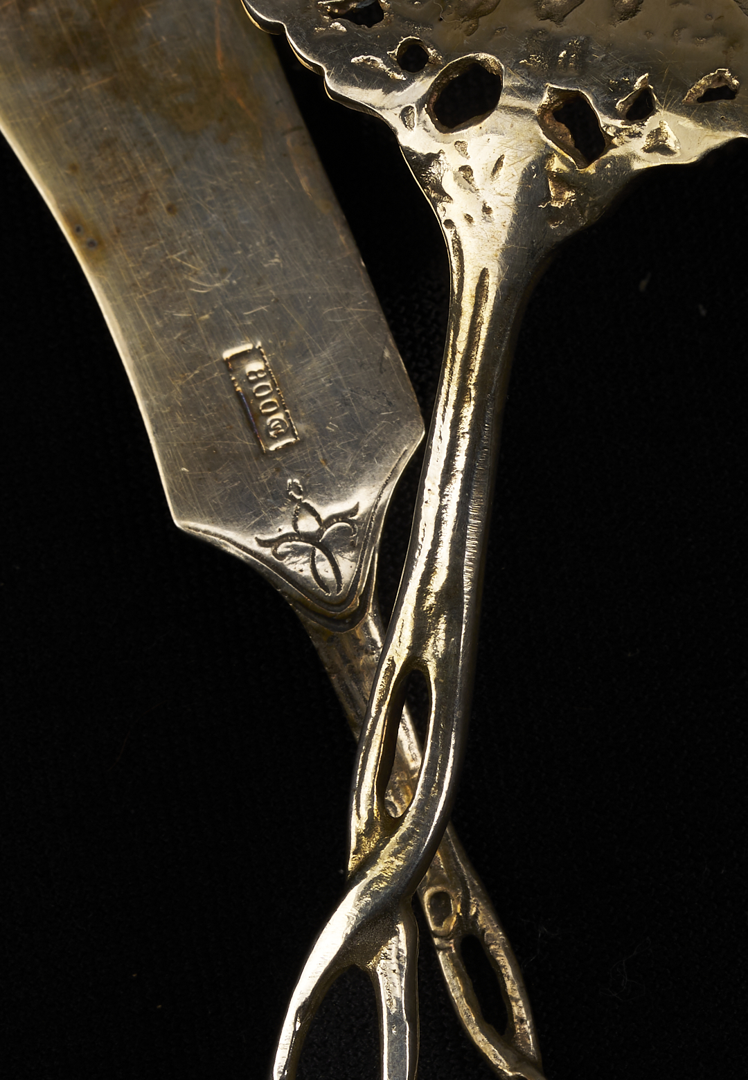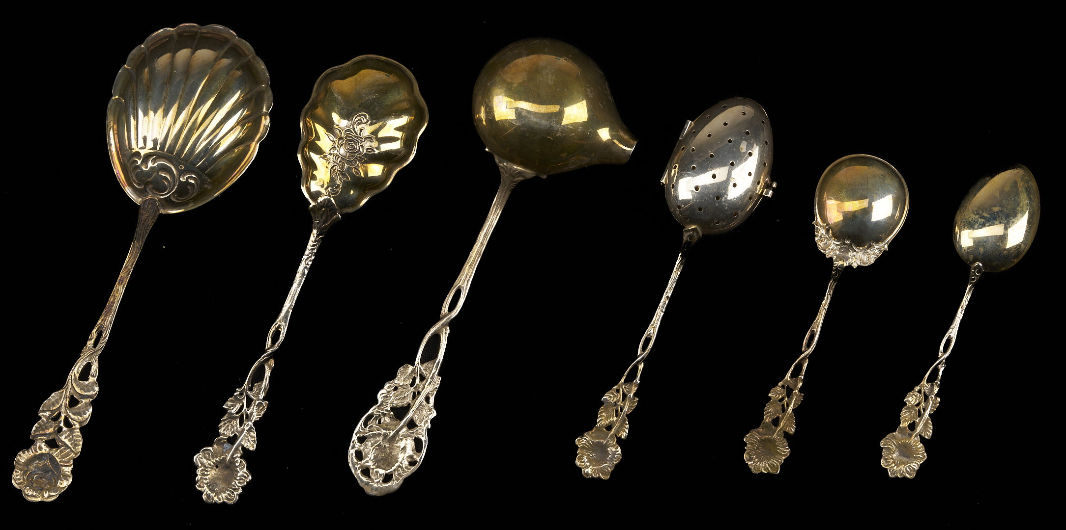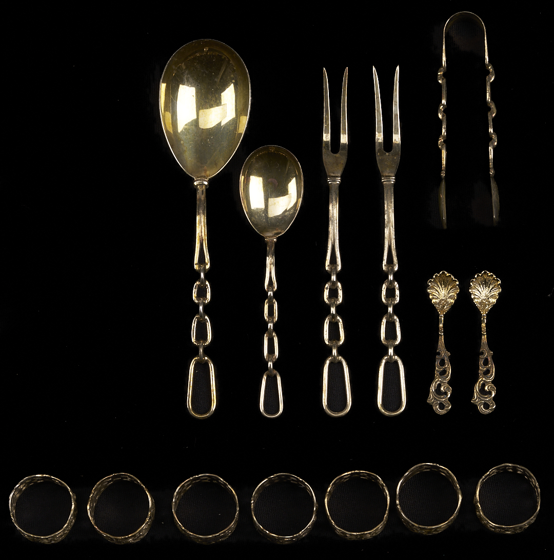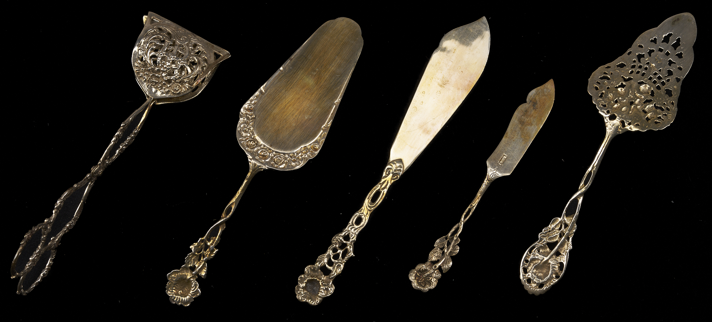 One hundred eleven (111) pieces of German .835 Hildesheimer Rose silver flatware, mostly dessert related, including: 12 pastry forks (5 3/8 in. L), 18 5 o’clock spoons (4 5/8 in. L), 4 assorted butter spreaders, 6 large napkin rings, 14 small napkin rings, 17 assorted two-tine forks, 2 three-tine forks, 2 ice cream spoons, 4 assorted pierced pastry servers, 2 pierced pastry servers with curled handles, 2 pastry server with solid blades, 5 assorted patry tongs,1 master pastry knife, 2 sugar tongs, 2 pouring spoons, 4 assorted shaped sugar shells, 1 sugar sifting spoon, 2 shell form serving spoons, 1 master salt spoon, 1 leaf form spoon, 1 olive/pickle shovel, 1 individual ashtray, 2 tripodal pierced holders, 1 napkin holder, 1 pedestal bowl, and 2 tow tine picks. Some pieces with marks, pieces XRF test .835 purity. 62.53 troy ounces. The lot also includes 14 miscellaneous pieces .835 German silver flatware, including 7 napkin rings, 2 salt spoons, 2 cocktail. forks, 1 5 o’clock spoon, 1 pair of sugar tongs, and 1 olive spoon. 4.46 Troy ounces. 66.99 total troy ounces.