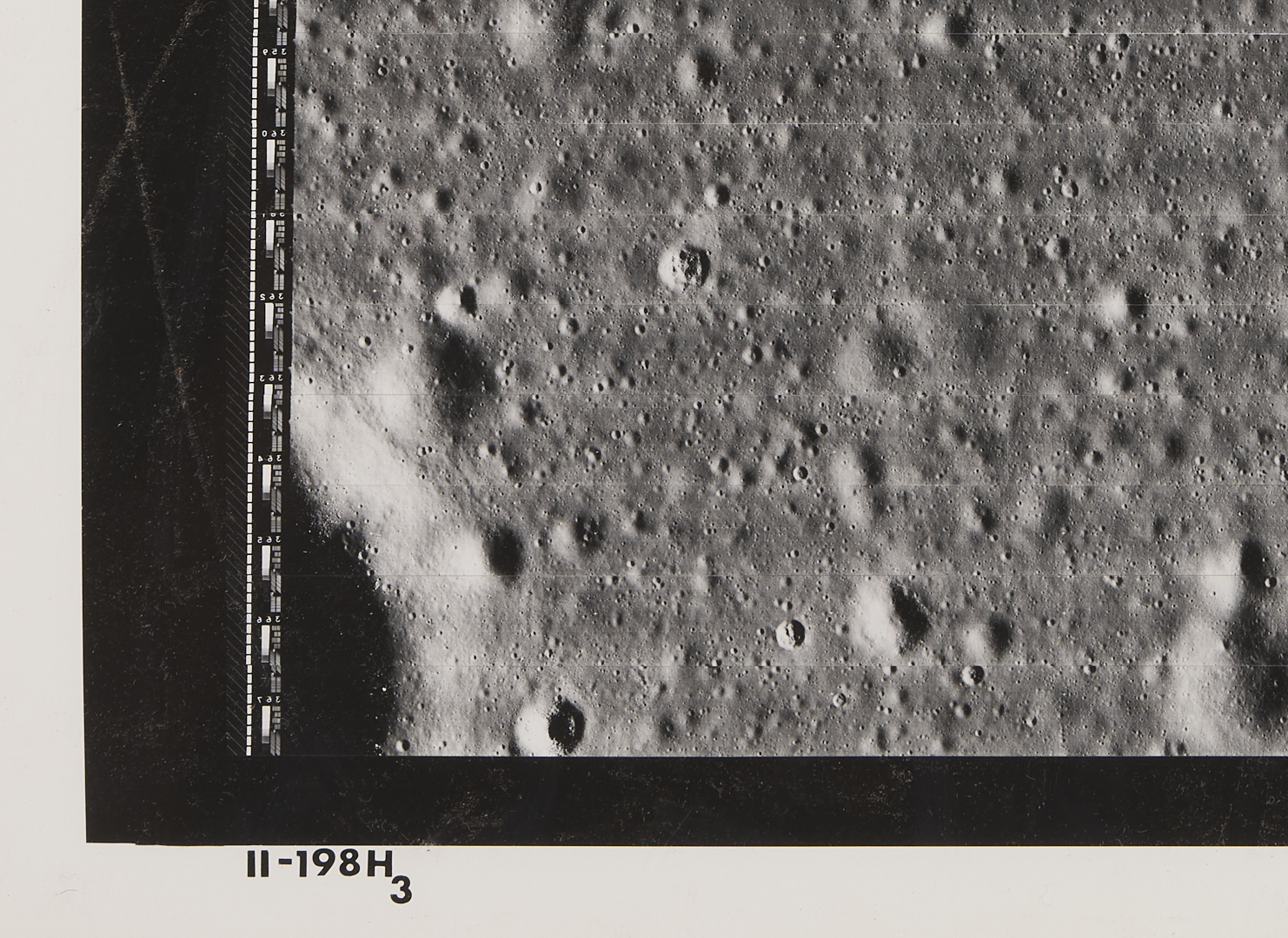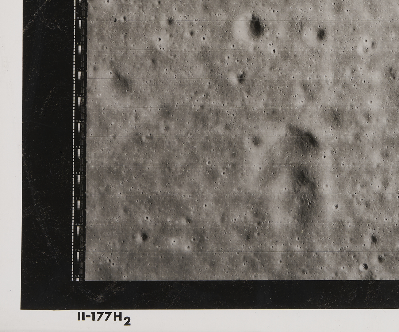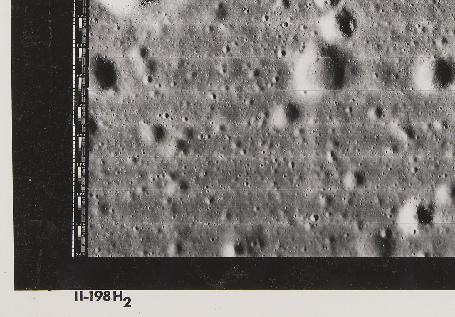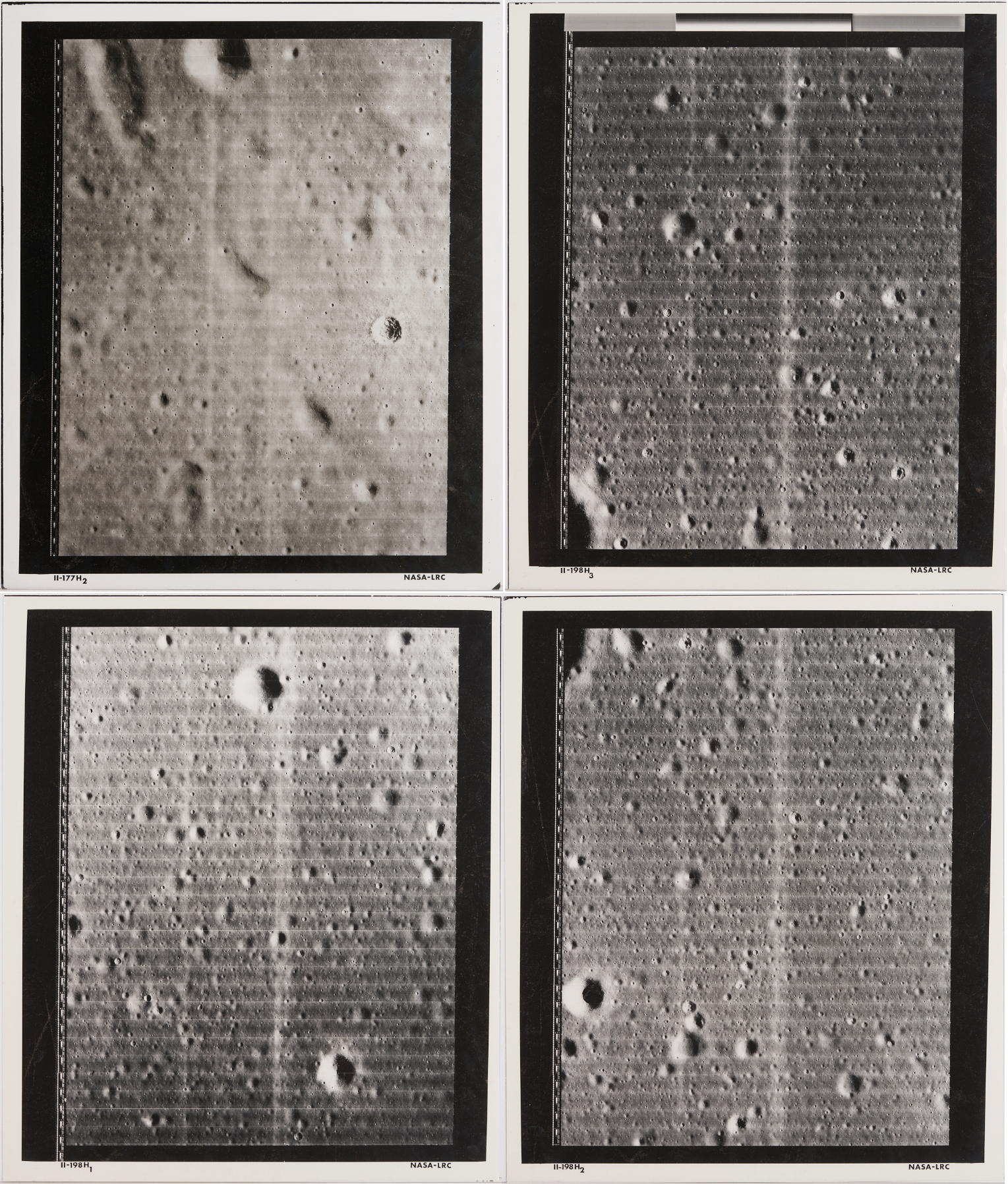 Four (4) original large-format vintage gelatin silver prints on matte paper from NASA’s Second Lunar Orbiter mission, launch date November 6, 1966. The photographs are designated II-179M, II-198H1, II-198H2, and II-198H3 lower left. A total of 215 sets of photographs were planned for the second orbiter mission in 1966, each consisting of one medium-resolution image and three high-resolution images of the same area. The three 198H (High Resolution) images show closeups of the area southeast of the Maestlin G crater, which was eventually designated as Landing Site 5 for the Apollo 11 and 12 missions, a backup site should the need arise. Also included is image 177H2, a view of the plains approximately 20 km west of Gambart J crater. Unframed. Sheets measure 24″ H x 20″ W.