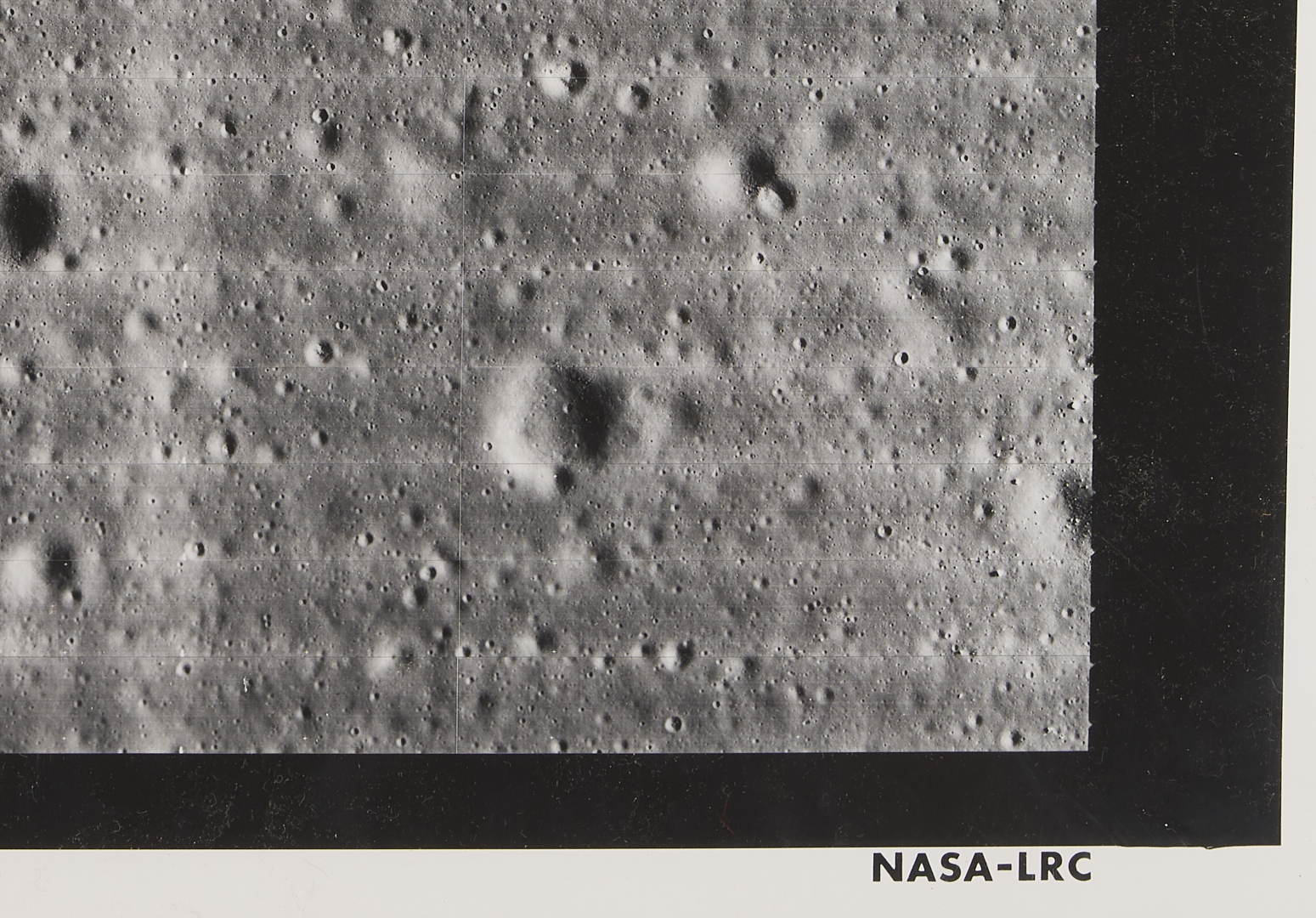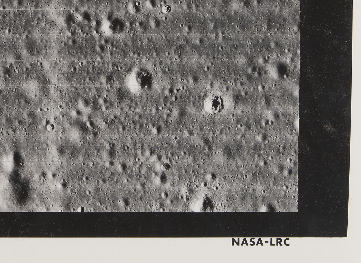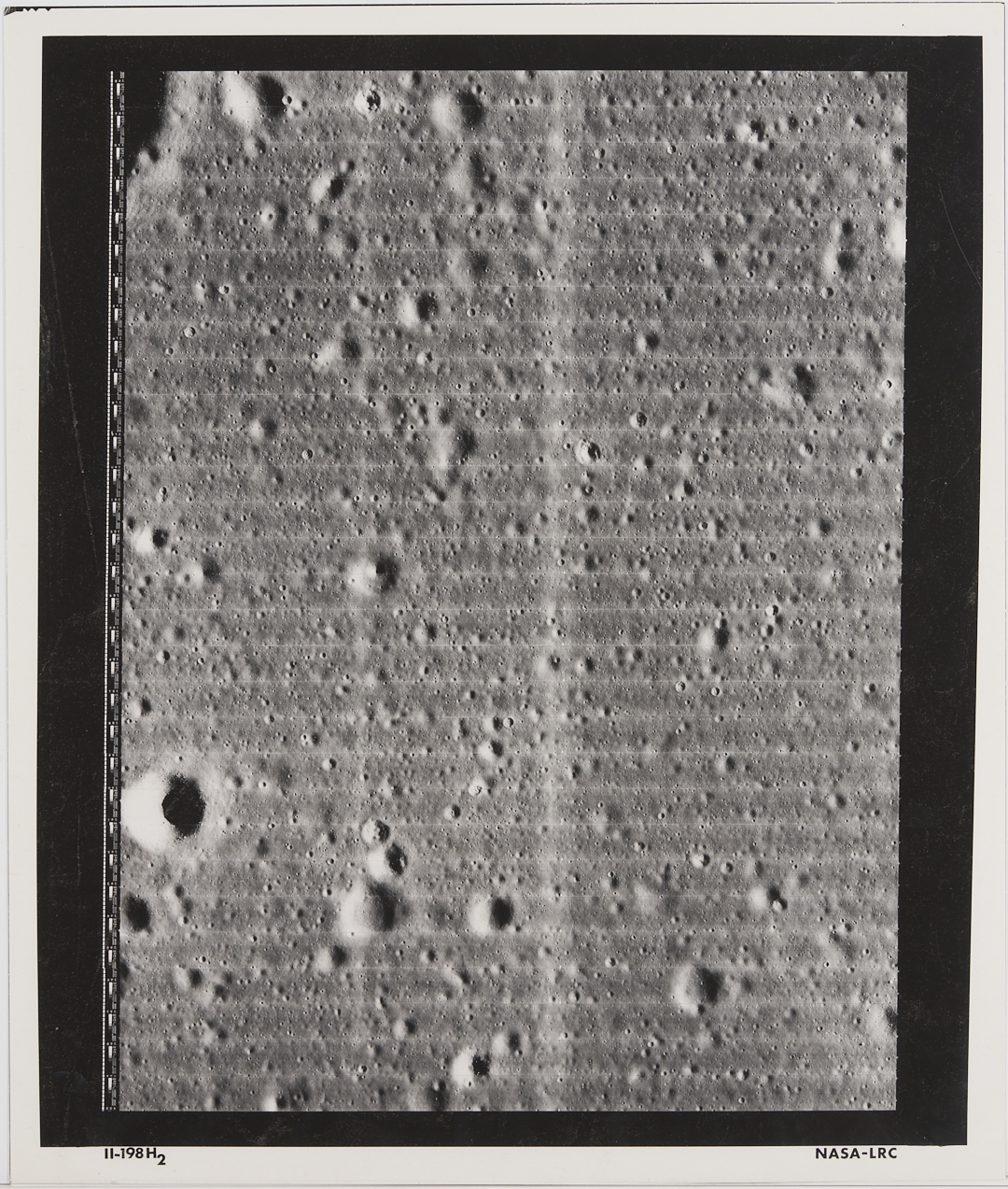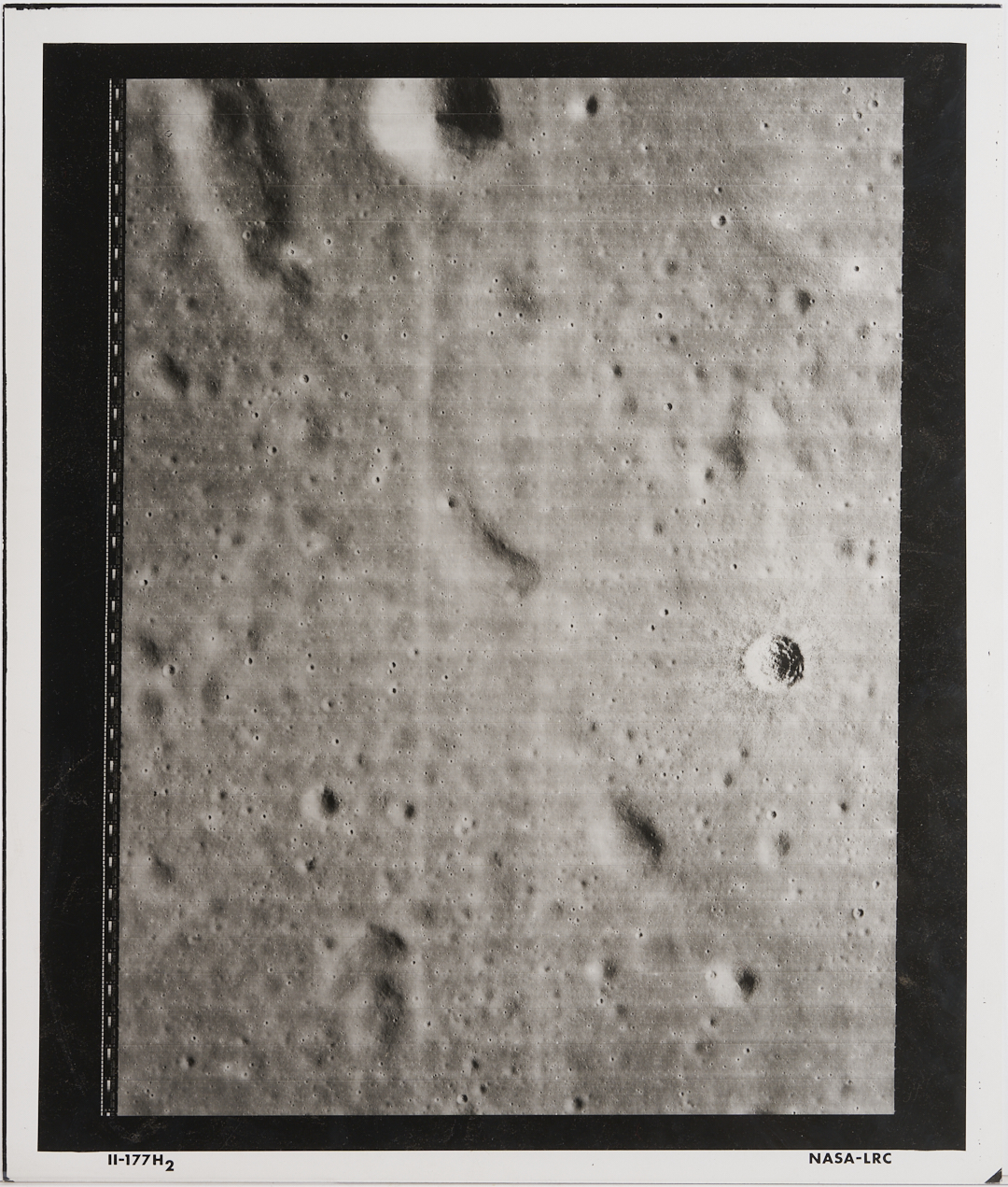 Four (4) original large-format vintage gelatin silver prints on matte paper from NASA’s Second Lunar Orbiter mission, launch date November 6, 1966. The photographs are designated II-179M, II-198H1, II-198H2, and II-198H3 lower left. A total of 215 sets of photographs were planned for the second orbiter mission in 1966, each consisting of one medium-resolution image and three high-resolution images of the same area. The three 198H (High Resolution) images show closeups of the area southeast of the Maestlin G crater, which was eventually designated as Landing Site 5 for the Apollo 11 and 12 missions, a backup site should the need arise. Also included is image 177H2, a view of the plains approximately 20 km west of Gambart J crater. Unframed. Sheets measure 24″ H x 20″ W.