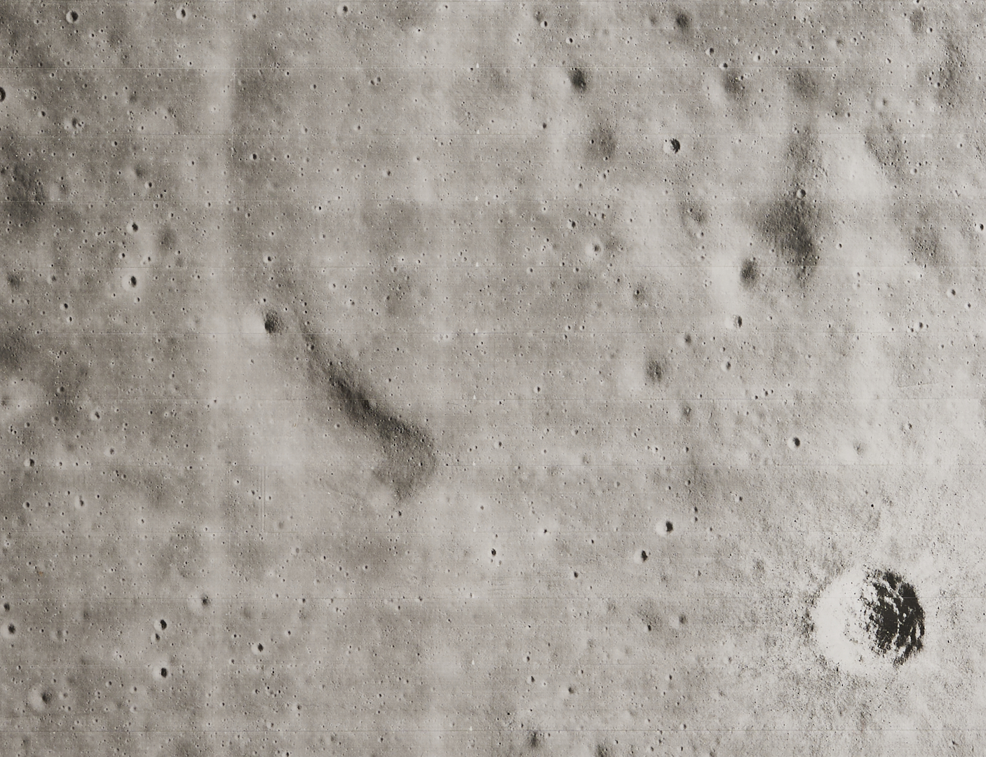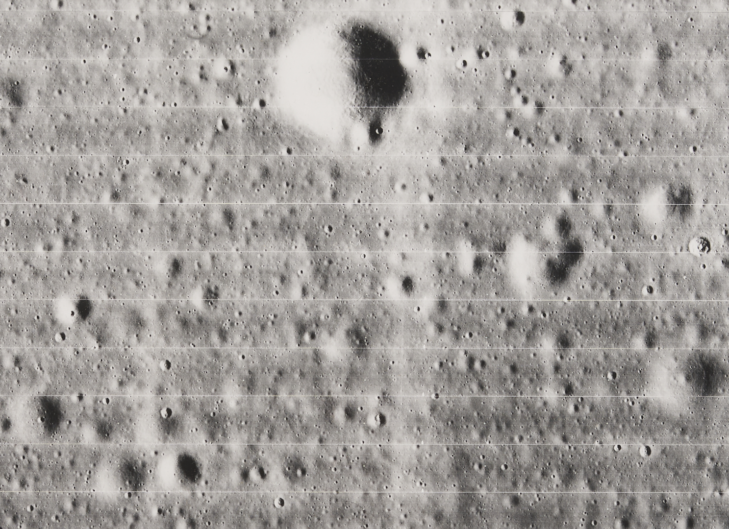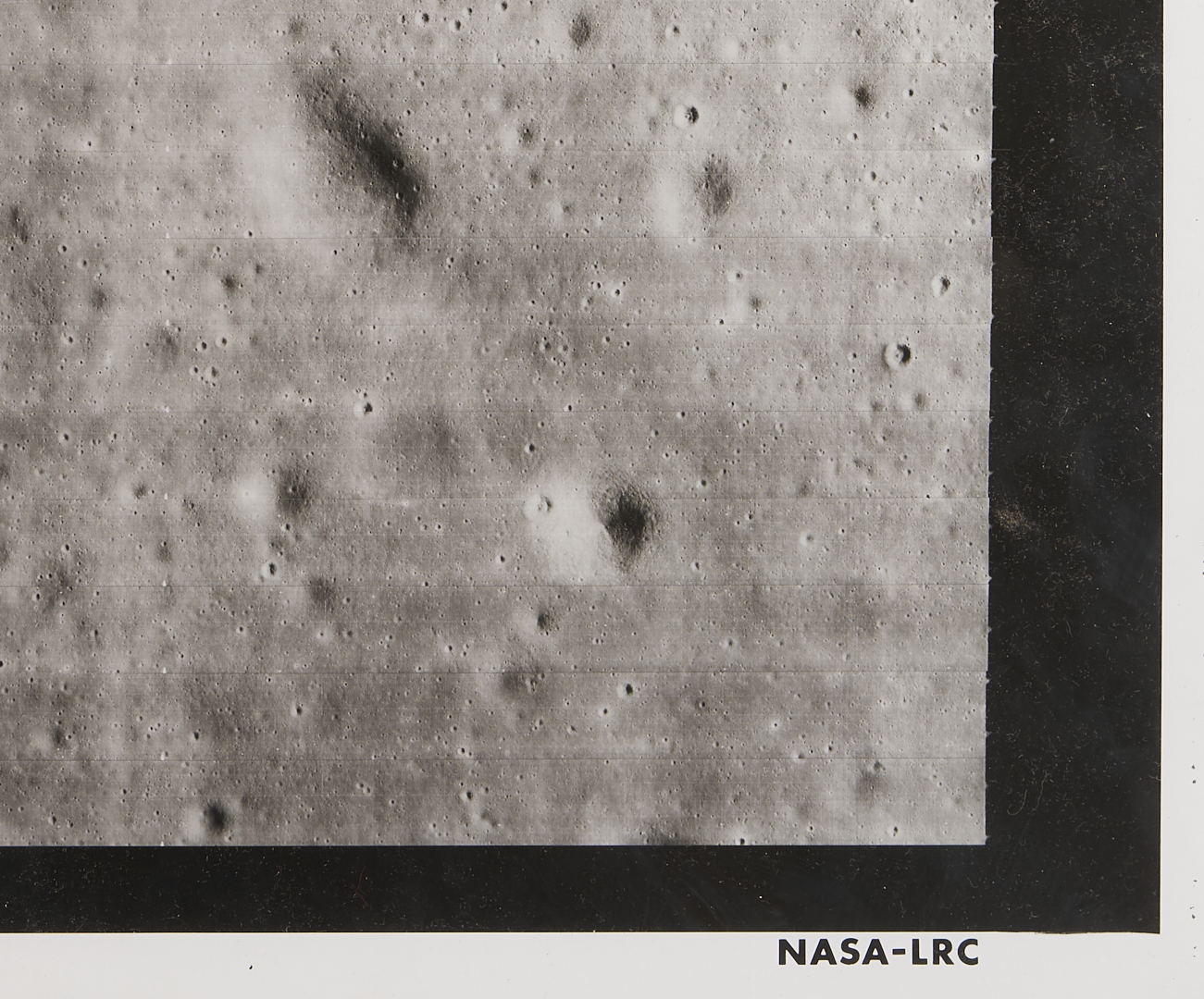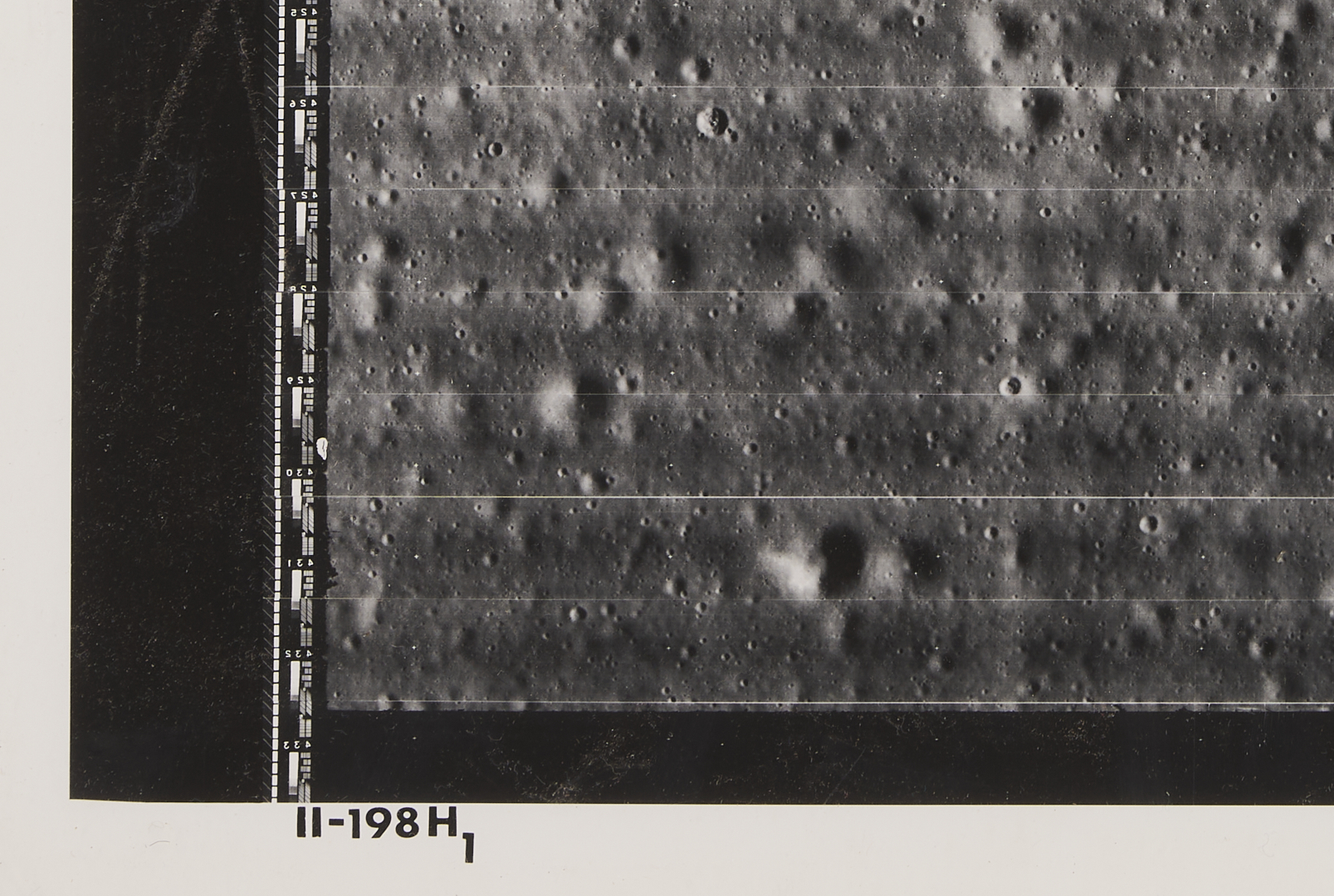 Four (4) original large-format vintage gelatin silver prints on matte paper from NASA’s Second Lunar Orbiter mission, launch date November 6, 1966. The photographs are designated II-179M, II-198H1, II-198H2, and II-198H3 lower left. A total of 215 sets of photographs were planned for the second orbiter mission in 1966, each consisting of one medium-resolution image and three high-resolution images of the same area. The three 198H (High Resolution) images show closeups of the area southeast of the Maestlin G crater, which was eventually designated as Landing Site 5 for the Apollo 11 and 12 missions, a backup site should the need arise. Also included is image 177H2, a view of the plains approximately 20 km west of Gambart J crater. Unframed. Sheets measure 24″ H x 20″ W.