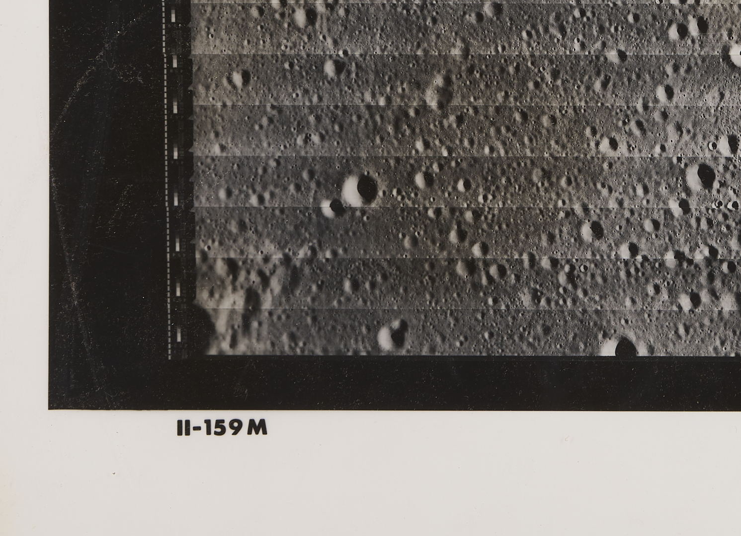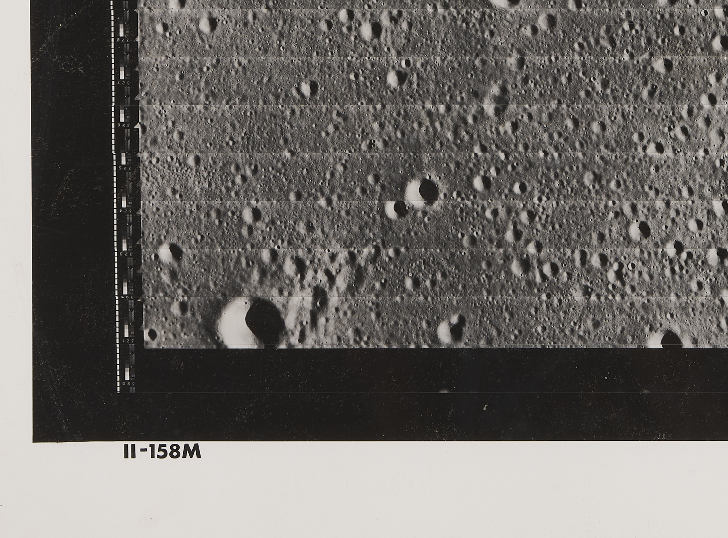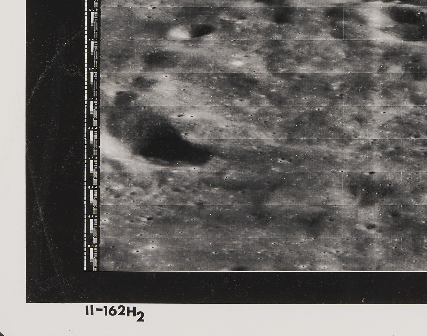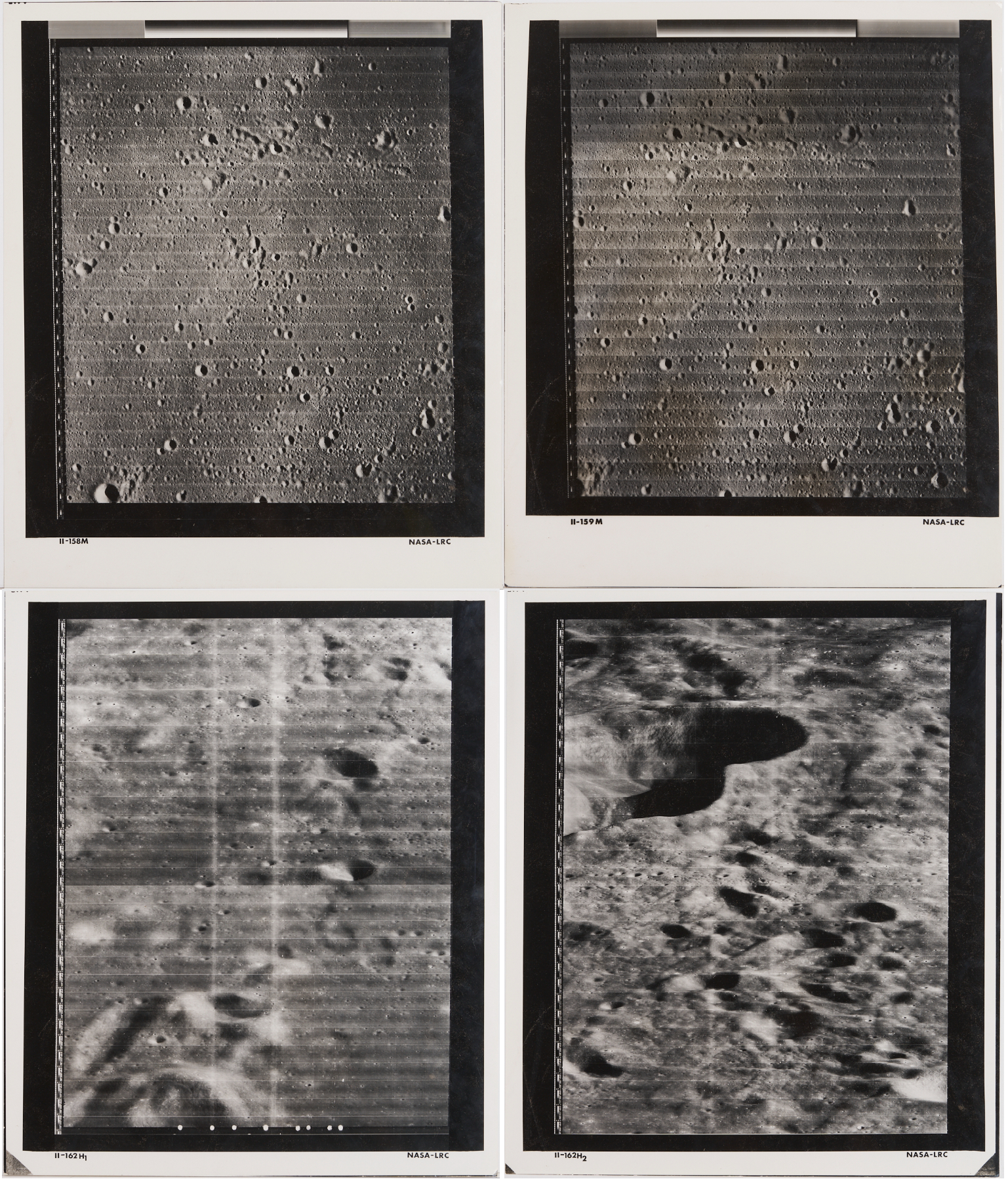 Four (4) original large-format vintage gelatin silver prints on matte paper from NASA’s Second Lunar Orbiter mission, launch date November 6, 1966. The photographs are designated II-158M, II-159M, II-162H1, and II-162H2 lower left. A total of 215 sets of photographs were planned for the second orbiter mission in 1966, each consisting of one medium-resolution image and three high-resolution images of the same area. Images 158M and 159M feature the lunar plains approximately 100 km West of Reinhold Crater. Images 162H1 and 162H2 show a low, oblique angled view of the binary craters of Fauth and Fauth A, and the plains surrounding them, looking Northward. Unframed. Sheets measure 24″ H x 20″ W.