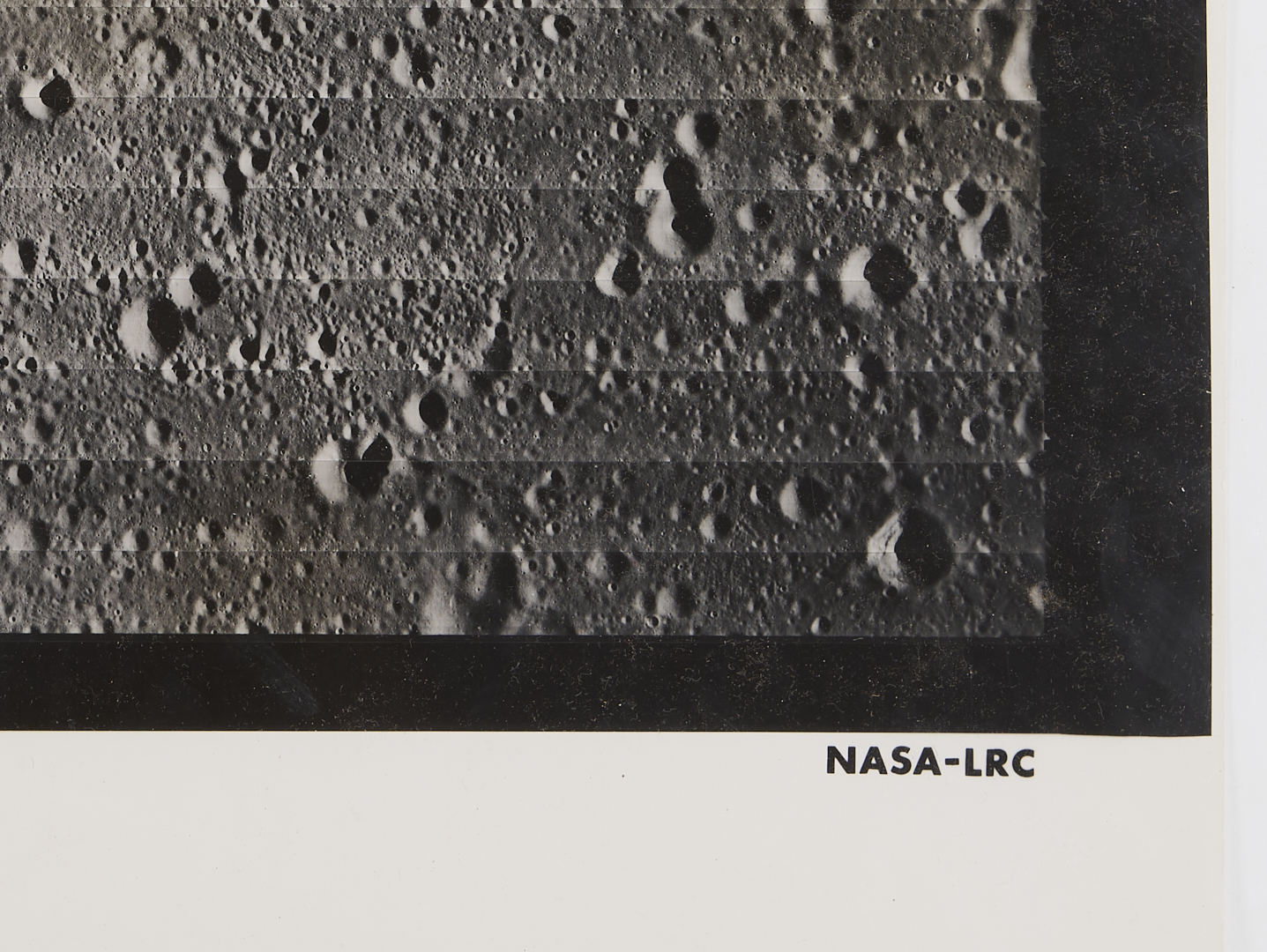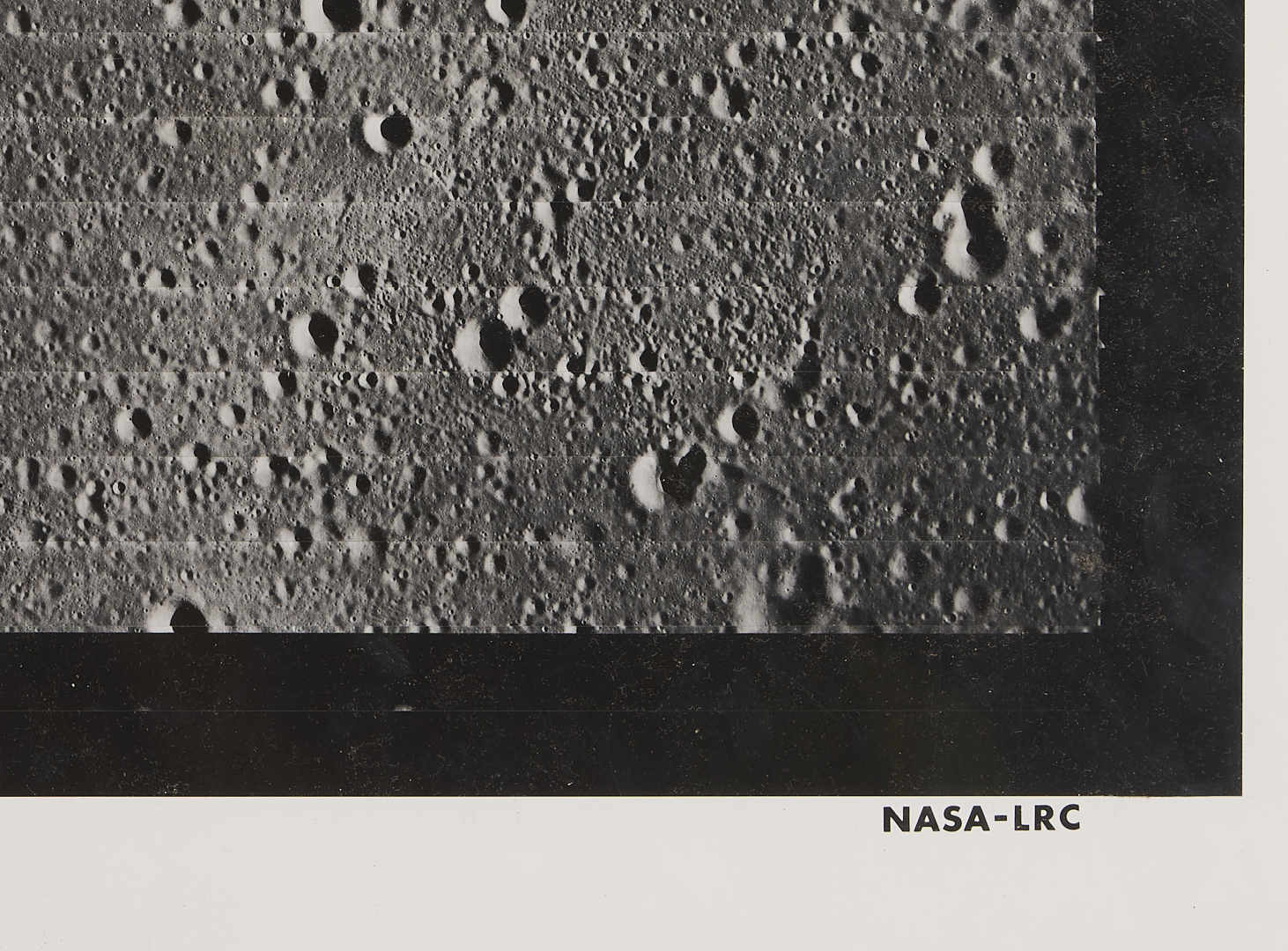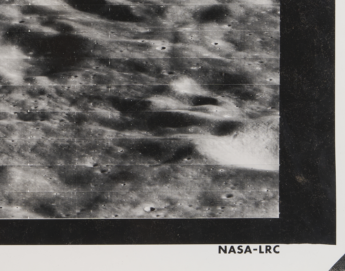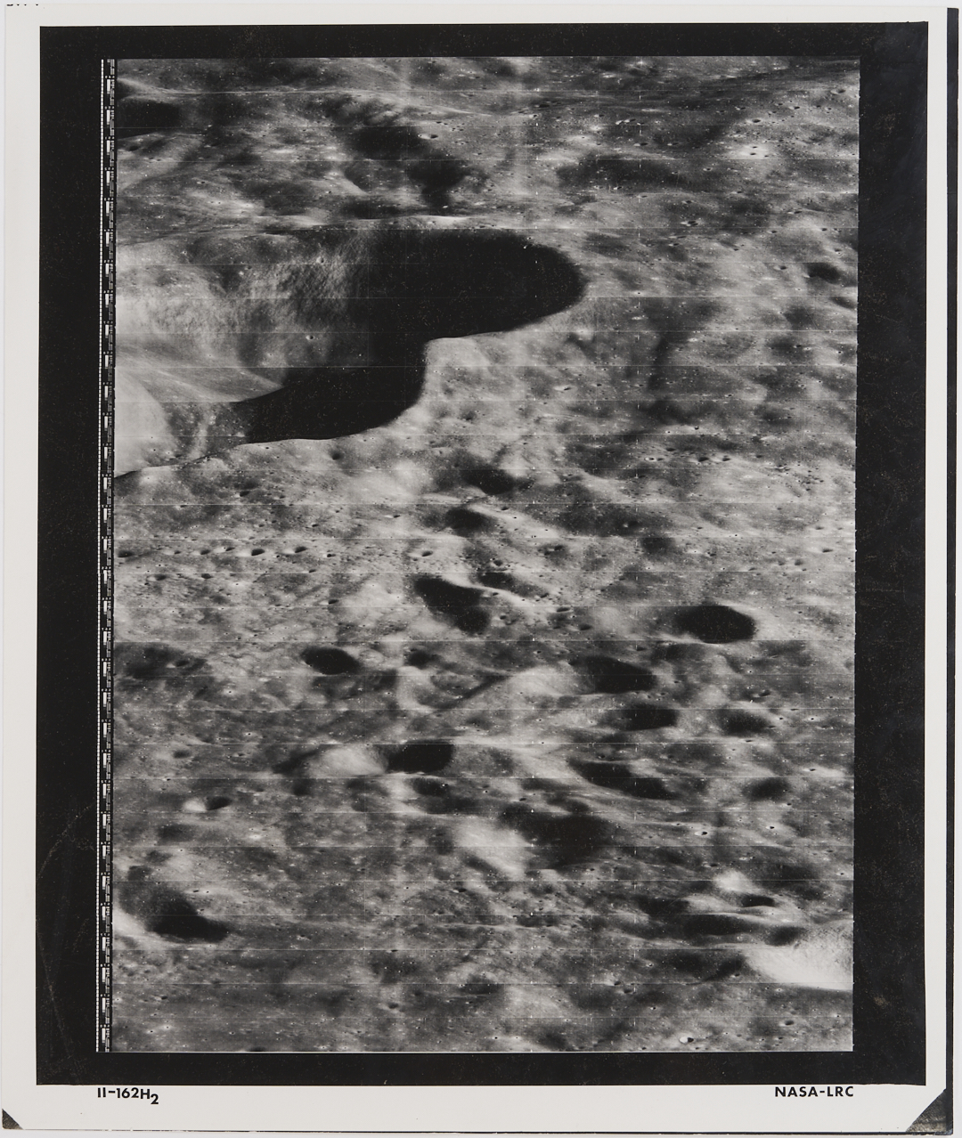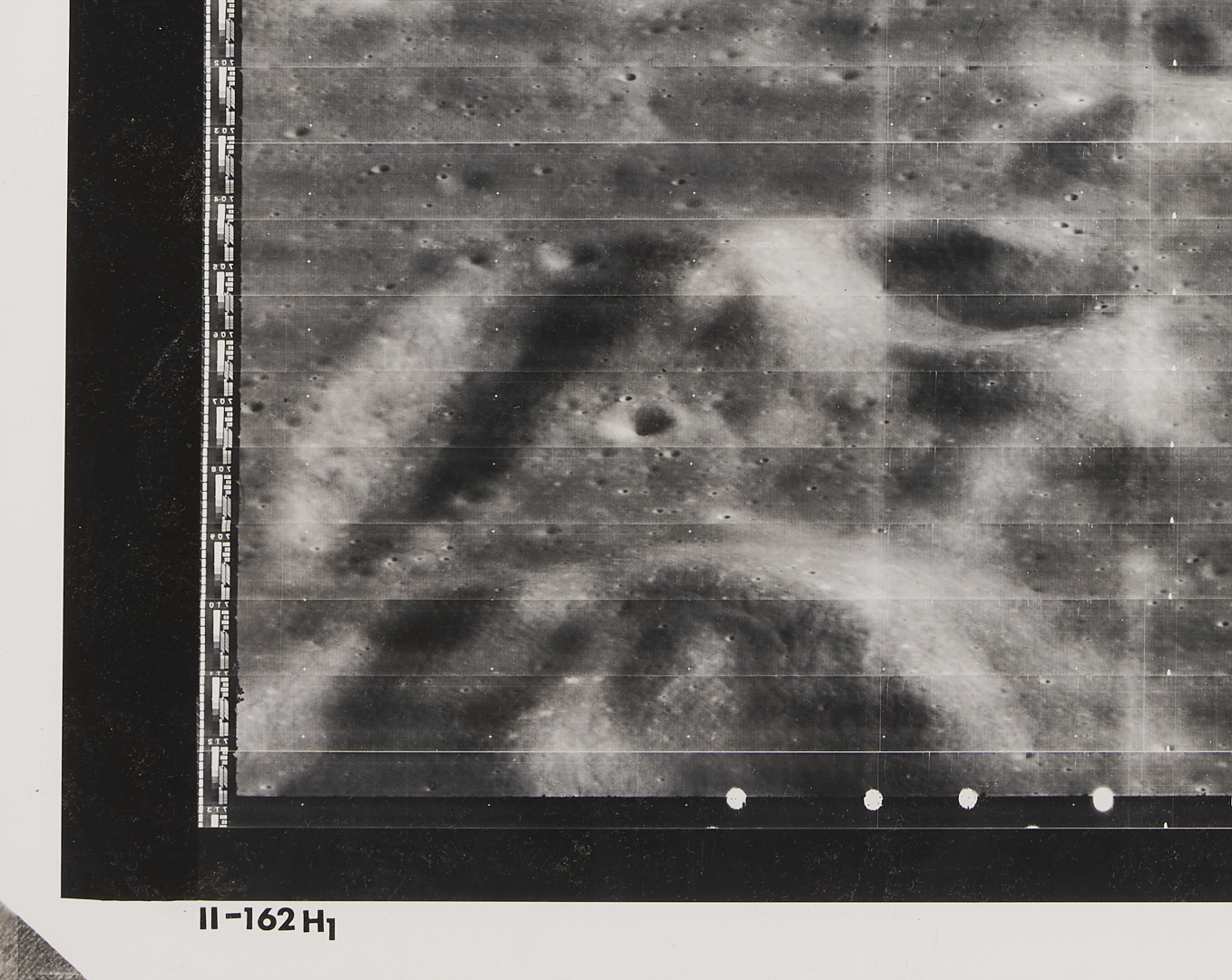 Four (4) original large-format vintage gelatin silver prints on matte paper from NASA’s Second Lunar Orbiter mission, launch date November 6, 1966. The photographs are designated II-158M, II-159M, II-162H1, and II-162H2 lower left. A total of 215 sets of photographs were planned for the second orbiter mission in 1966, each consisting of one medium-resolution image and three high-resolution images of the same area. Images 158M and 159M feature the lunar plains approximately 100 km West of Reinhold Crater. Images 162H1 and 162H2 show a low, oblique angled view of the binary craters of Fauth and Fauth A, and the plains surrounding them, looking Northward. Unframed. Sheets measure 24″ H x 20″ W.