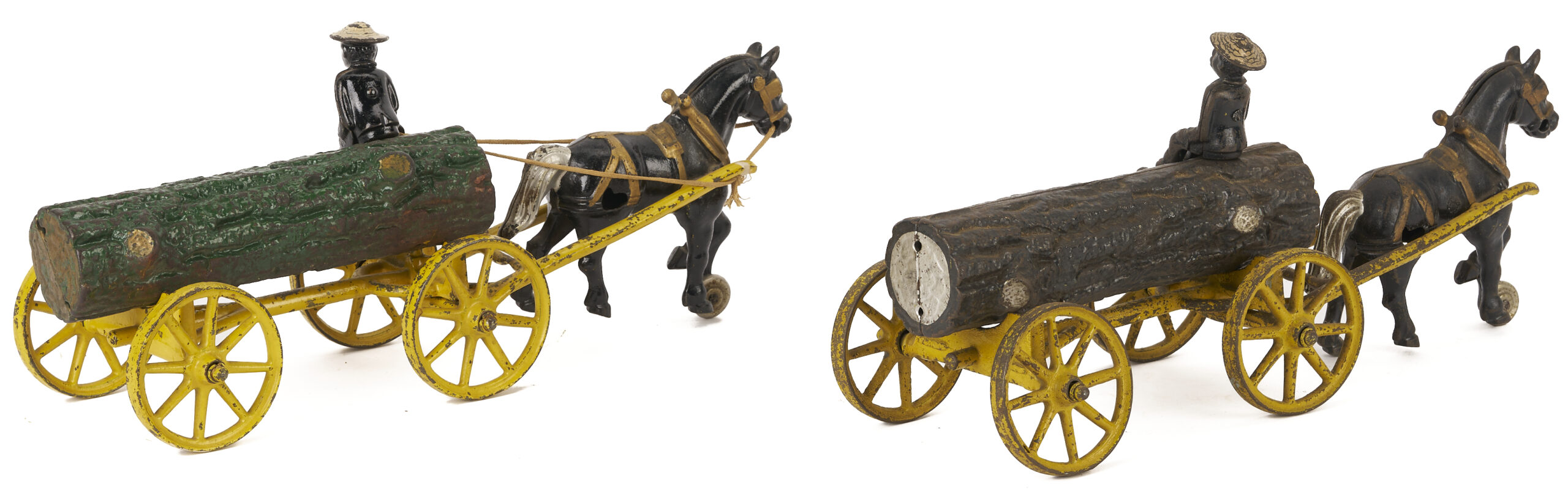 Four painted cast and pressed steel toys with horses and drivers, including two (2) Kenton Toys horse-drawn log wagons with an African American male rider and two (2) Hubley stake wagons, both with African American drivers, including one with a horse and the other with a mule. Ranging in size from 5 3/4 in. H x 10 1/2 in. L to 6 in. H x 14 1/4 in. L. All items, Early 20th century.