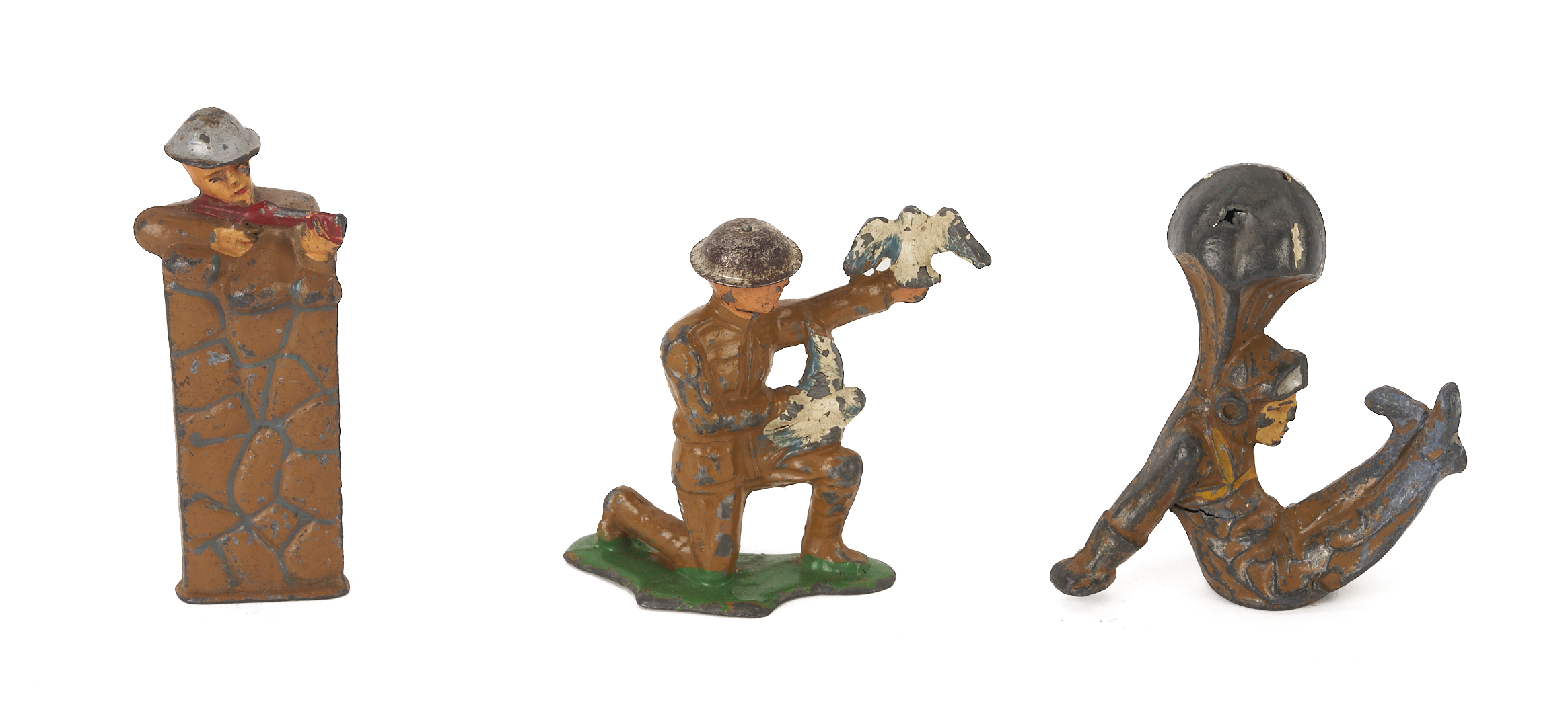 Fifty eight (58) Barclay Manoil painted lead WWI soldiers and one (1) tent, including various military figures with weapons, artillery weapons, radios, bicycles, stretchers and hospital workers, parachuters, pigeon carriers, and small vehicles. All items, excluding the tent, are cast metal. Most Items marked BARCLAY or MANOIL and MADE USA as well as being numbered; some unmarked. ALL range in size from 4 ½” H X 2.5” W to 2 ½”H X 2 ½”W; with the tent being 5 ½”H X 9”W.