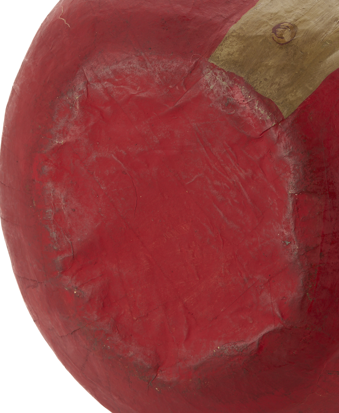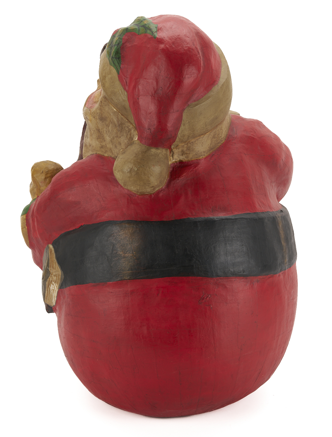 Large vintage papier-mache Santa Claus hand-painted Christmas “roly poly” figure. Santa Claus smiles and raises a pipe with his right hand while in his left arm he holds toys and gifts that include a doll, horse, watch, and book. He wears his signature red suit and has a sprig of holly on his hat. Depicted in half-length, with a rounded lower half. After Thomas Nast’s 1881 illustration for Harper’s Weekly. 24 1/2 in. H x 17 in. W x 15 in. D. First half of the 20th century.