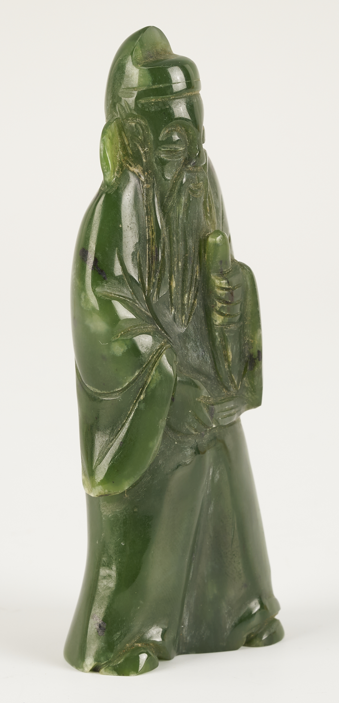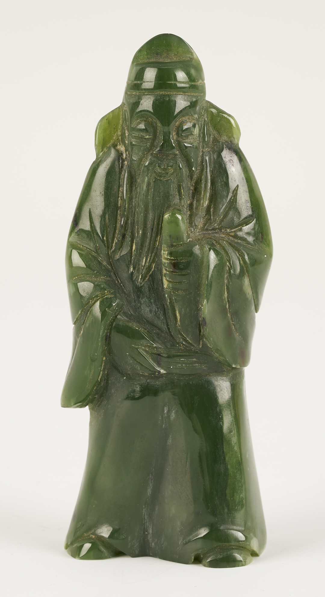 Three (3) small Chinese carved figural objects or netsukes, including one (1) green jadeite Immortal figure, 4 in. H; one (1) gray and white jadeite figure of a boy on a water buffalo, 2 in. H; and one (1) celadon hardstone carving of two fruits, 2 in. H. 20th century.