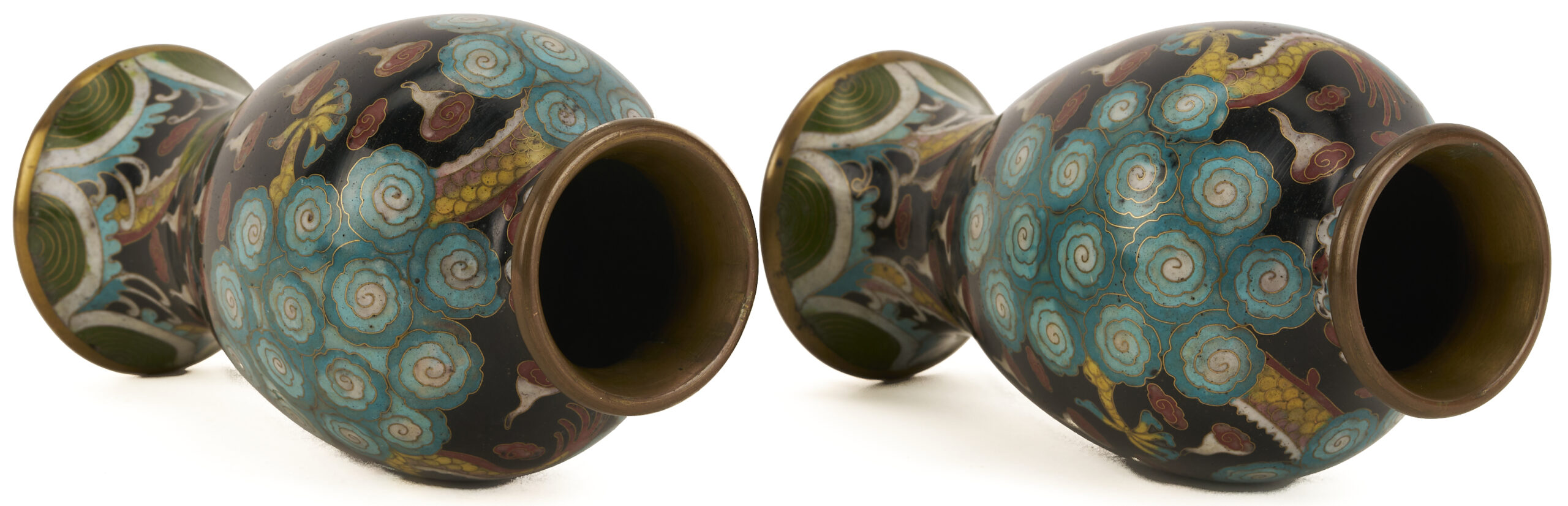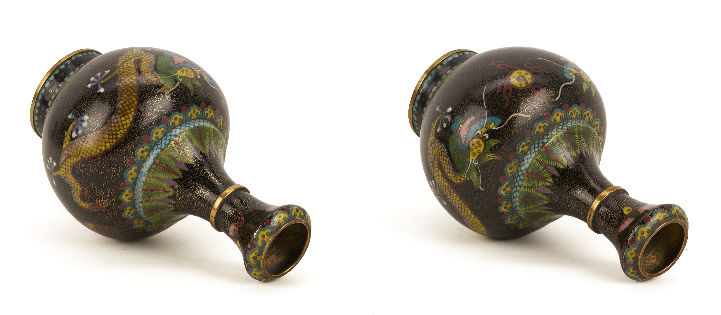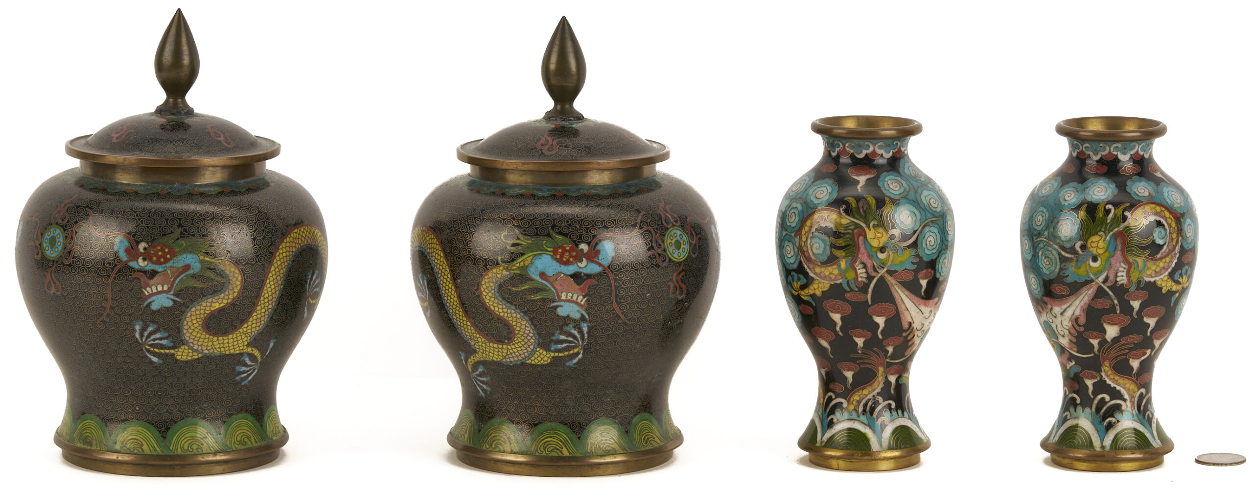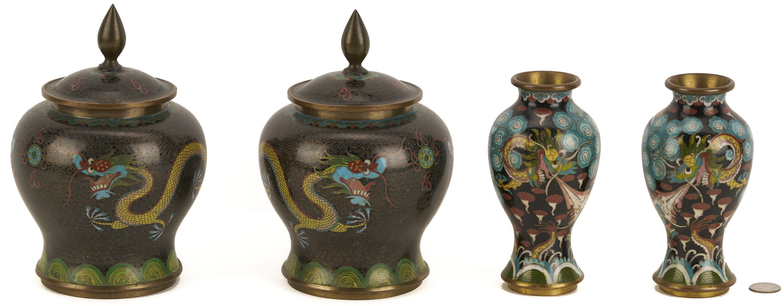 1st-4th items: Four (4) Chinese black ground Cloisonne vases with dragon decoration, including a pair of “Magic Fungi” vases with blue flowers and assorted red-capped mushrooms, 6 1/2 in. H.; and two wide ginger jar forms with covers, 8 1/2 in. H including tops. Early to mid-20th century. 5th-8th items: Four (4) Chinese black ground cloisonne vases with dragon decoration, including a pair of garlic head vases, 8 1/4 in. H., and two double gourd form vases, measuring 12 1/2 in. H and 6 3/4 in. H. Early to mid 20th century.
