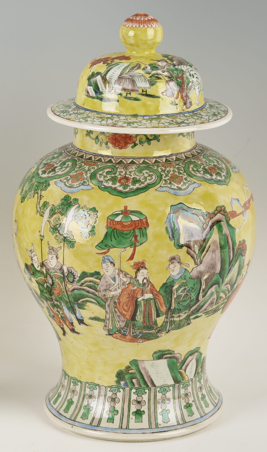 Pair of Chinese yellow ground Famille Rose ginger jars and covers, baluster form decorated with Mandarin figures in a landscape setting. 18 3/4 in. H x 10 in. Diameter. Early 20th century.