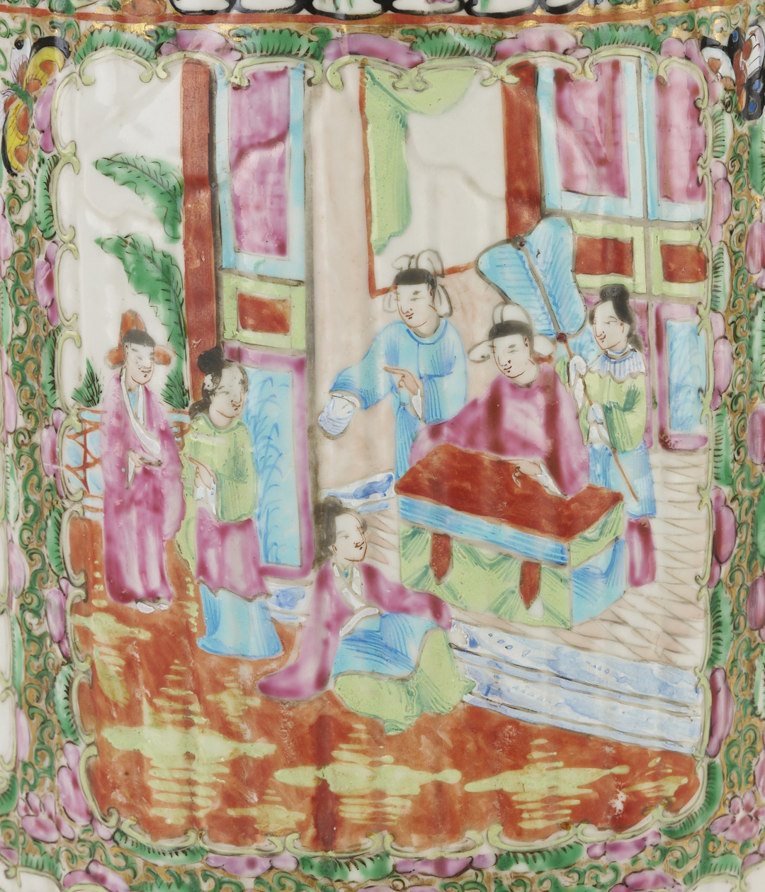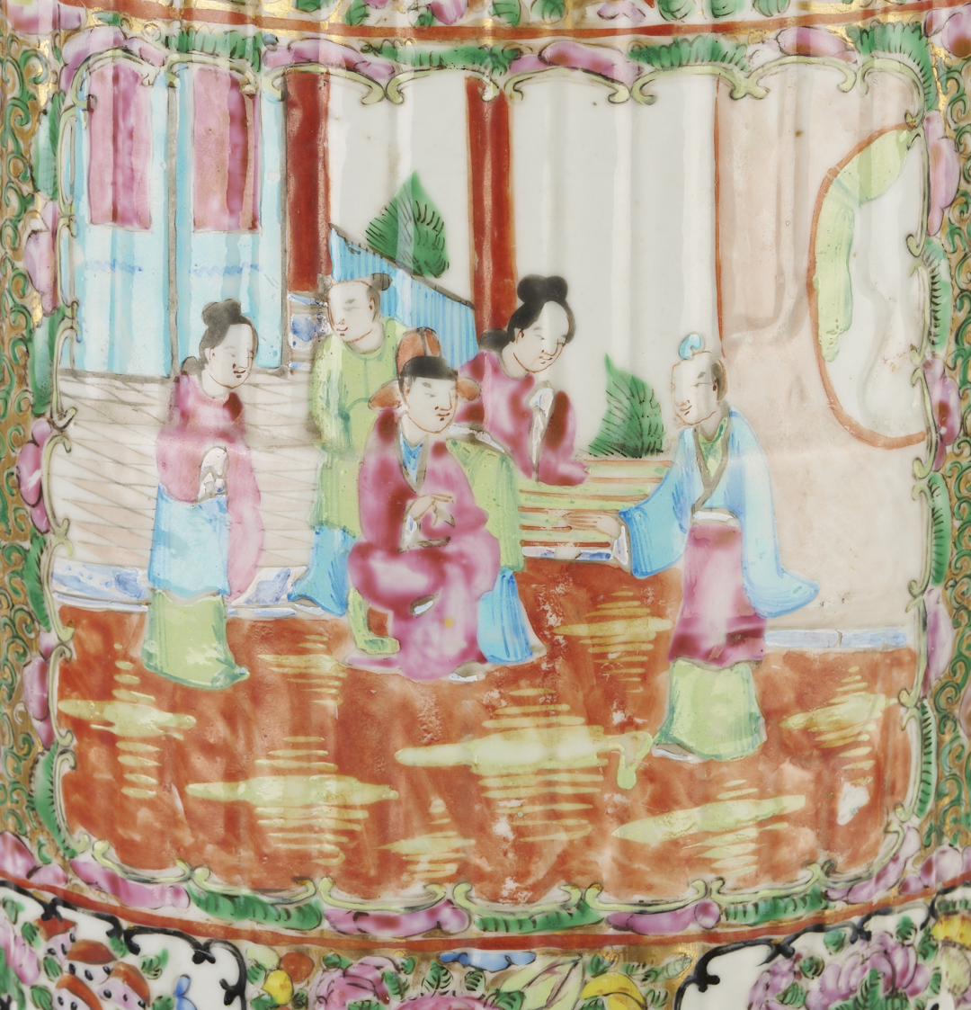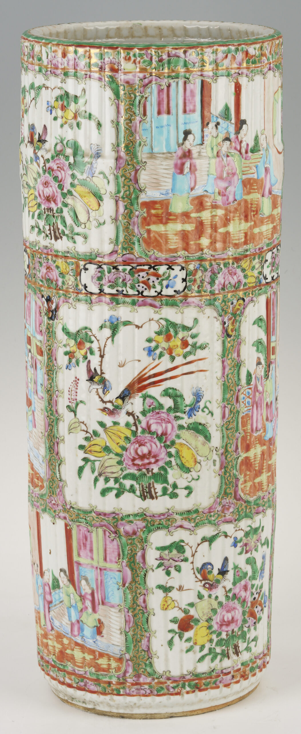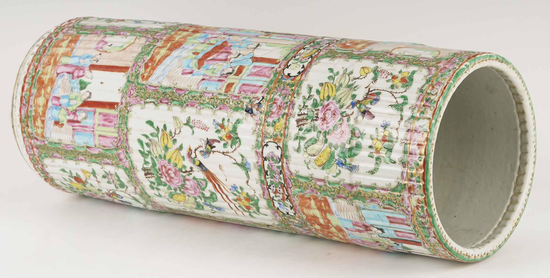 Chinese Export Rose Medallion porcelain umbrella stand with fluted sides having alternating vignette decorations of figures in court settings, flowers, leaves, fruit, birds, and insect designs. 24 1/8 in. H x 9 1/8 in. dia. Late 19th century.