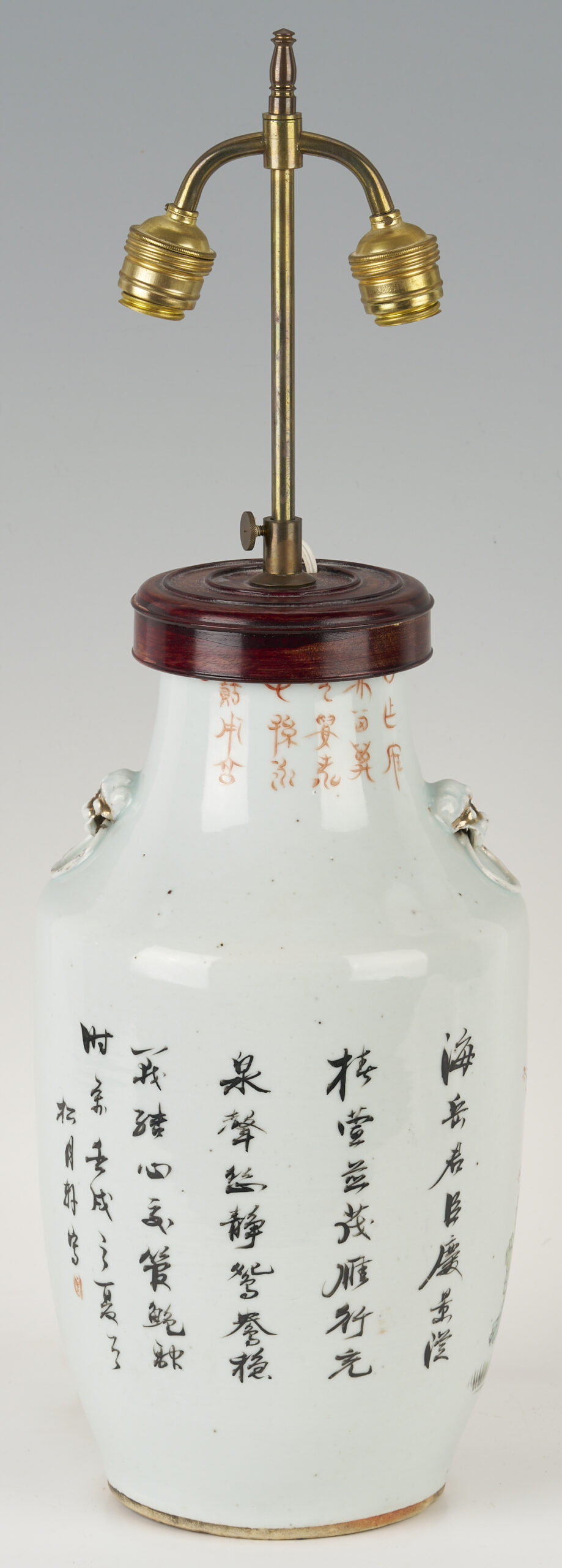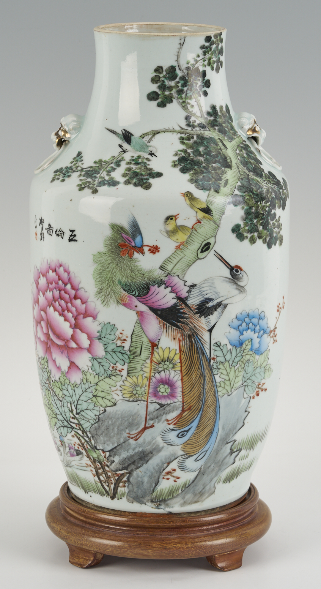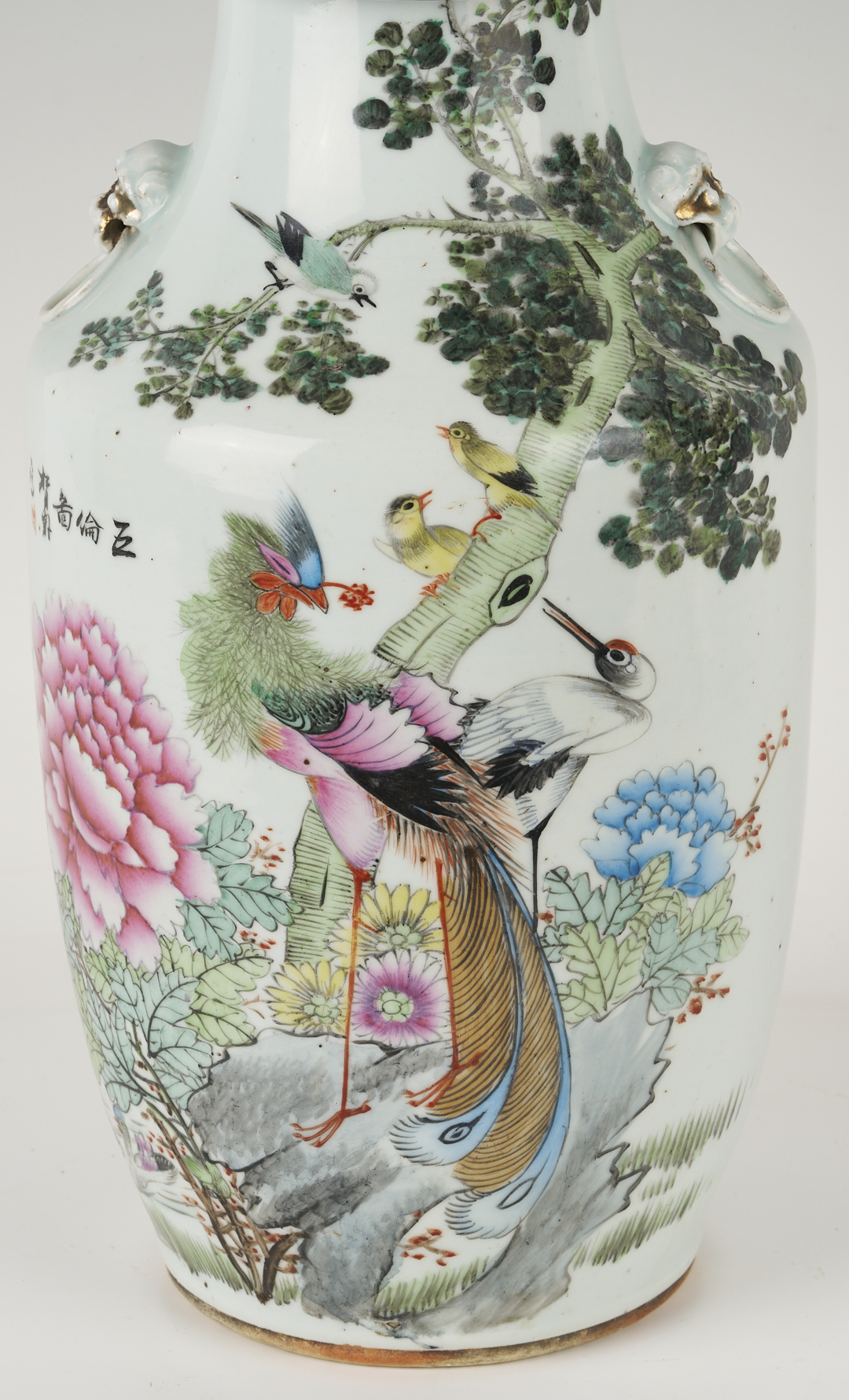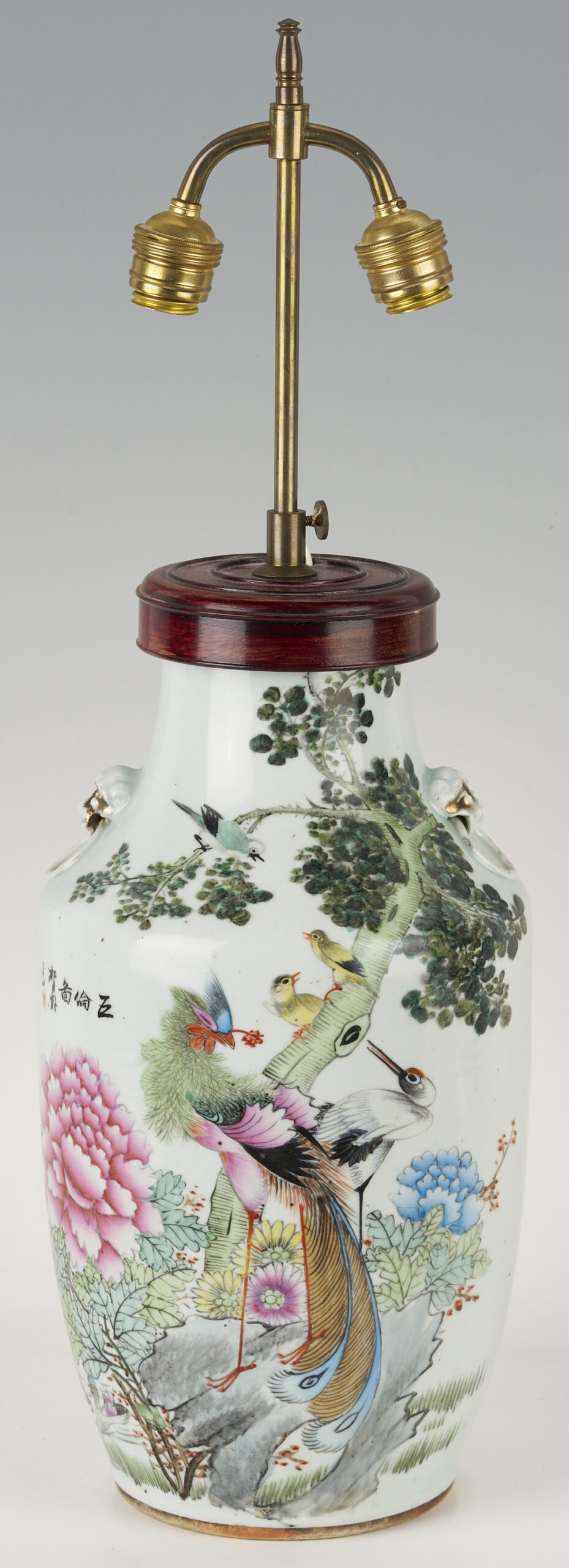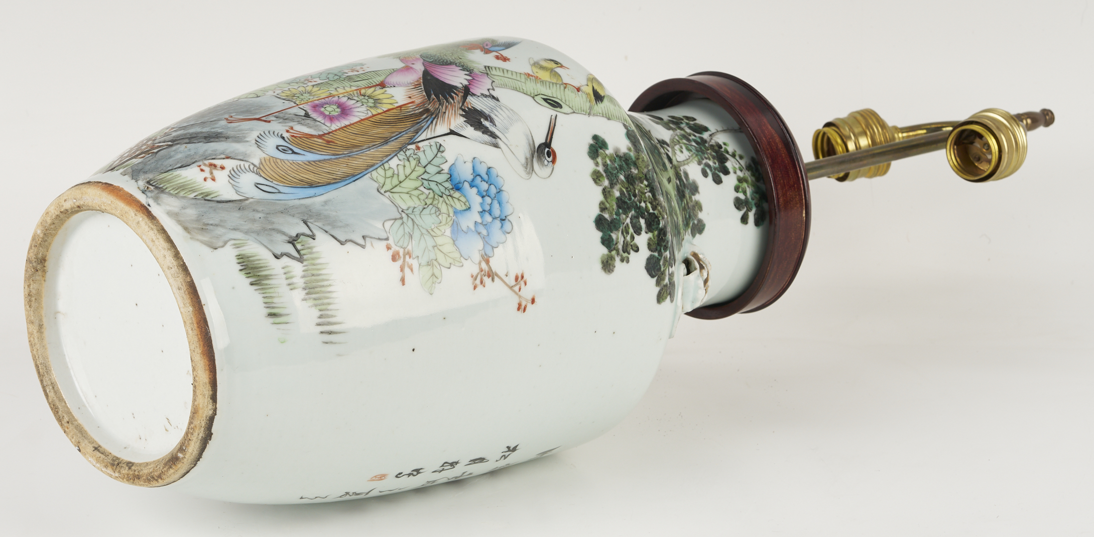 Chinese Famille Rose Porcelain Vase, now mounted as a lamp, decorated with Phoenix and Crane in a landscape setting with peony and other flowers, with calligraphy poem to reverse. Vase height: 14 1/2 in H. (15 1/2 in. with wooden base, not shown). Overall: 24 1/ 2 in. Diameter 8 1/2 in. Accompanied by a certificate of antiquity dated 1984 from Paul Tsui Enterprises, Hong King, stating the vase dates from the Qing Dynasty and is over 100 years old.