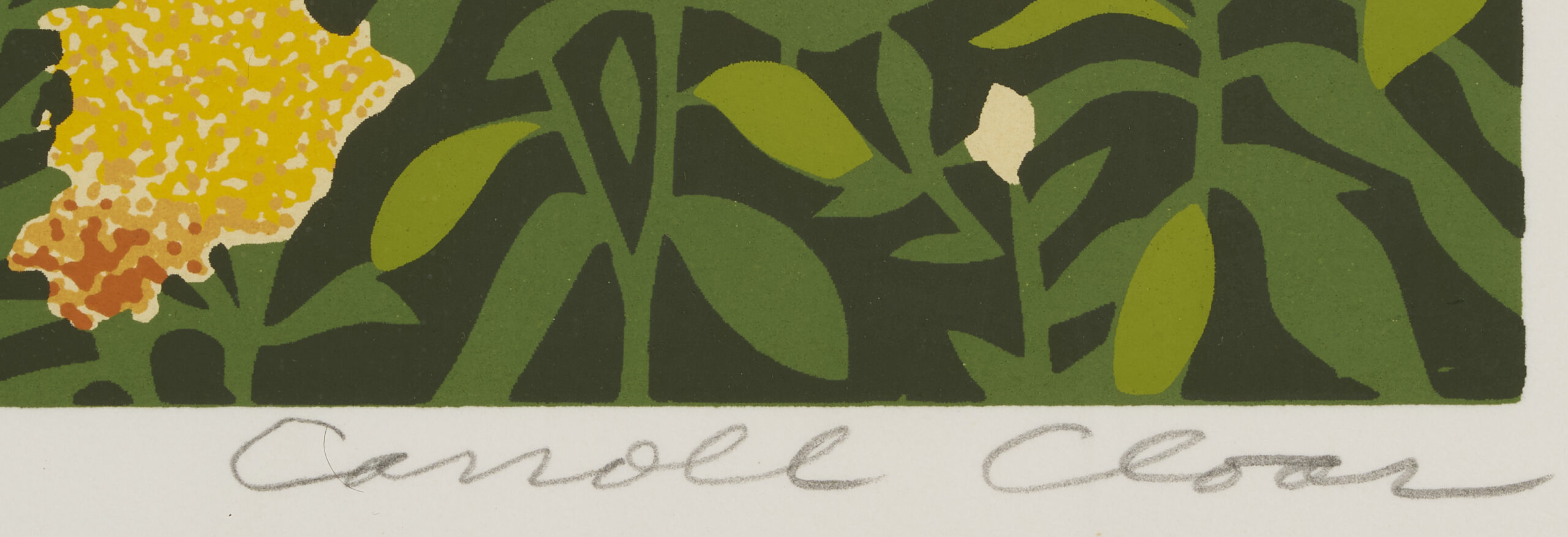 Carroll Cloar (Tennessee, 1913-1993) pencil signed screenprint, “Panther Bourne.” Six panthers stand or lie in a field of tall grass while colorful flowers bloom in the foreground. After the artist’s 1969 painting of the same name. Signed in pencil lower right and editioned “A/C” (possibly indicating one of three proofs) lower left. Outside the numbered edition of 450. Housed under acrylic in a wooden parcel gilt frame. Sight: 24 in. H x 31 1/2 in. W. Framed: 26 in. H x 33 2/4 in. W. Second half of 20th century.