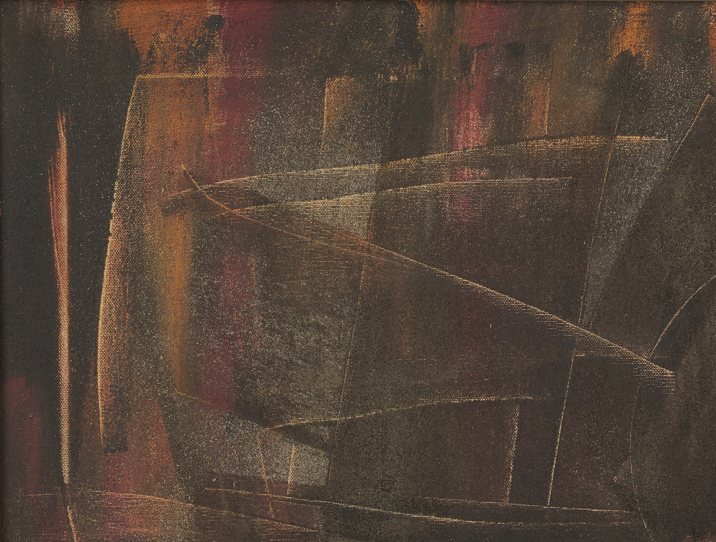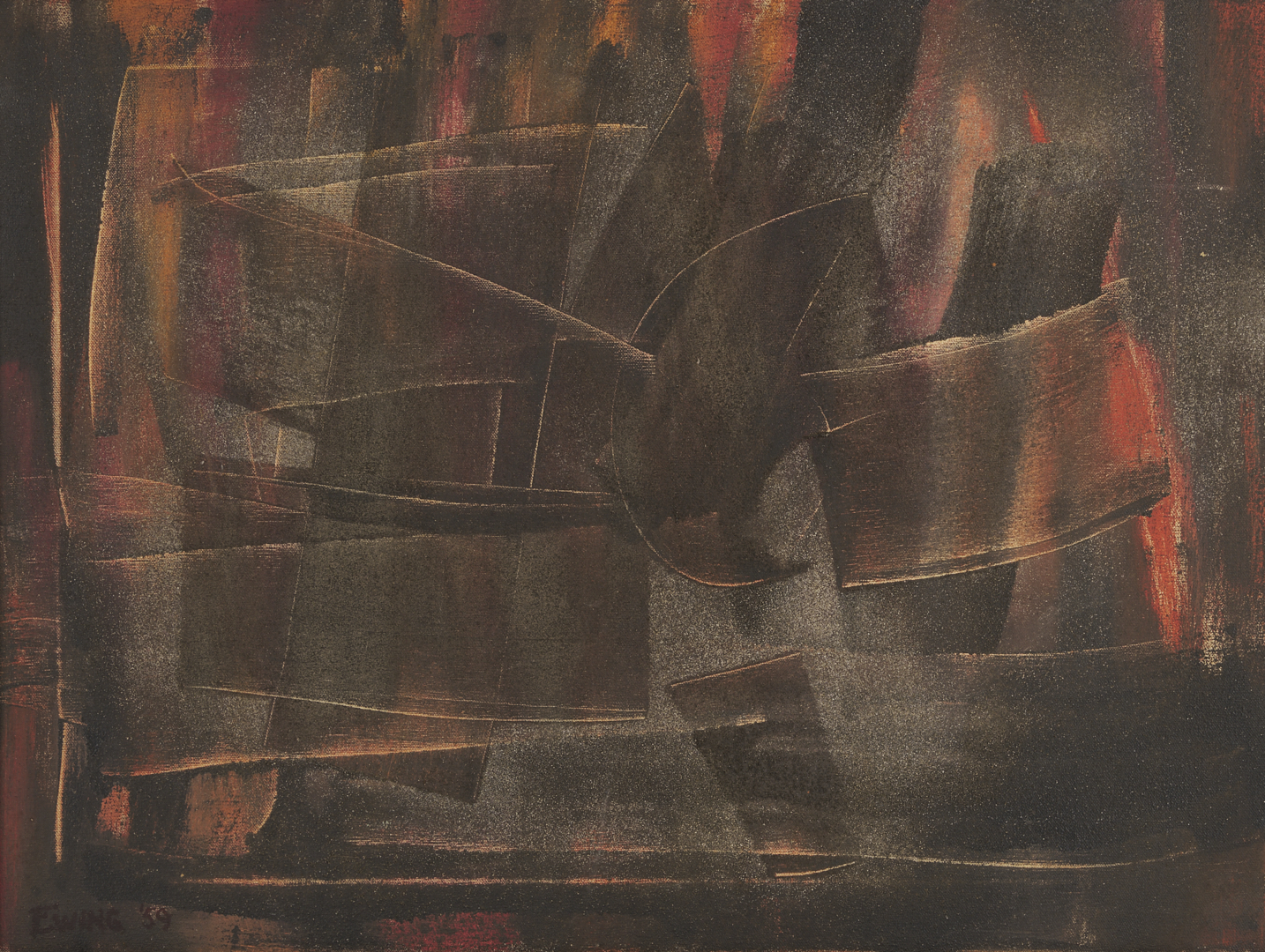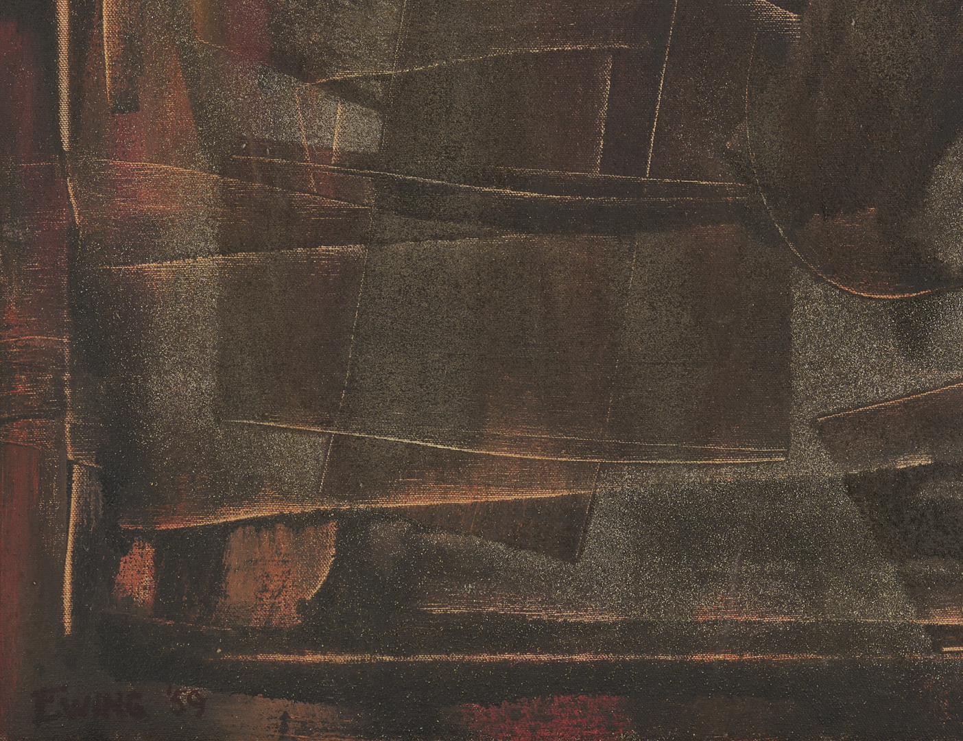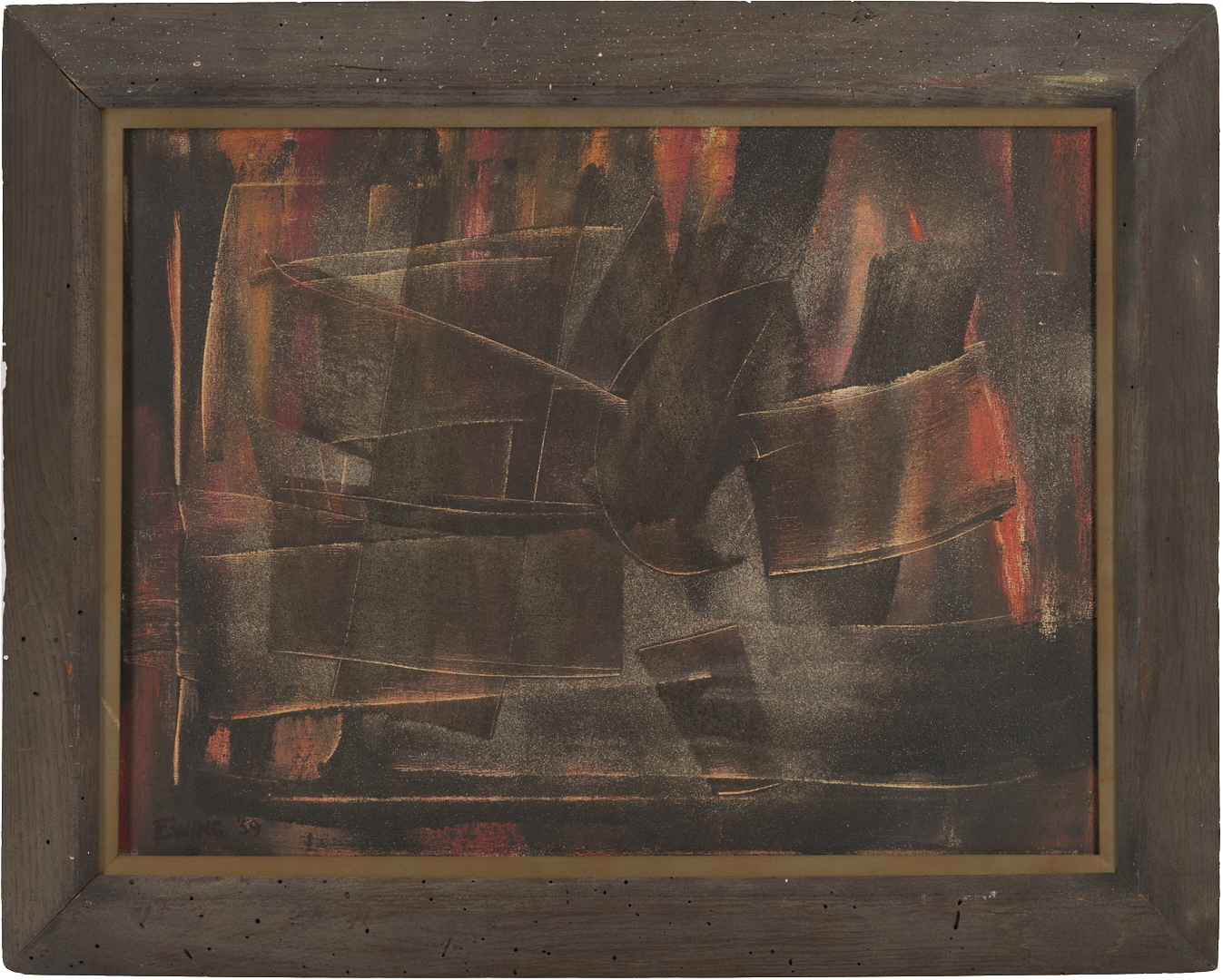 Charles Kermit “Buck” Ewing (Tennessee, 1910-1976) oil on canvas abstract painting rendered in muted earth tones and housed in the original beveled wood frame with gilt wood liner. Additionally signed and dated in marker en verso. Sight: 17 1/2 in. H x 23 1/2 in. W. Framed: 23 3/4 in. H x 29 3/4 in. W.