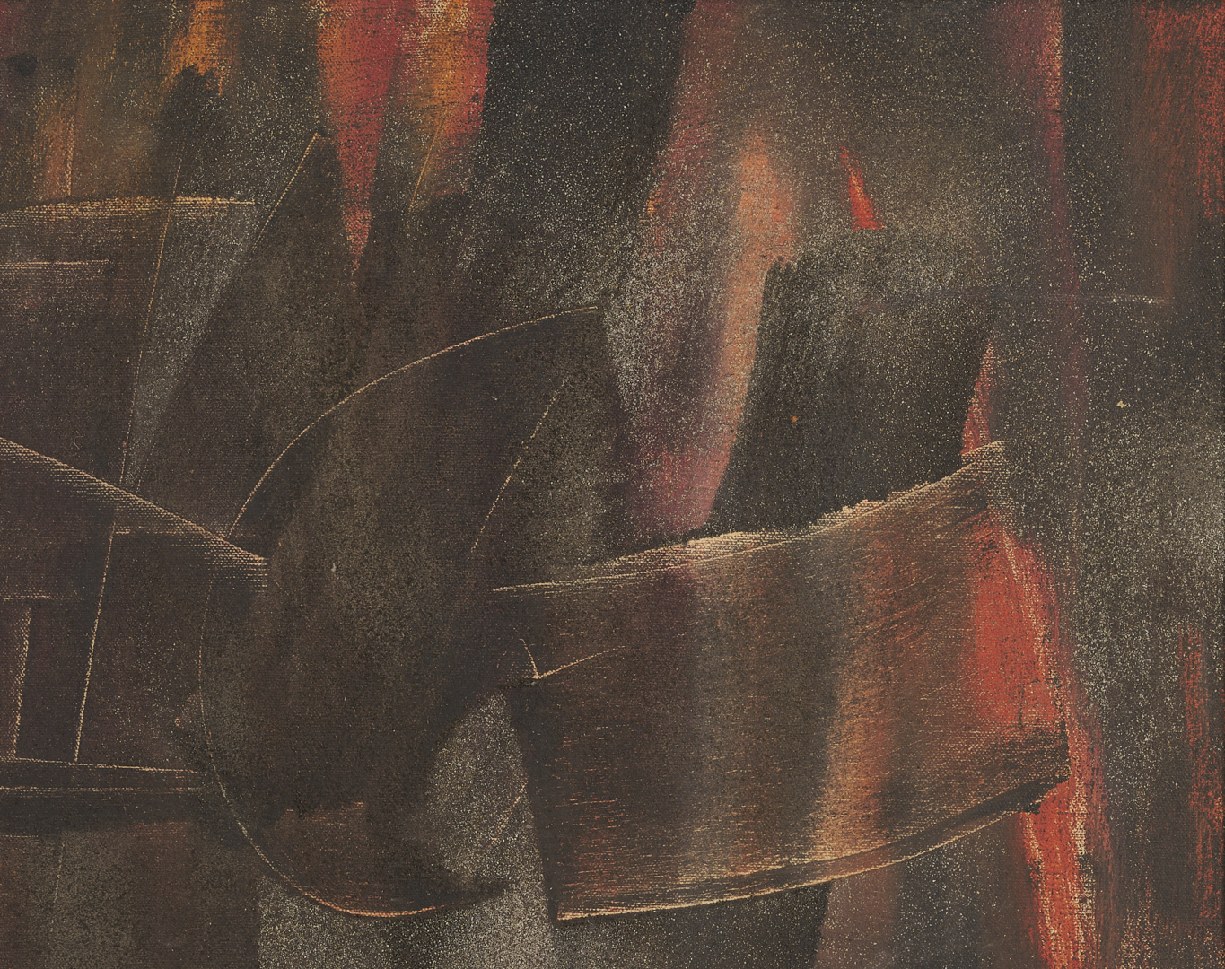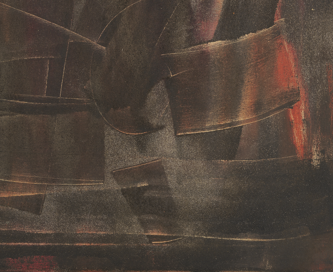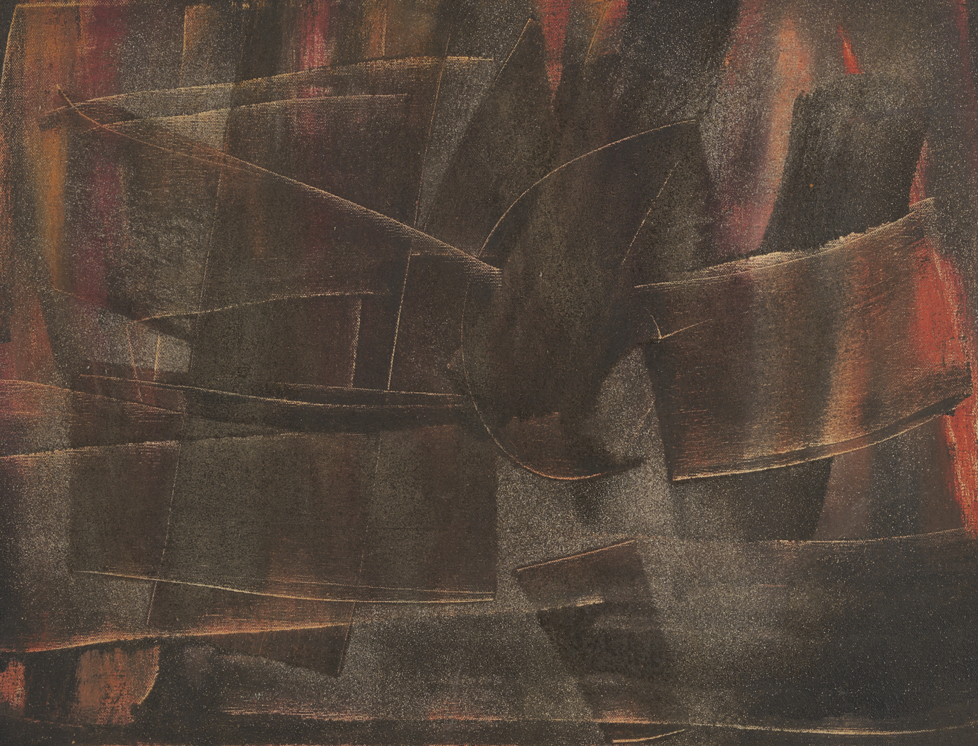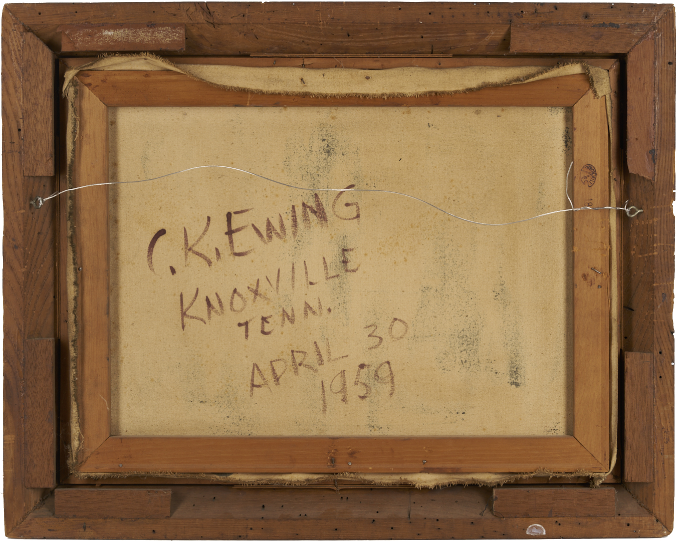Charles Kermit “Buck” Ewing (Tennessee, 1910-1976) oil on canvas abstract painting rendered in muted earth tones and housed in the original beveled wood frame with gilt wood liner. Additionally signed and dated in marker en verso. Sight: 17 1/2 in. H x 23 1/2 in. W. Framed: 23 3/4 in. H x 29 3/4 in. W.