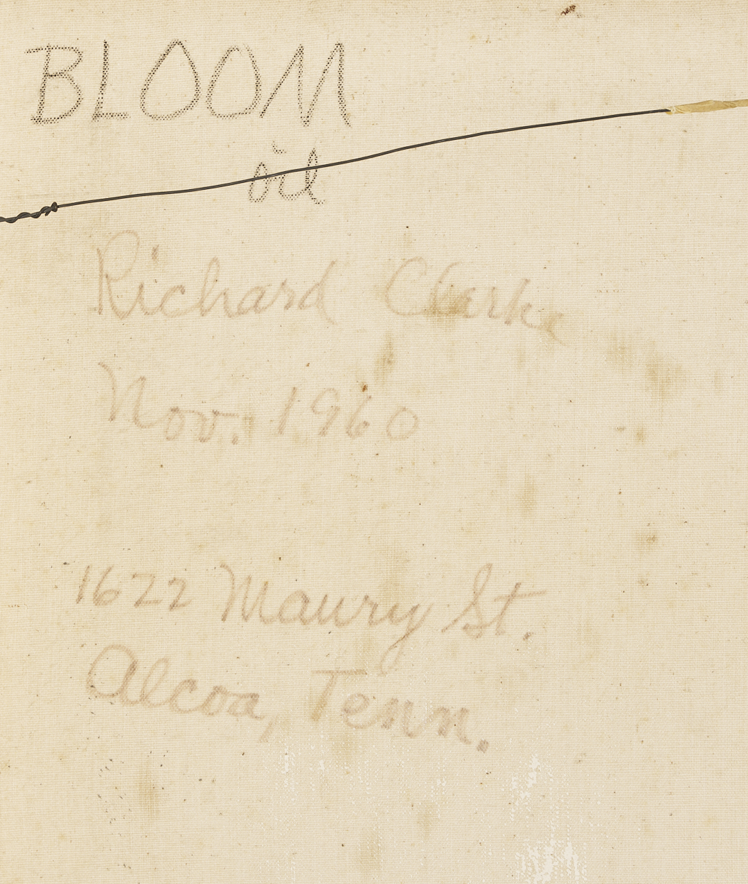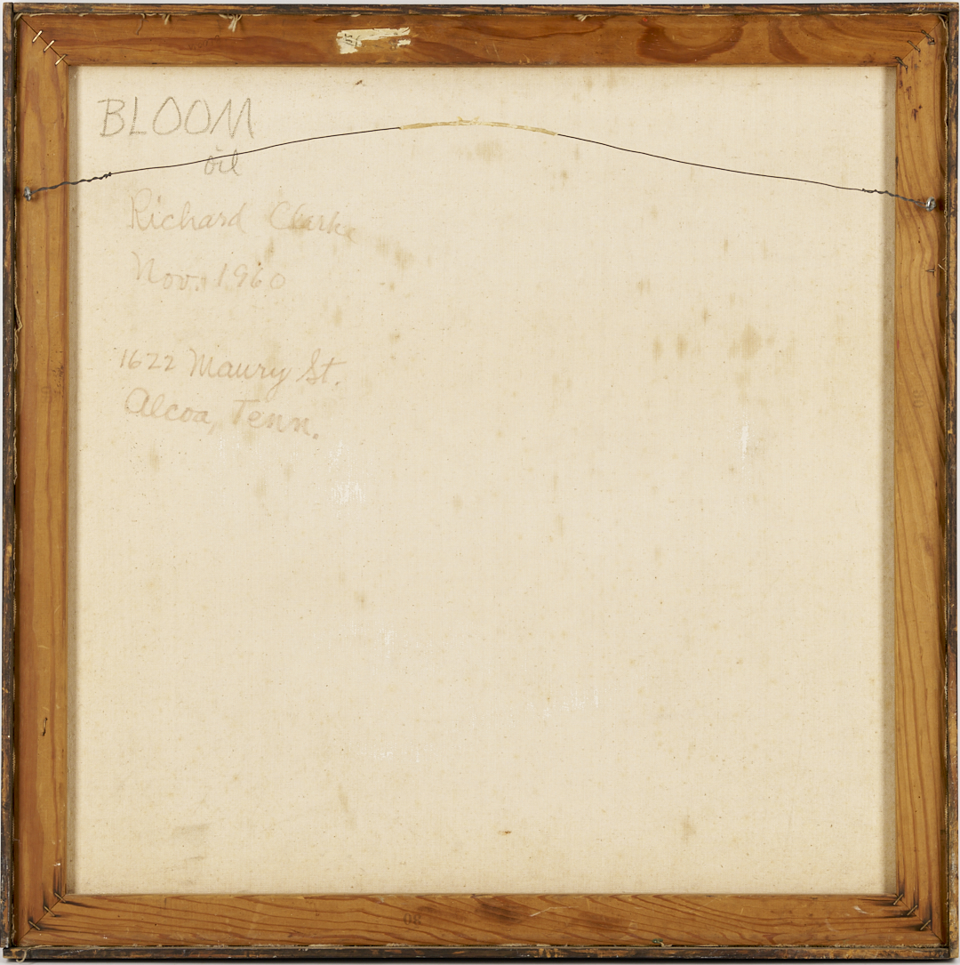 Richard Clarke (American/Tennessee,1923-1997) oil on canvas abstract expressionist painting, “Bloom”. A vivid, gestural composition with passages of heavy impasto — including paint applied directly from the tube — is set against a dark background and suggests the form of a bouquet of flowers. Signed and dated “Clarke 60,” lower right. With title and additional signature and date to verso along with text “1622 Maury St. / Alcoa, Tenn.” Housed in a simple ebonized wood frame. Sight: 30 in. x 30 in. Frame: 30 3/4 in. x 30 3/4 in. 1960. Biographical Note: Richard Clarke was one of the early members of the University of Tennessee’s art faculty. He is often associated with the “Knoxville Seven,” a group of progressive artists connected to the University of Tennessee that included Robert Birdwell, C. Kermit Ewing, Joanna Higgs, Phillip Nichols, Walter H. Stevens and Carl Sublett. He often found inspiration in the natural world around him.