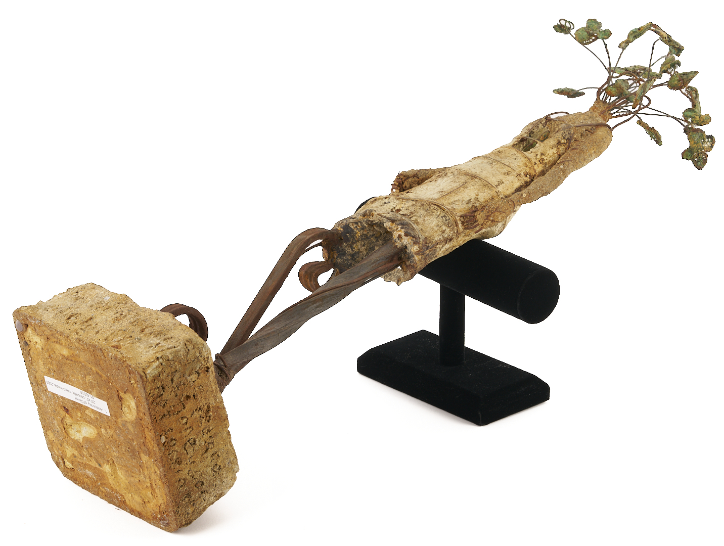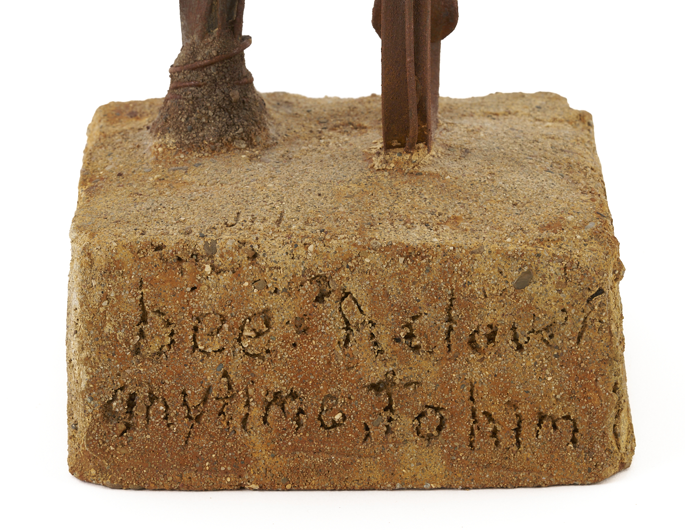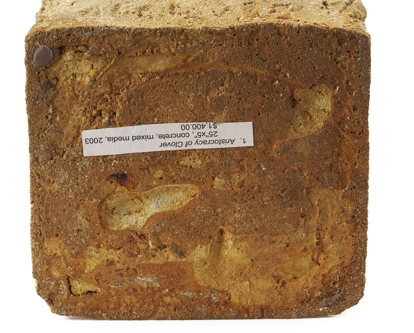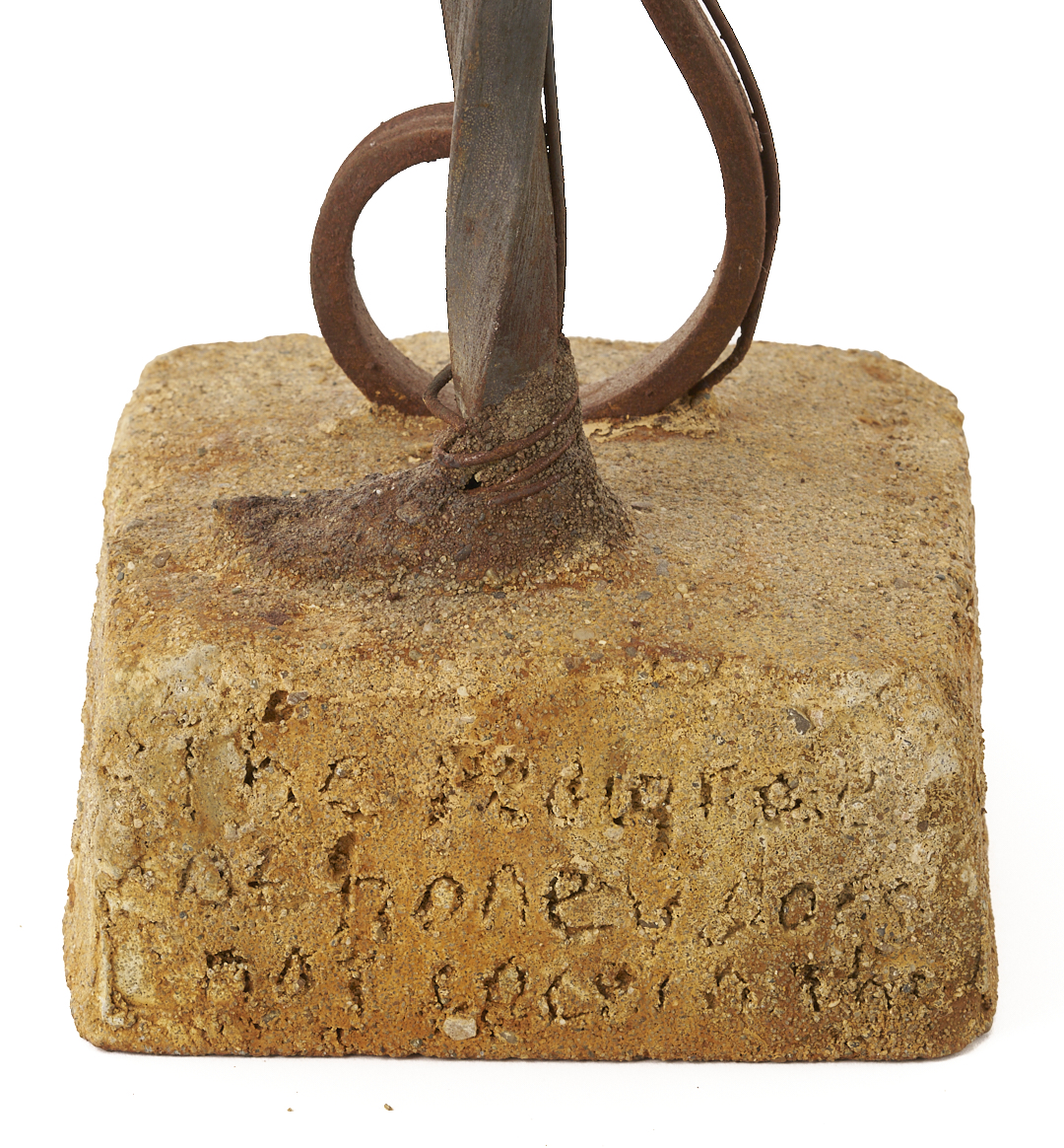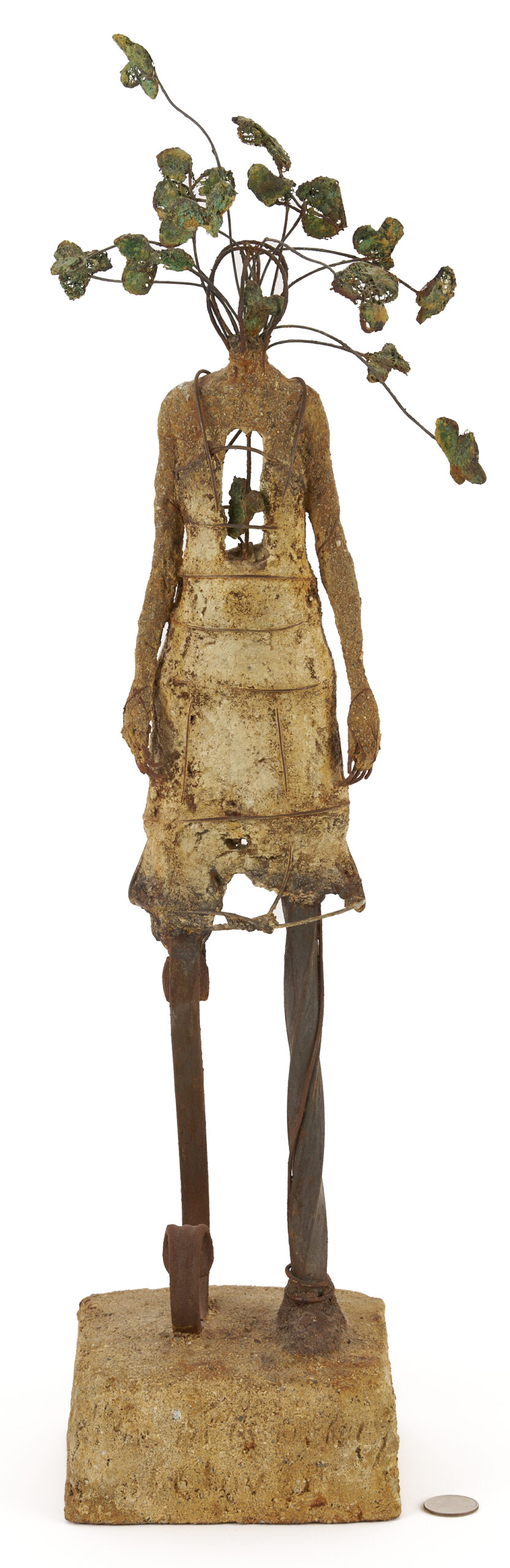 Johan Hagaman (Indiana/TN, b. 1950), “Aristocracy of Clover,” concrete, wire, iron, wax and milk paint sculpture, standing female form with sprigs of clover emanating from her head; one clover is encased behind wire in a cavity in the center of her chest. Incised signature to base along with illegible inscription. 26 in. H x 5 in. square (including base). Note: Johan Hagaman received her B.A. and M.S. in English at Indiana University in Bloomington before settling in Nashville. She has exhibited extensively in TN, NC, CO and CA in solo and group shows. Hagaman’s work is in the collections of Gaylord Opryland Hotel, Tennessee State Museum, Jackson Hole Art Association in Wyoming, Evansville Museum of Art and Sciences in Indiana, Massure Museum of Art in Louisiana, the University of South Florida Museum, and the Genesco Corporate Collection among others. In 2005 she received the Individual Artists Fellowship in Visual Art from the Tennessee Arts Commission. (Source: The Tennessee Arts Commission).