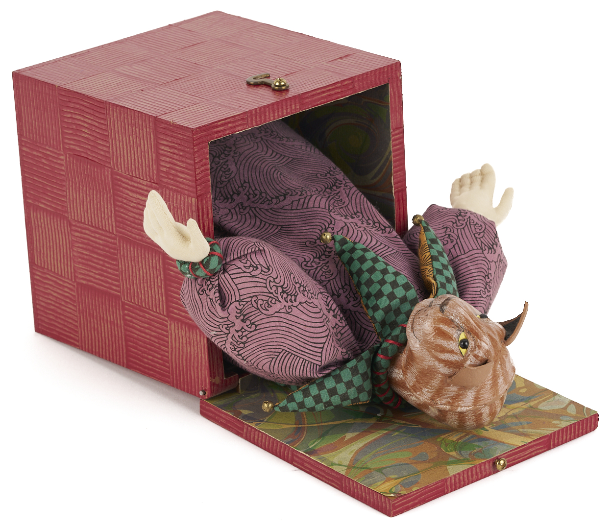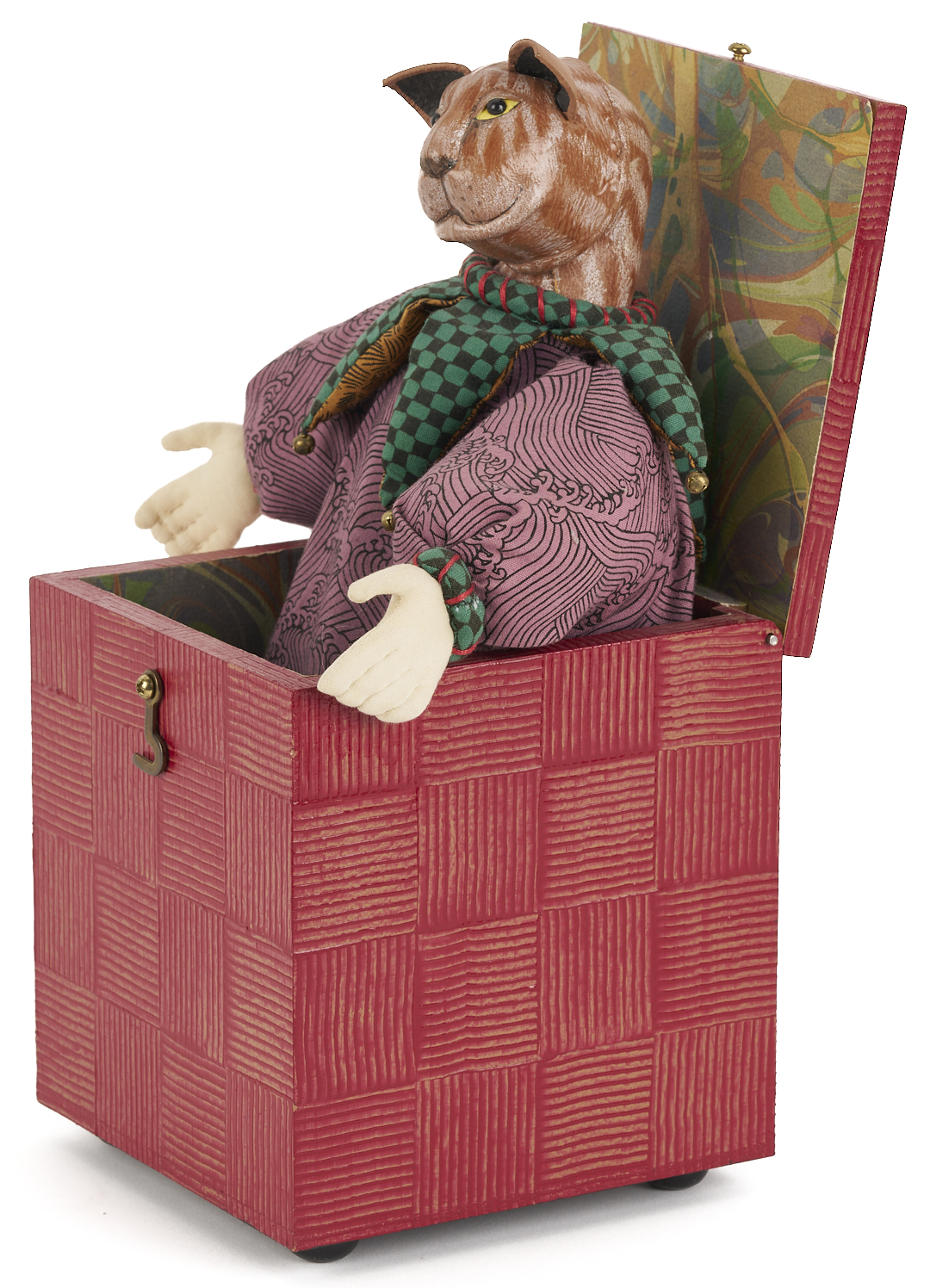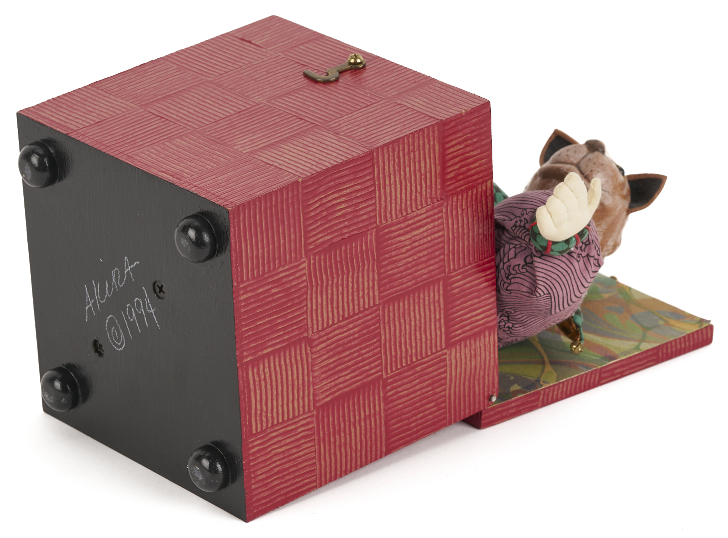 Akira Blount (American/Tennessee, 1945-2013) folk art soft sculpture jack in the box titled “Masked Jester.” Constructed of mixed media elements including fabric, paint, papier mache, wood, and metal. Signed and dated 1994 on the base. 6 1/2 in. H x 5 1/2 in. square. Biographical note: Akira Blount was born in 1945 and grew up in Madison, Wisconsin. She continued her education at the University of Wisconsin-Madison, where she graduated with a Bachelor’s degree in Art Education. She started making dolls from cotton stockings in 1970, and they quickly evolved into a steady source of income. Over the next nine years, her mastery of needle sculpting evolved into a style well known as her own. In 1979, she moved to the Great Smoky Mountains in Tennessee with her family. Her work has been profiled in over 30 magazines, and her soft sculptures can be found in the Musee des Artes Decorative in Paris; the Musée de Pouppes, Josselin, France; the Sekiguchi Doll Garden, Japan; and the Tennessee State Museum. Exhibitions include the National Museum of American Art, Washington, DC, American Folk Art Museum, NYC, NY, Mint Museum of Fine Art, Charlotte, NC, Santa Barbara Museum of Art, Santa Barbara, CA, Tampa Museum of Fine Art, Tampa, FL. The White House Collection of American Craft.