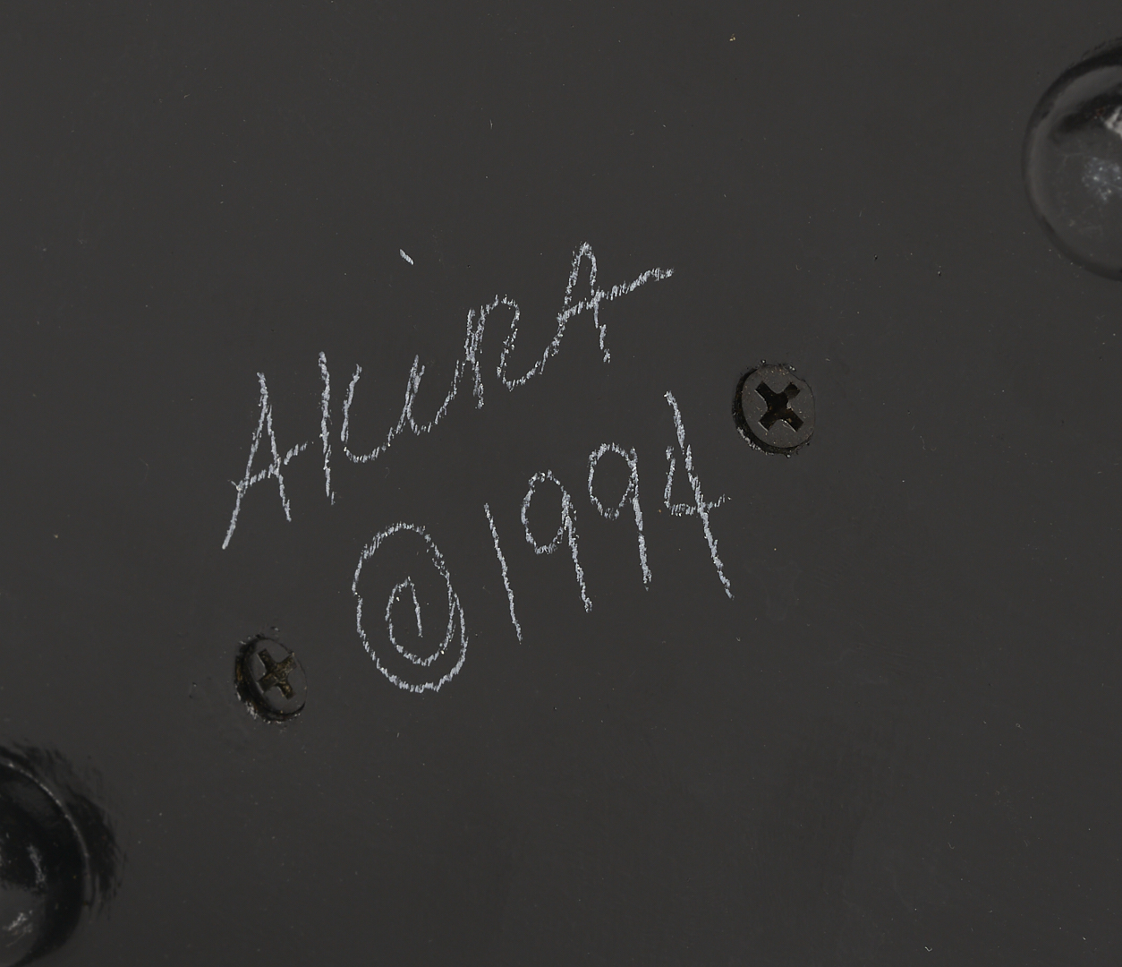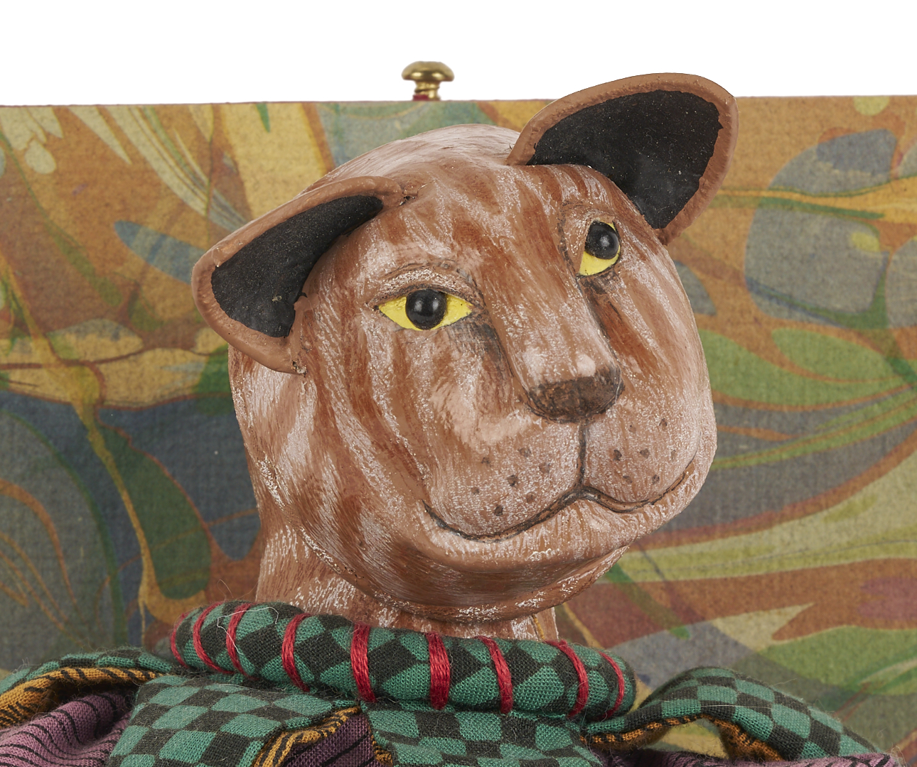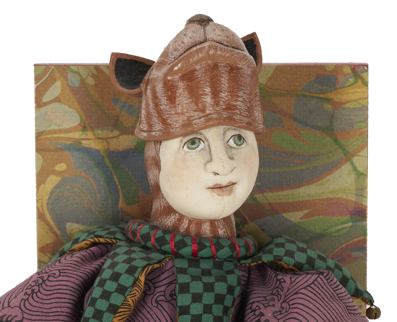 Akira Blount (American/Tennessee, 1945-2013) folk art soft sculpture jack in the box titled “Masked Jester.” Constructed of mixed media elements including fabric, paint, papier mache, wood, and metal. Signed and dated 1994 on the base. 6 1/2 in. H x 5 1/2 in. square. Biographical note: Akira Blount was born in 1945 and grew up in Madison, Wisconsin. She continued her education at the University of Wisconsin-Madison, where she graduated with a Bachelor’s degree in Art Education. She started making dolls from cotton stockings in 1970, and they quickly evolved into a steady source of income. Over the next nine years, her mastery of needle sculpting evolved into a style well known as her own. In 1979, she moved to the Great Smoky Mountains in Tennessee with her family. Her work has been profiled in over 30 magazines, and her soft sculptures can be found in the Musee des Artes Decorative in Paris; the Musée de Pouppes, Josselin, France; the Sekiguchi Doll Garden, Japan; and the Tennessee State Museum. Exhibitions include the National Museum of American Art, Washington, DC, American Folk Art Museum, NYC, NY, Mint Museum of Fine Art, Charlotte, NC, Santa Barbara Museum of Art, Santa Barbara, CA, Tampa Museum of Fine Art, Tampa, FL. The White House Collection of American Craft.