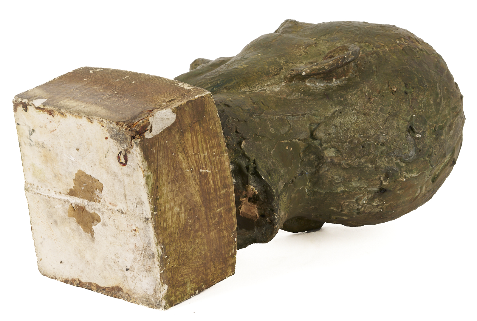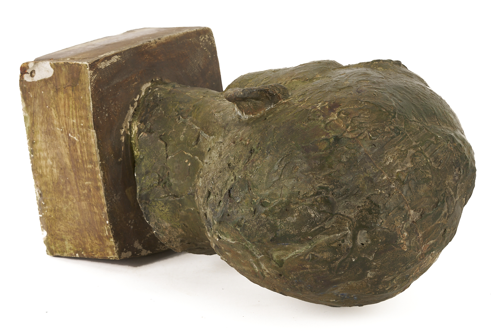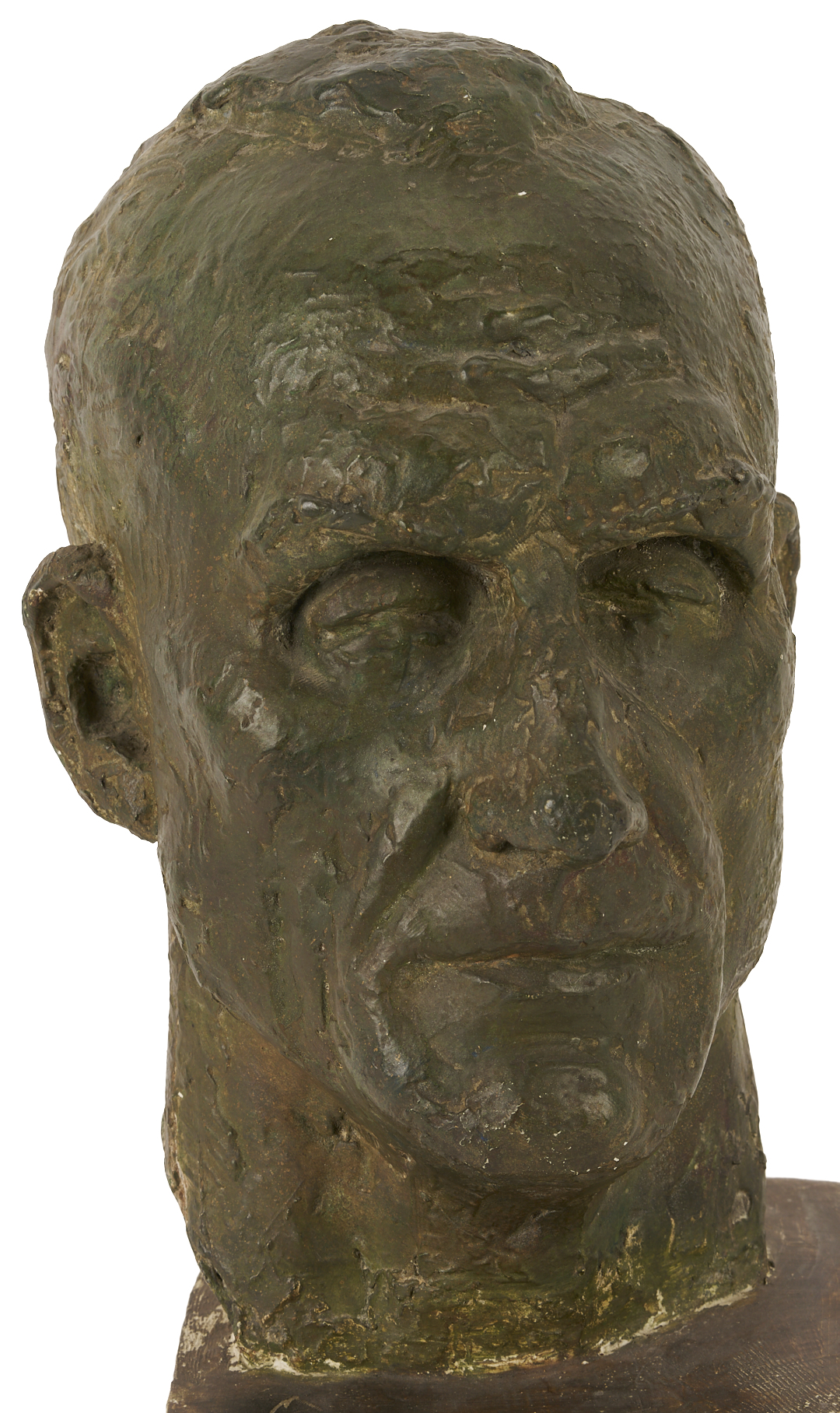 Thomas Puryear Mims (American/Tennessee, 1906-1975) painted plaster or ceramic sculpture depicting the head and neck of the writer Robert Penn Warren, atop an integral square base. Unsigned. 17 in. H x 8 in. W x 8 1/2 in. D. Note: Robert Penn Warren (1905-1989) was born in Guthrie, Kentucky, attended school in Clarksville, TN, and college at Vanderbilt University. While still an undergraduate at Vanderbilt, Warren became associated with the group of poets there known as the Fugitive Poets and later, the Southern Agrarians. Warren went on to study at other institutions and to win virtually every major award given to writers in the United States and was the only person to receive a Pulitzer Prize in both fiction (once) and poetry (twice). While at Vanderbilt, one of Warren’s key mentors was Edwin Mims, the father of sculptor Puryear Mims. Puryear Mims was about the same age as Robert Penn Warren and the two men ran in similar circles: Puryear Mims also earned an English degree from Vanderbilt University and even taught the subject for a brief period. Mims’ fascination with sculpture eventually led him to study at the Academie Julian in Paris and the Art Students League in New York, where he trained under two of America’s pioneer abstractionists, Robert Laurent and William Zorach. He also worked in the studio of the sculptor Saul Baizerman in New York. In 1934 he worked on the Mount Rushmore project as an assistant to Gutzon Borglum. He returned to the Art Students League and eventually, to Nashville. Mims taught art at Vanderbilt University and in 1958 was appointed Sculptor in Residence. He created numerous public sculptures around Nashville, participated in several one-man and multi-artist exhibits, and, following his death, was the subject of a retrospective at Cheekwood. (Mims biography source: Philancy Holder, catalog for the aforementioned Cheekwood exhibit).