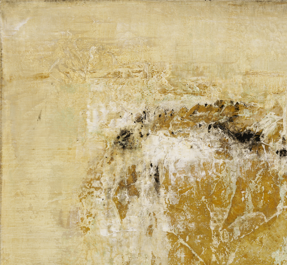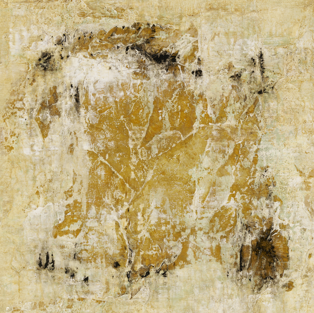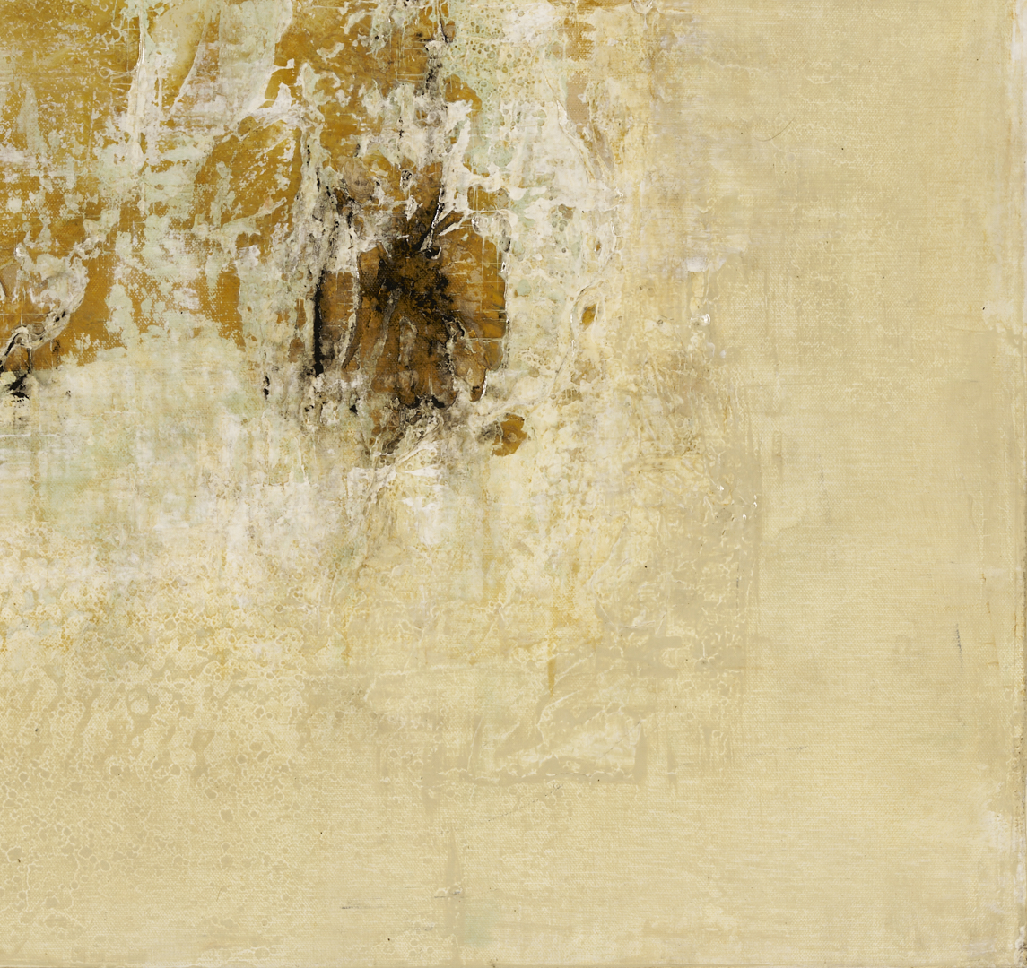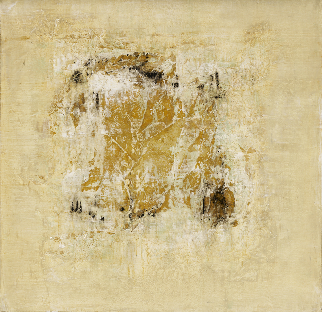 Brad Robertson (Alabama, 20th/21st c.) acrylic on canvas abstract composition in light blue, white, ochre, and varied earth tones, “Beneath the Surface.” Passages of impasto and other texturing combine to evoke the sandy shoreline of a beach. Signed in script and cursive en verso. Unframed. Canvas: 36 in x 36 in.