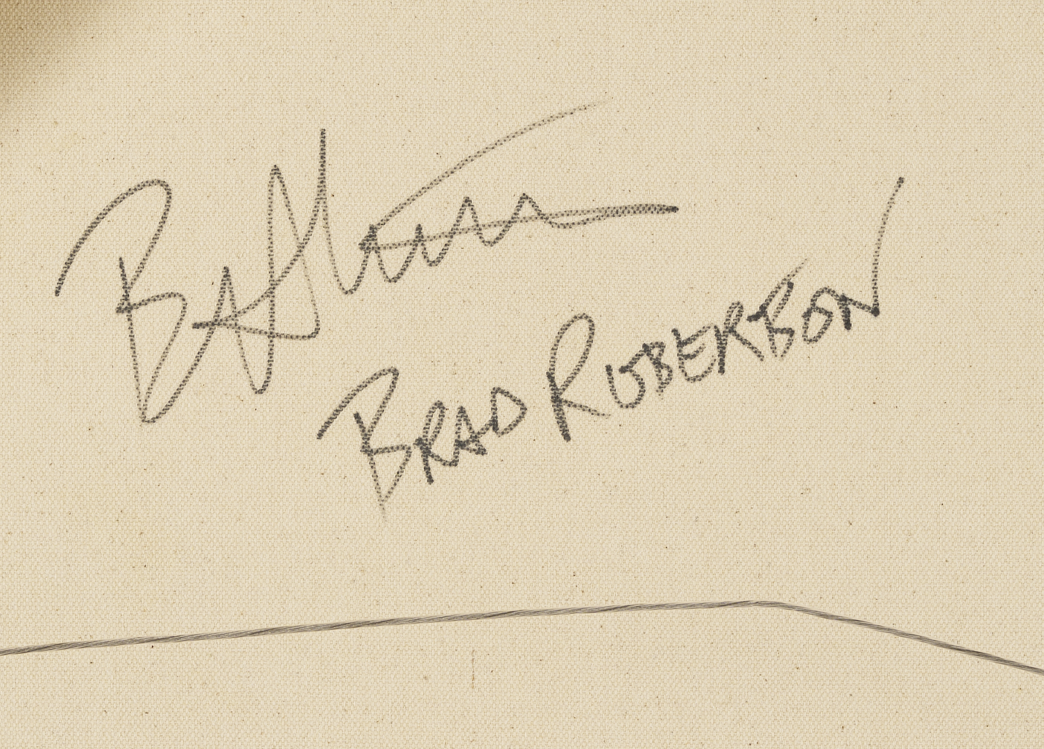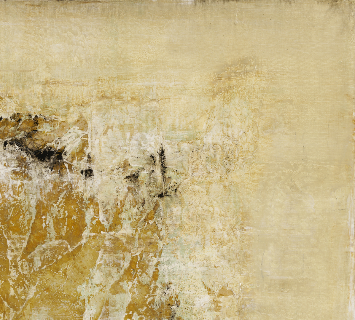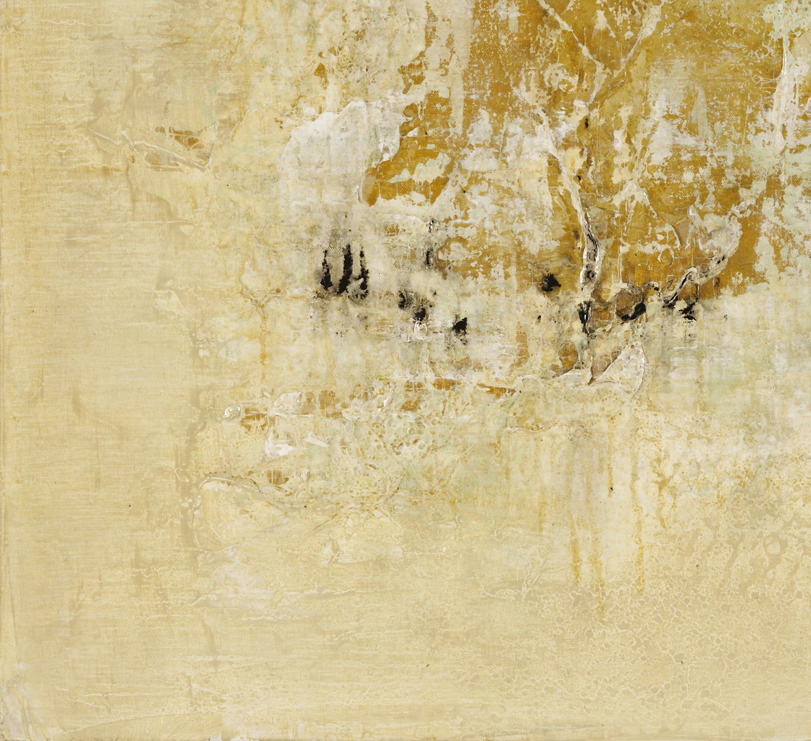 Brad Robertson (Alabama, 20th/21st c.) acrylic on canvas abstract composition in light blue, white, ochre, and varied earth tones, “Beneath the Surface.” Passages of impasto and other texturing combine to evoke the sandy shoreline of a beach. Signed in script and cursive en verso. Unframed. Canvas: 36 in x 36 in.