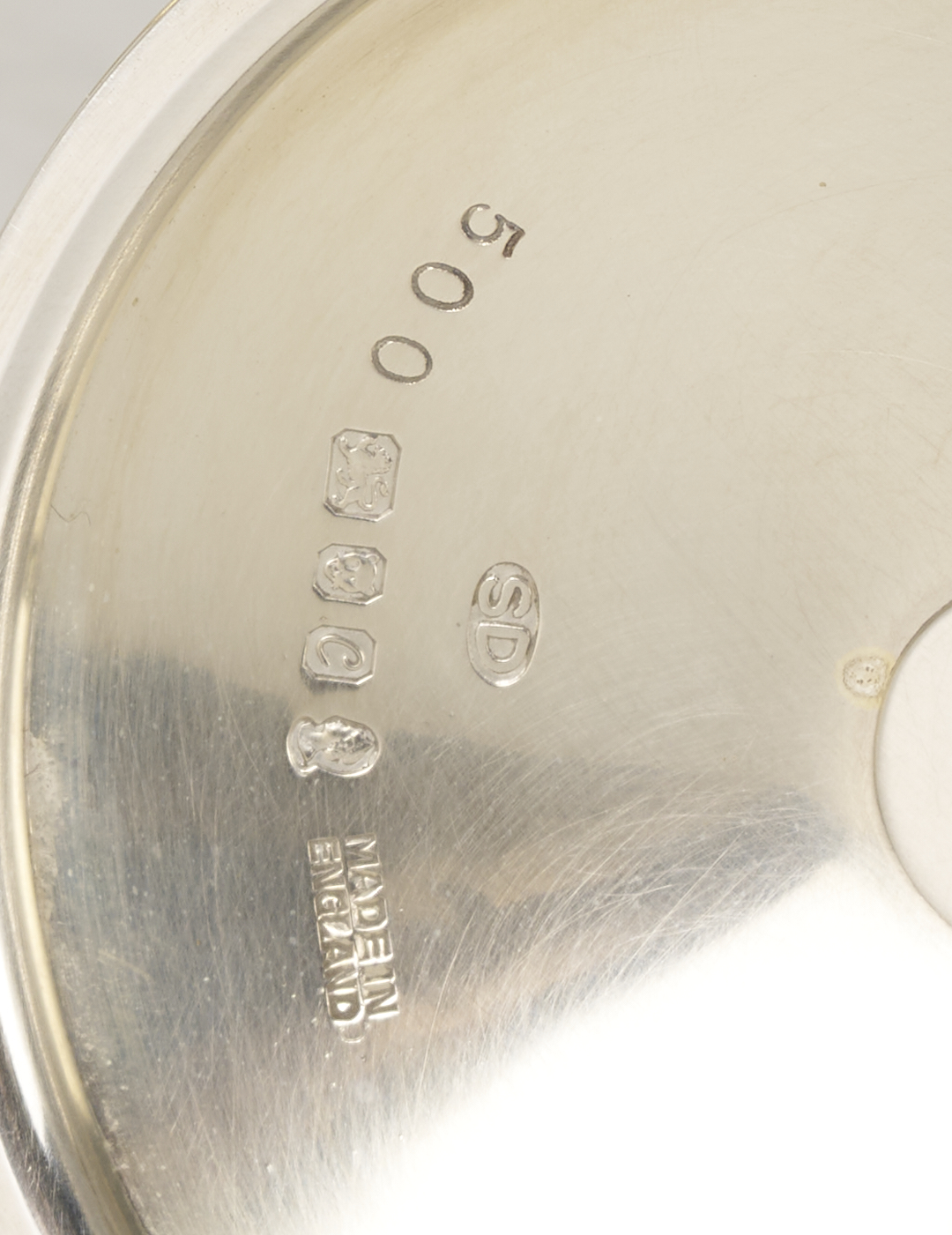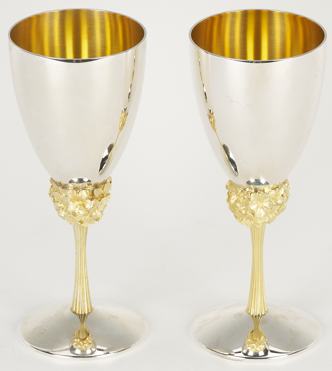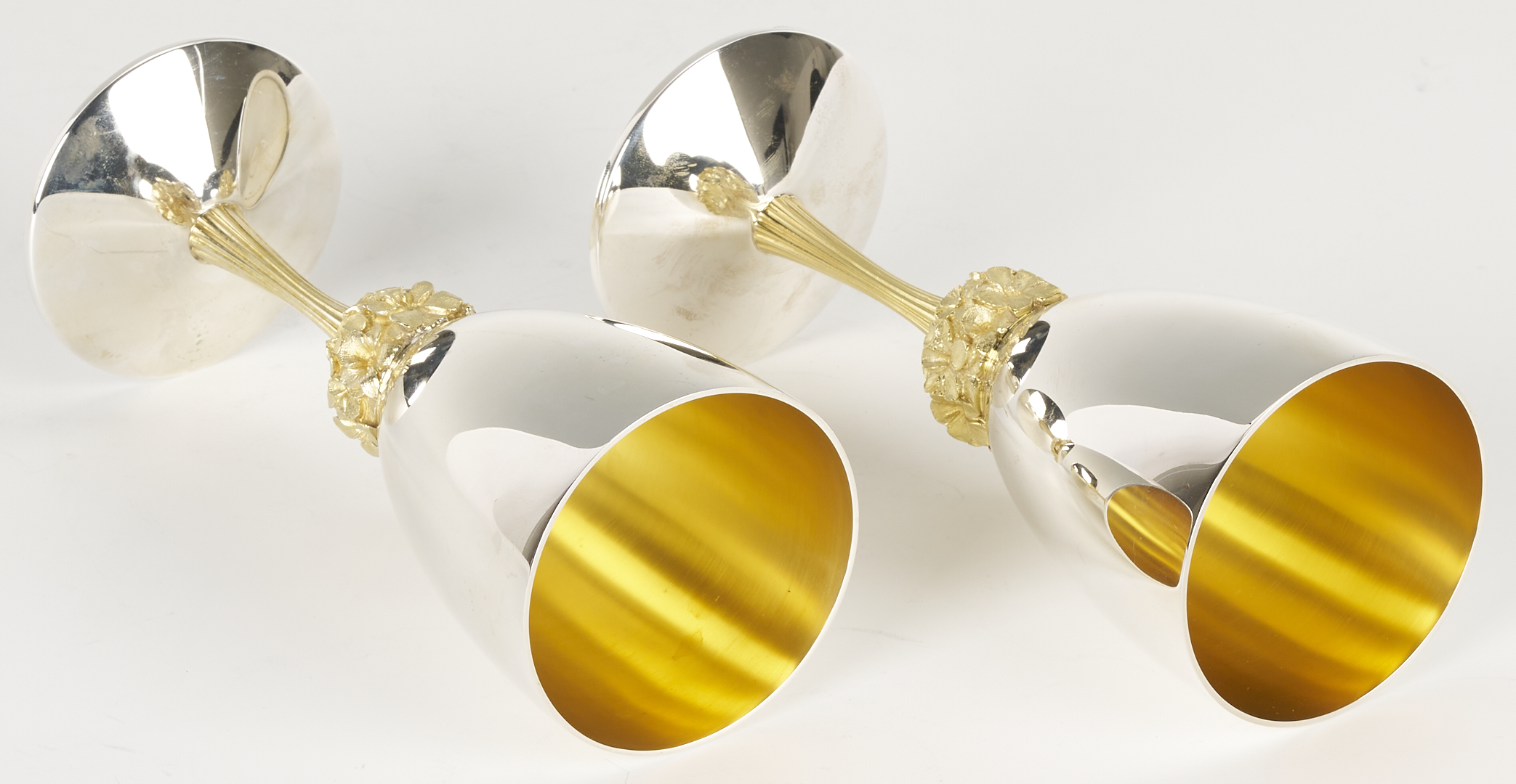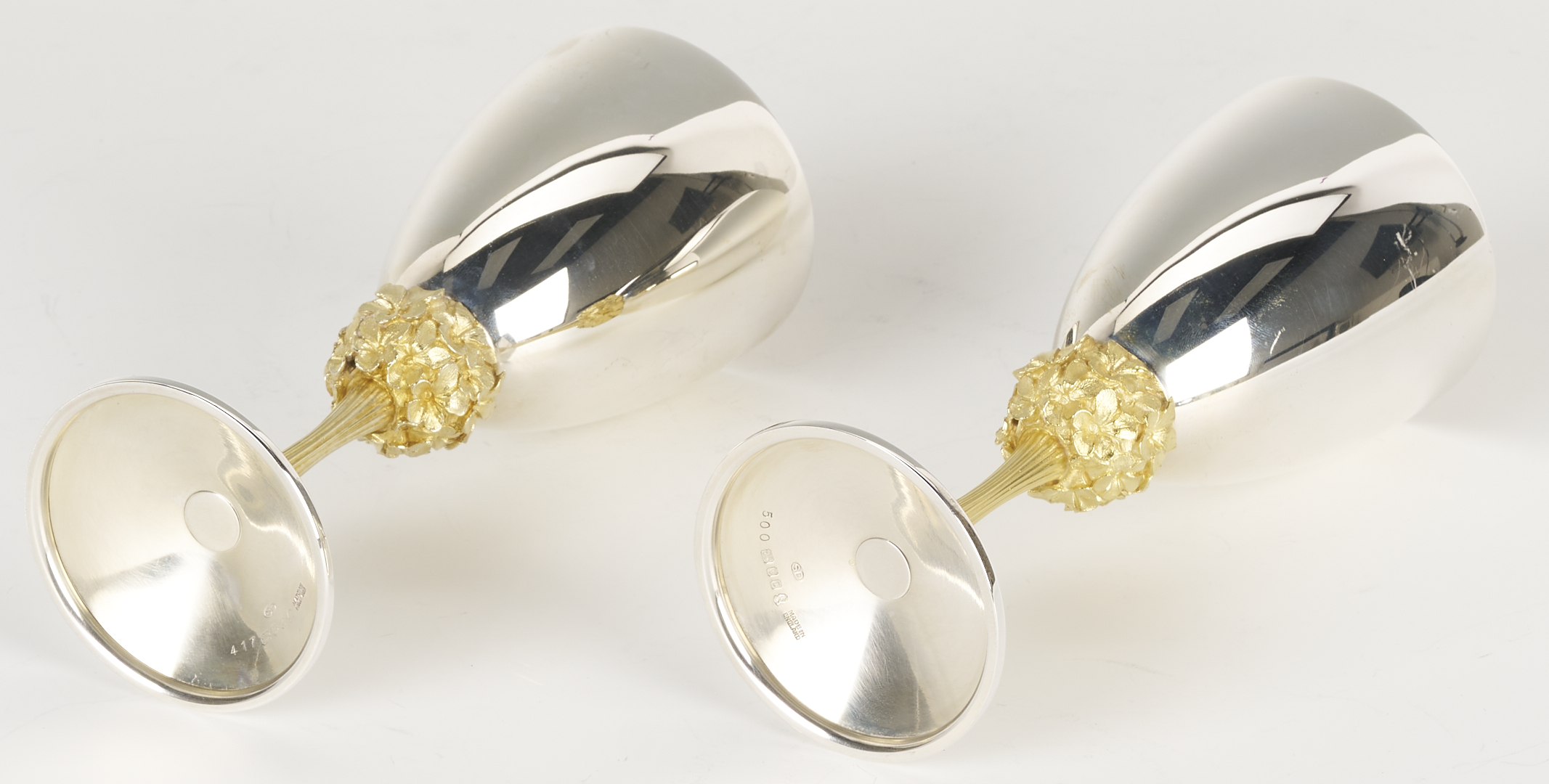 Six (6) Stuart Devlin (Australian/English, 1931 – 2018) sterling silver goblets in The Violet pattern, with gilt-washed bowls and foliate repousse vermeil gilt stems. All hallmarked for Stuart Devlin, London, sterling, and dates circa 1977, with “Made in England” stamped on the base. Five original boxes are retained along with six original storage bags. 6 3/4 in. H. 46.46 total troy ounces. Note: Lot also includes three books highlighting Stuart Devlin’s body of work.