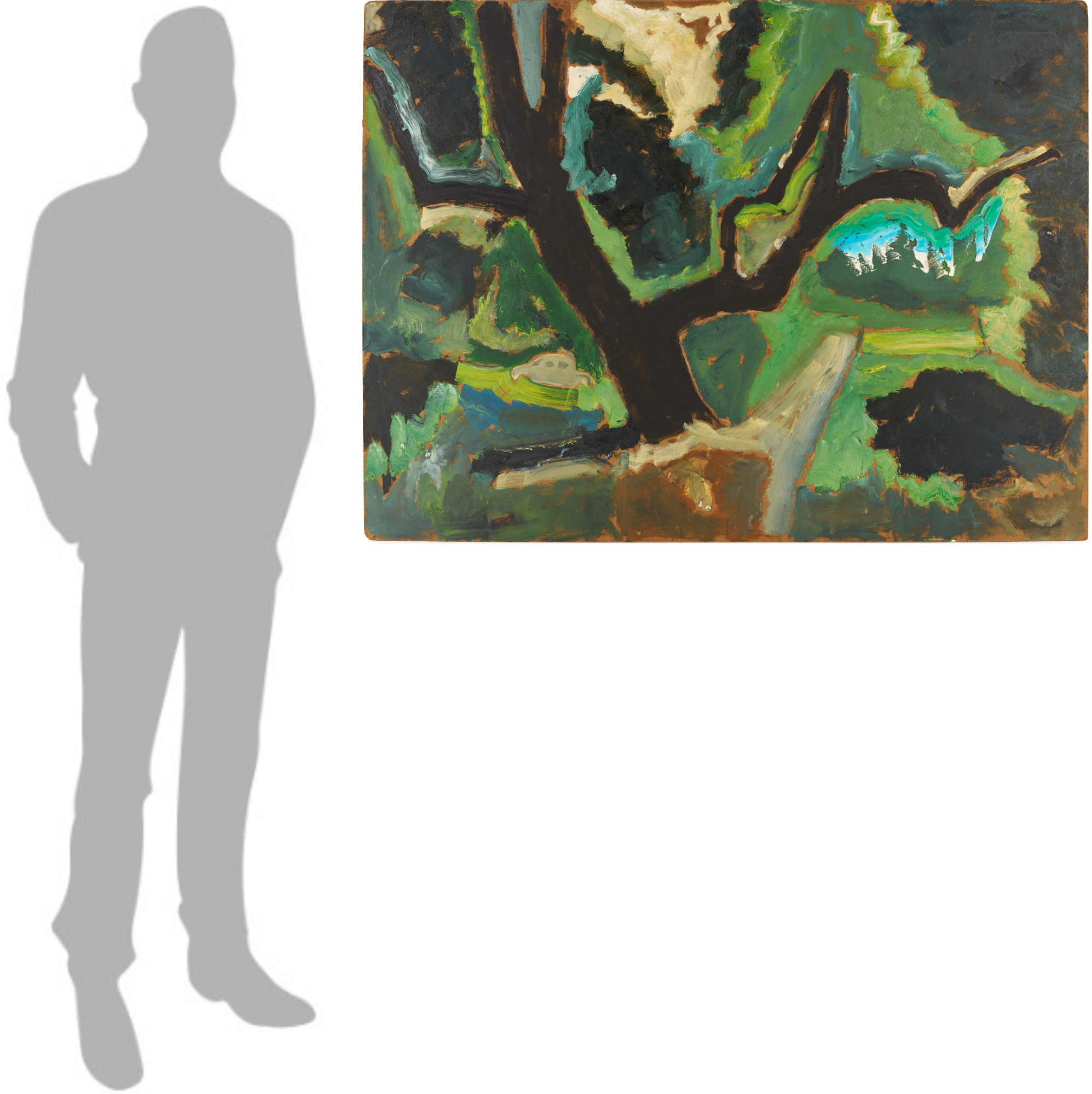 Sterling Strauser (American, 1907-1995) oil on board modernist landscape painting titled “Summer Act 3”. A car travels under the branches of a large tree, which looms in the foreground. Swaths of green and black suggesting leaves and shadows are rendered in gestural brushstrokes and dominate the scene. Signed lower right and dated 1989. 36 in H x 48 in W. Unframed.