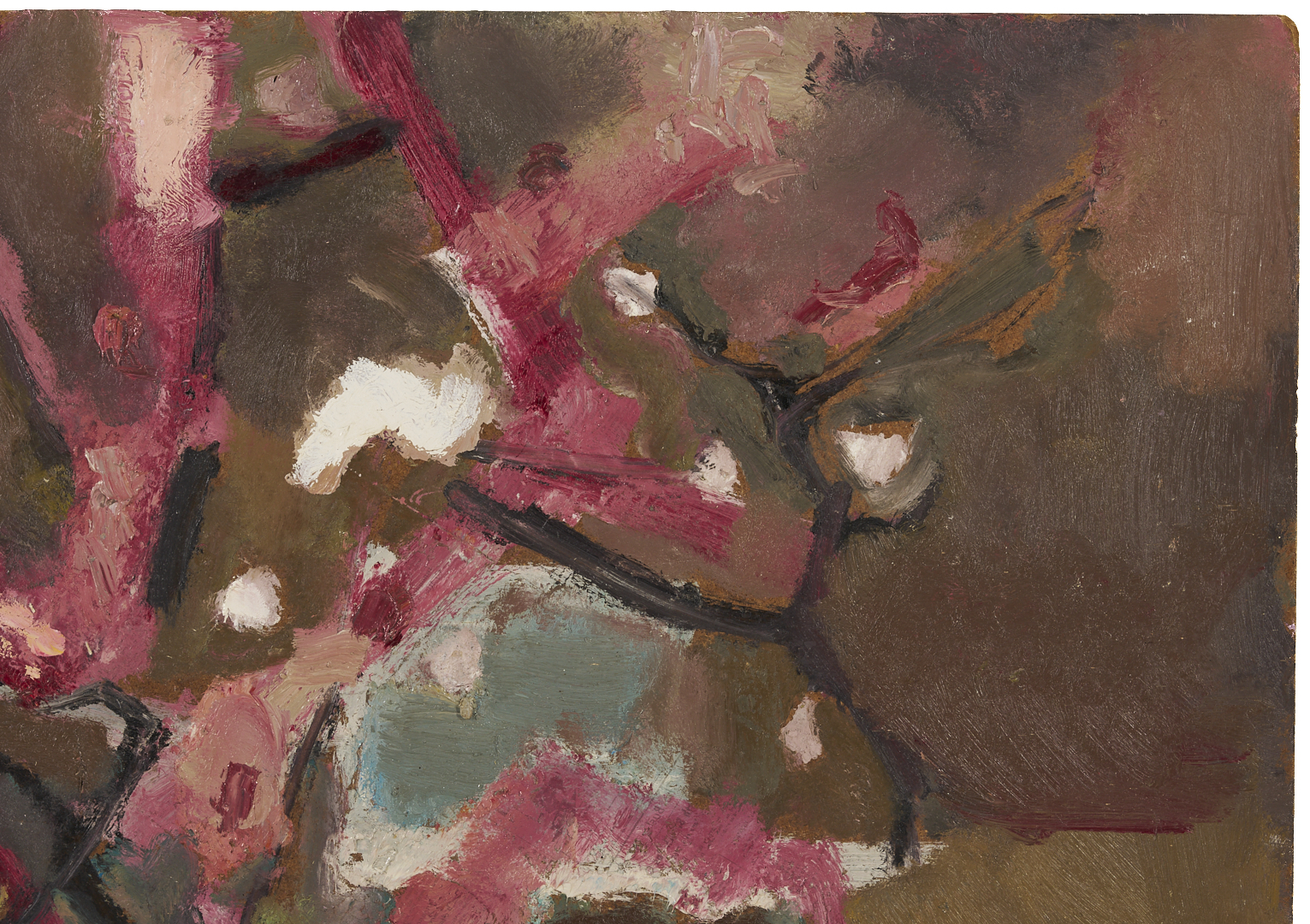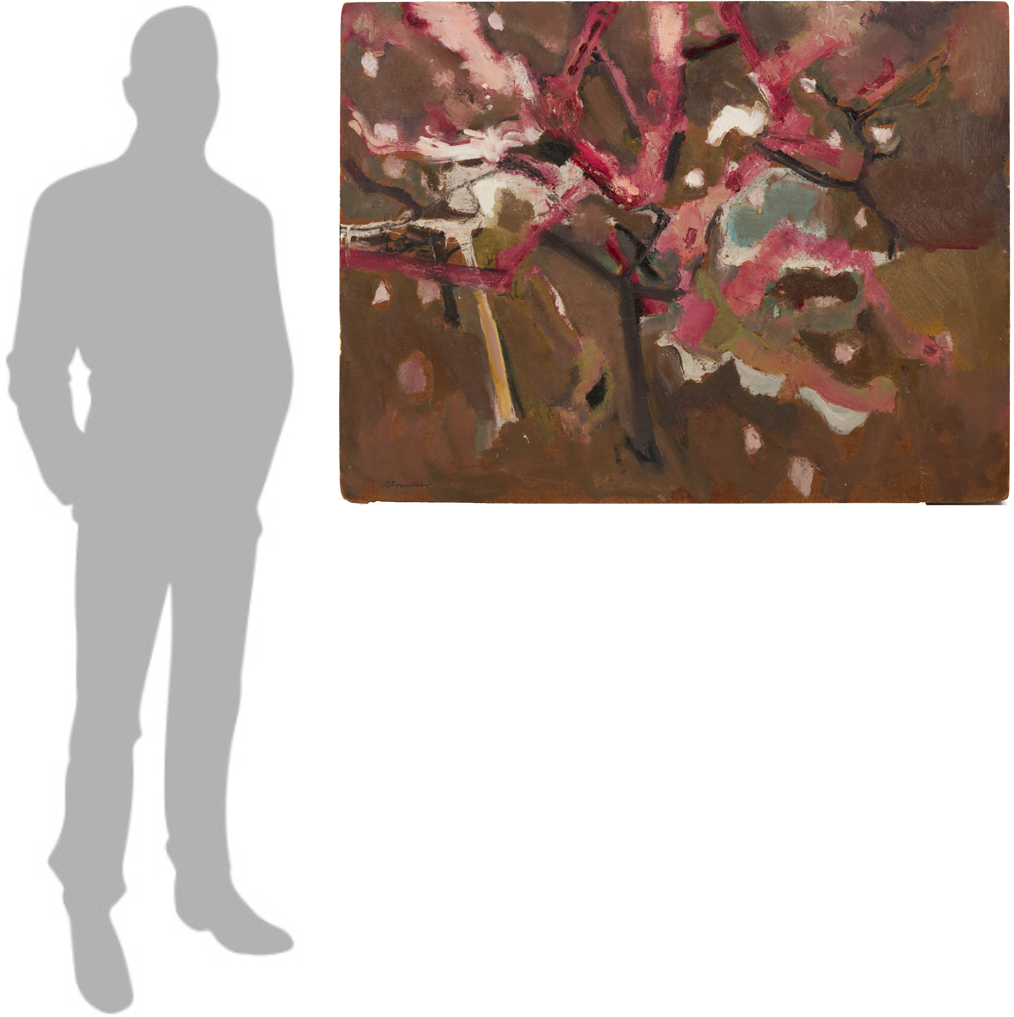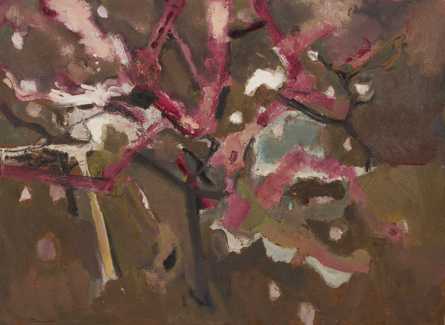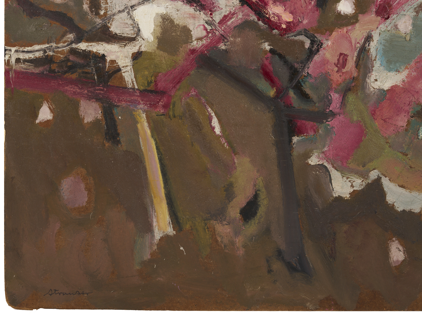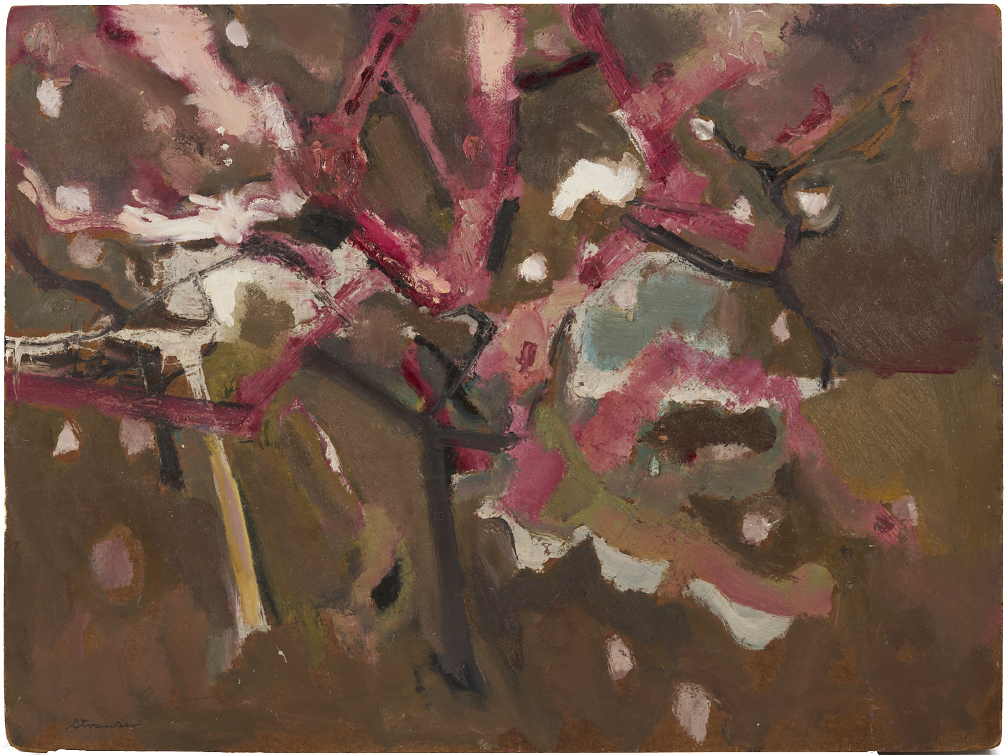 Sterling Strauser (American, 1907-1995) oil on board modernist painting titled “Peach Orchard, Flemington, NY” featuring abstracted peach trees in bright shades of pink, purple and white. Signed “Strauser” lower left and titled en verso. 36 in. H x 48 in. W. Unframed.