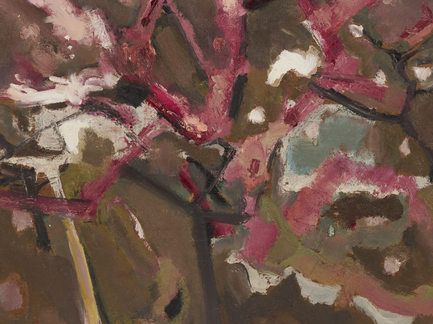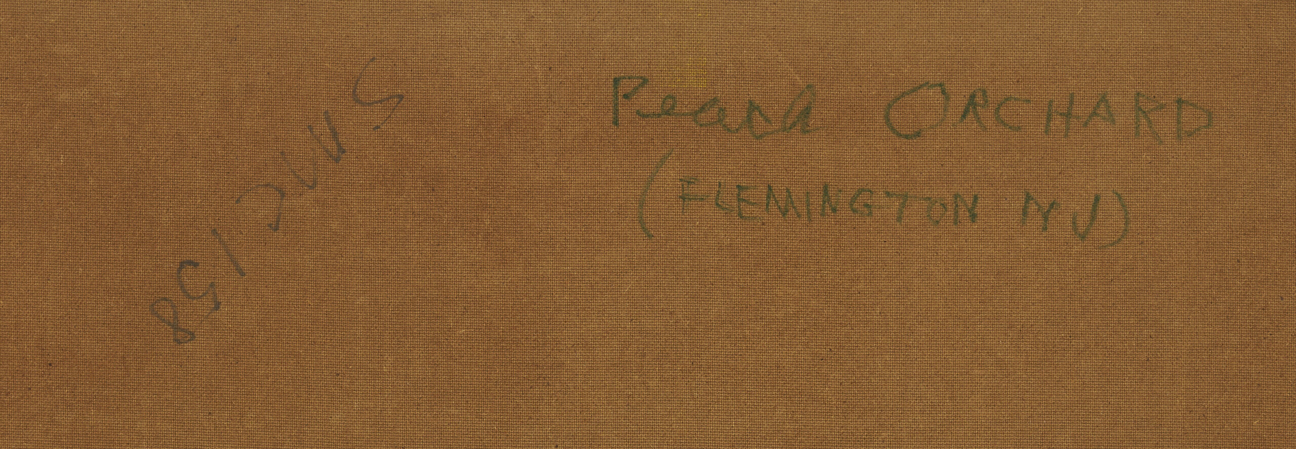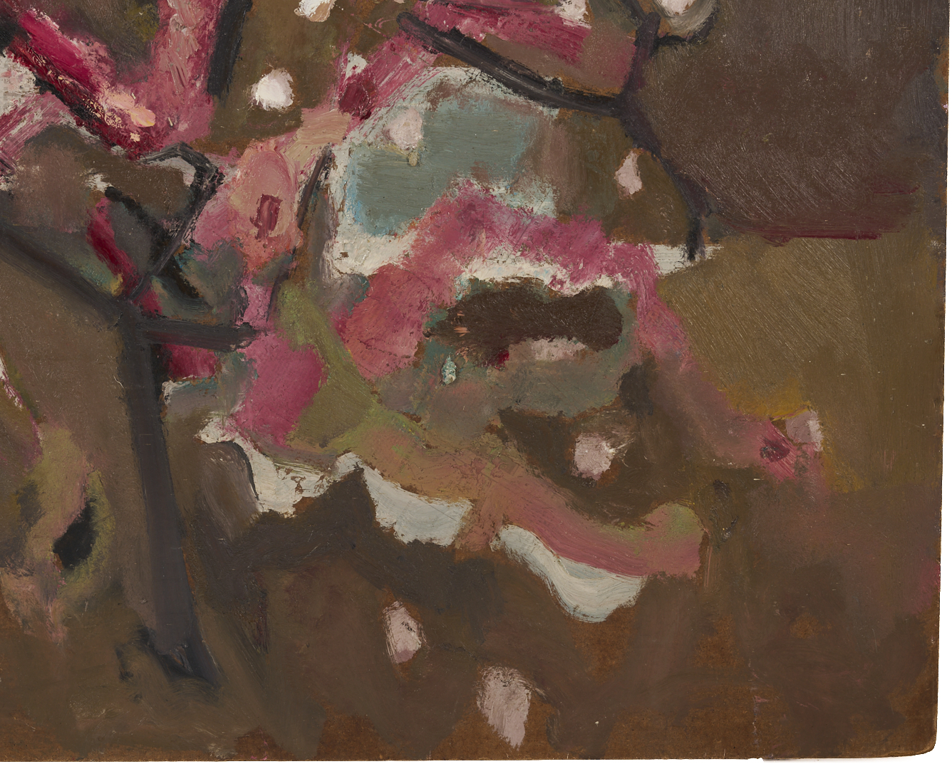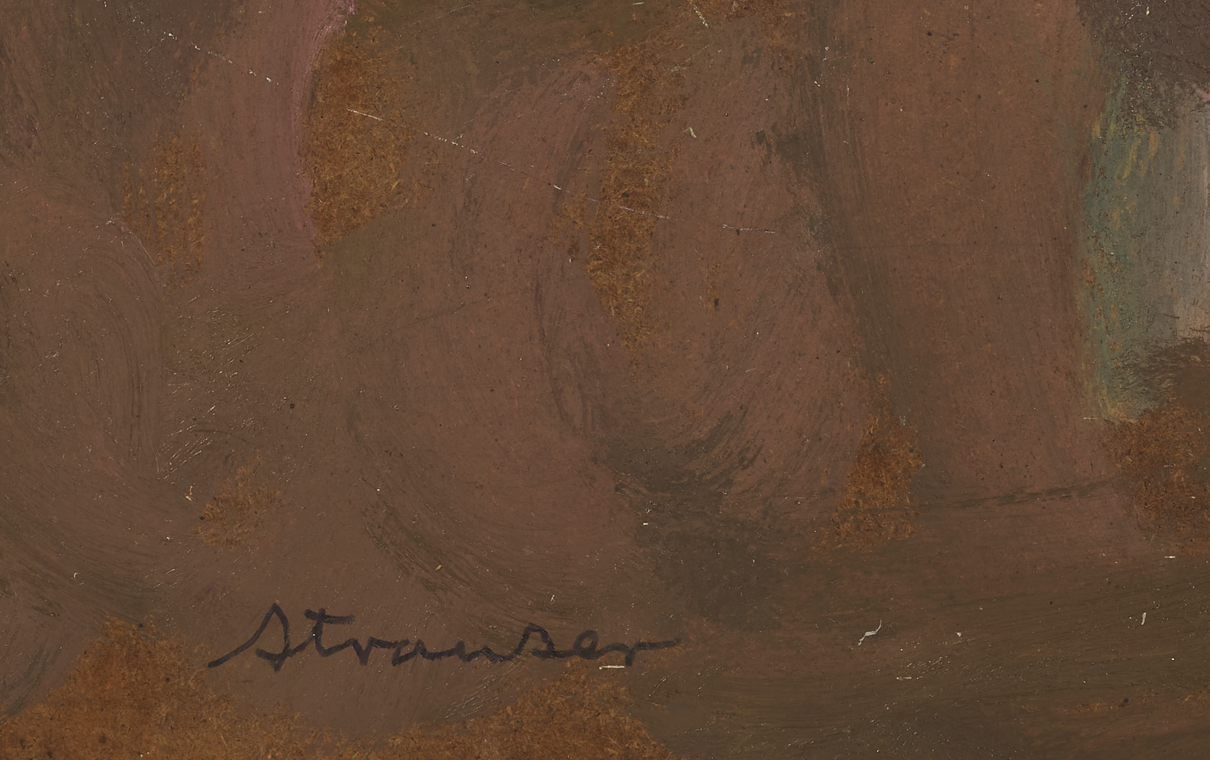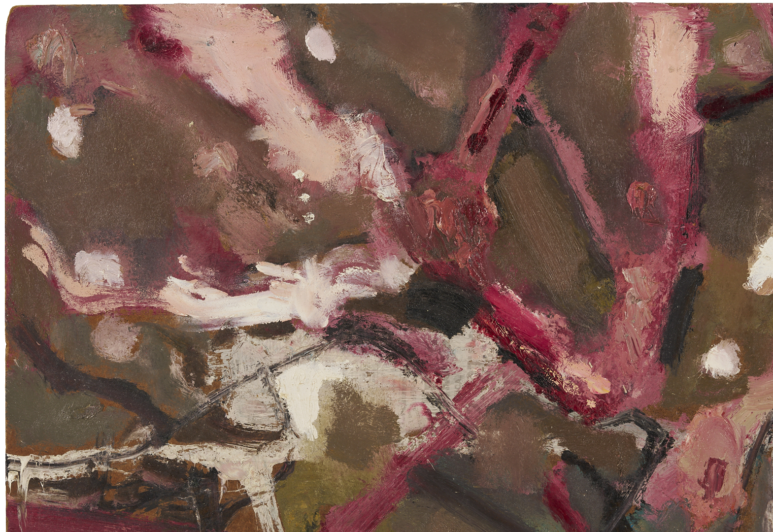 Sterling Strauser (American, 1907-1995) oil on board modernist painting titled “Peach Orchard, Flemington, NY” featuring abstracted peach trees in bright shades of pink, purple and white. Signed “Strauser” lower left and titled en verso. 36 in. H x 48 in. W. Unframed.
