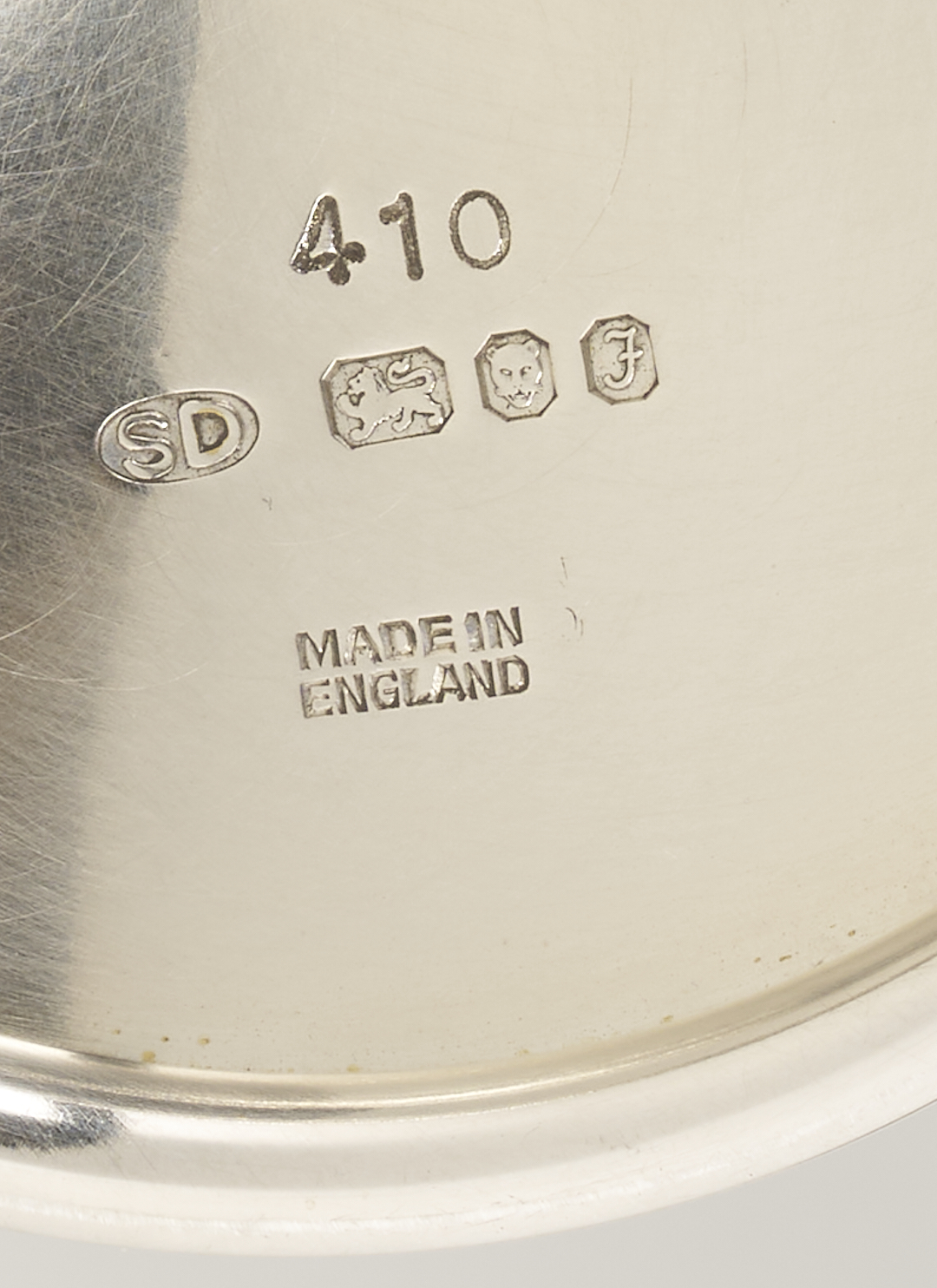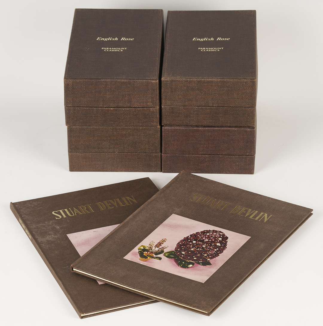 Set of Five (5) Stuart Devlin (Australian/English, 1931 – 2018) parcel gilt sterling silver goblets in the English Rose pattern, with gilt wash bowls and foliate repousee vermeil stems. All hallmarked for Stuart Devlin, London, and dates circa 1980, with “Made in England” stamped on the base. Four original boxes are retained along with five original storage bags. 6 3/4 in. H. 38.70 total troy ounces. Note: This lot also includes two books highlighting Stuart Devlin’s body of work.