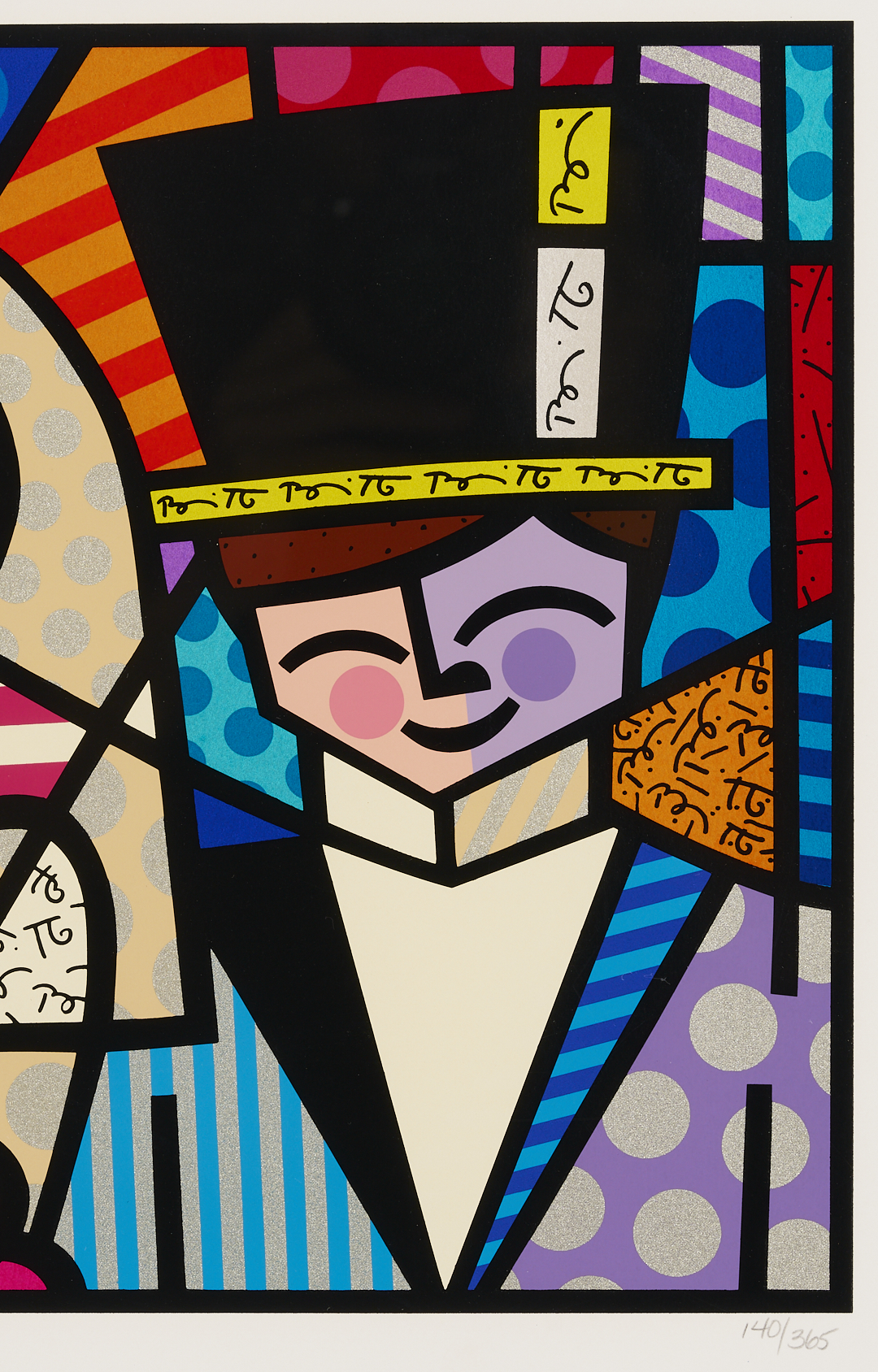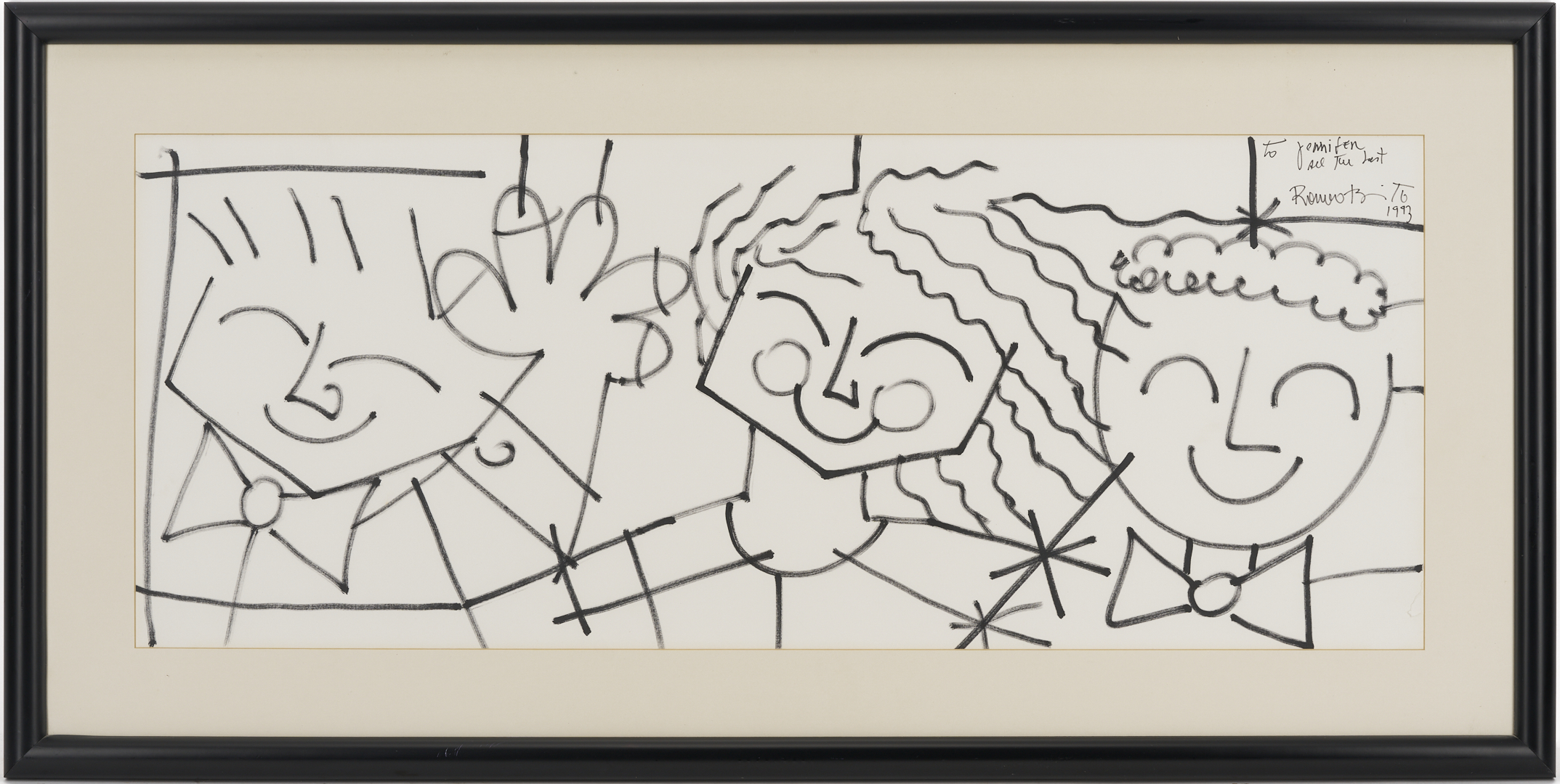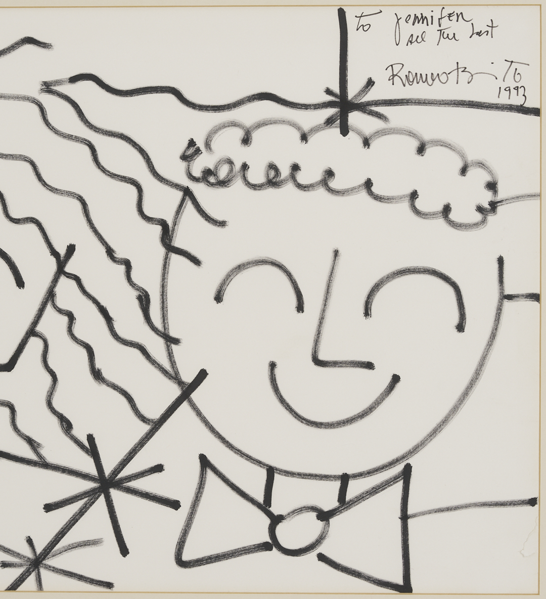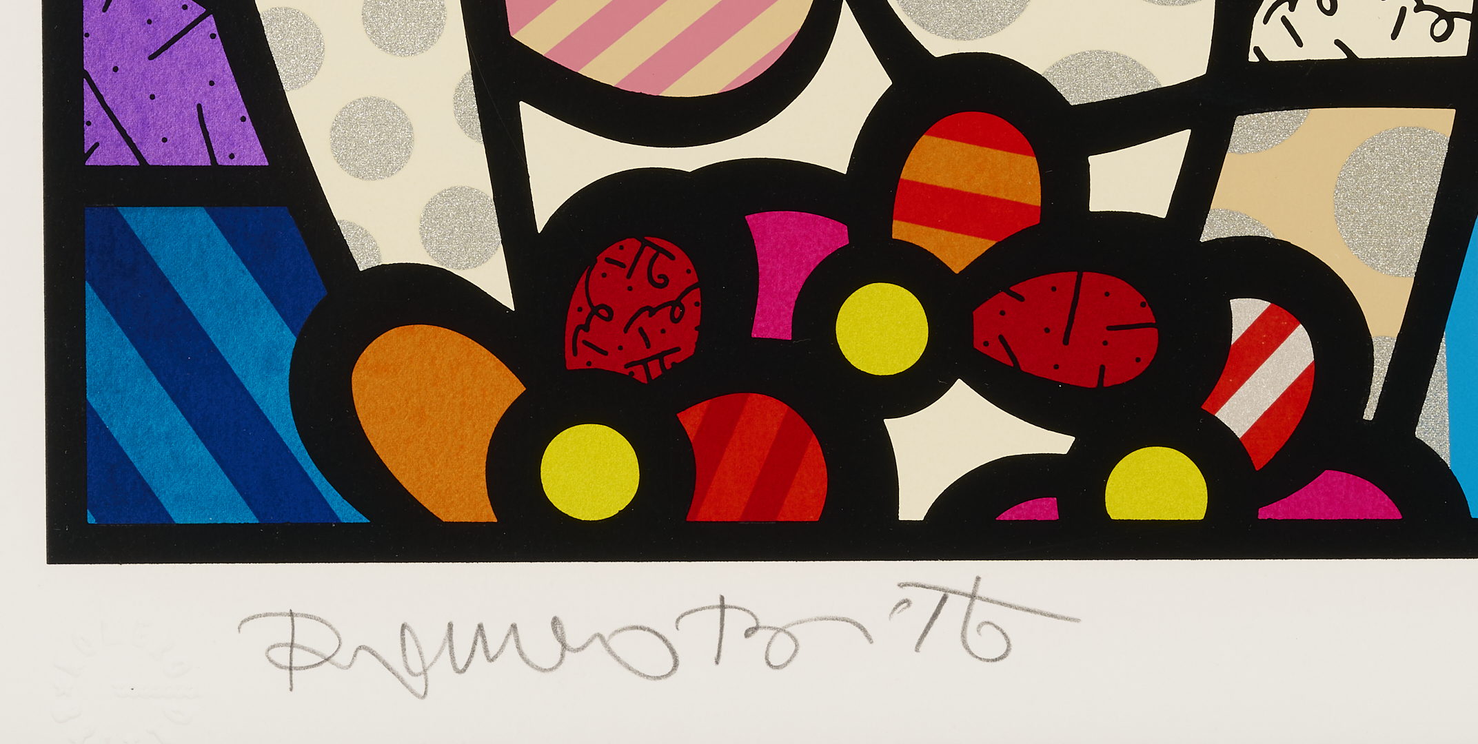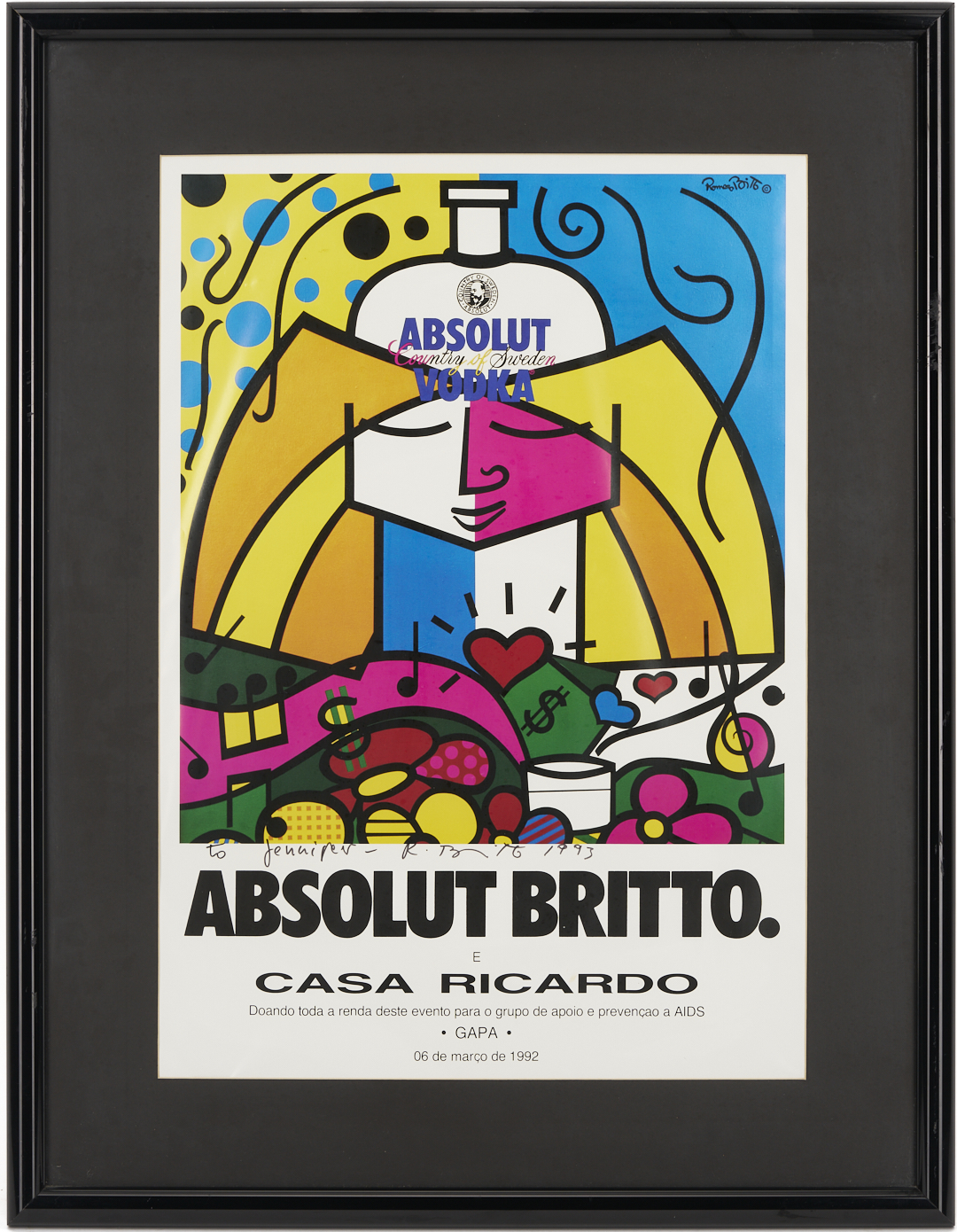 Three (3) Romero Britto artworks. 1st item: Romero Britto (Brazil, b. 1963) original drawing, black marker on paper, depicting three smiling faces. Signed upper right corner, dated 1993, and inscribed “To Jennifer / All the Best.” Sight: 14 1/2 in. H x 36 in. D. Matted and Framed under plexiglass: 22 in. H x 44 in. W. 2nd item: “Bride and Groom,” Serigraph, c. 1996, Britto blindstamp lower left, signed in pencil lower left and numbered 140/365, sight 13 in. H x 15 1/2 in W, matted and framed under plexiglass, 27 1/2 in. H x 30 in. Bible verses inscribed en verso in marker. W. 3rd item: “Absolute Britto” advertising poster for Absolut Vodka, offset lithograph. Inscribed “To Jennifer – Romero Britto 1993.” Sight: 22 1/2 in. H x 15 3/4 in. W. Matted and framed under plexiglass: 30 in. H x 23 in. W.