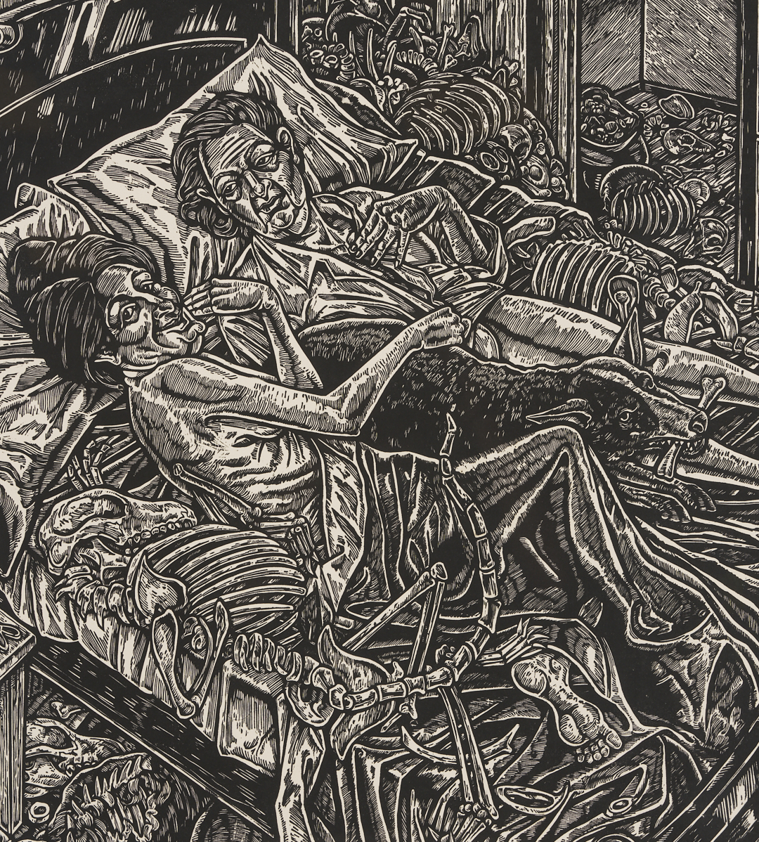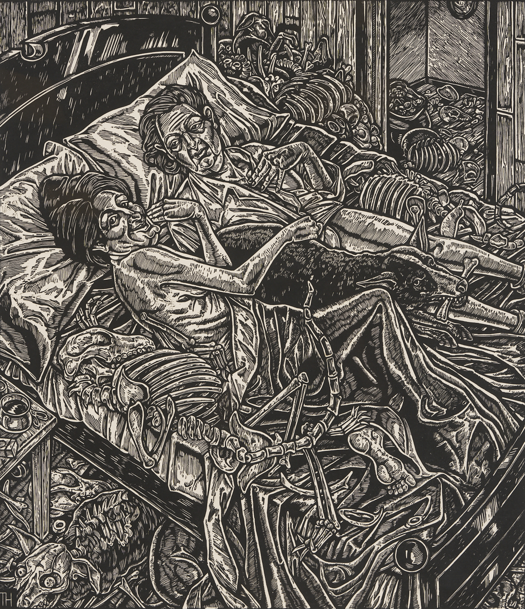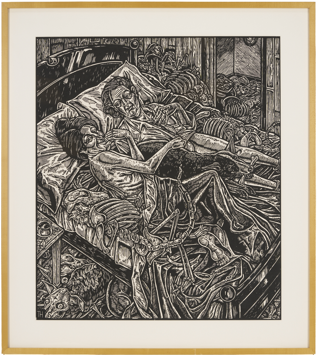 Tom Huck (American/Missouri, b. 1971) woodcut, “Bed of Bones,” from the series “2 Weeks in August: 14 Rural Absurdities,” 1998. Two human figures and a dog lie in bed while surrounded by various skeletal remains. Number 2 from the edition of 15. Housed under plexiglass in a modern wood frame with white mat. Sight: 29 1/2 in H in x 25 1/2 in W. Frame: 37 in H x 33 in W.