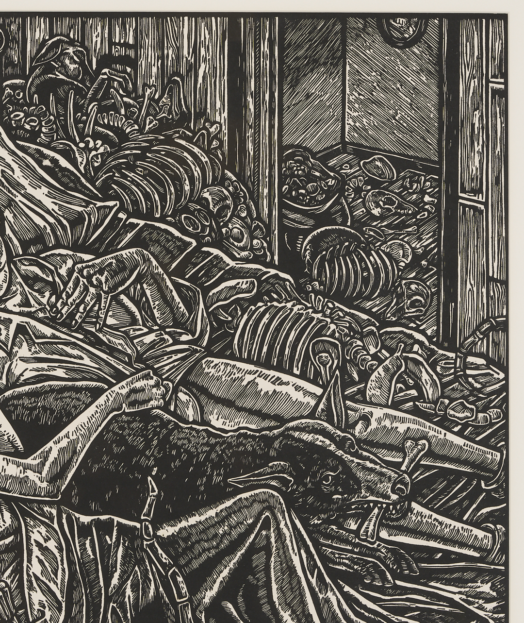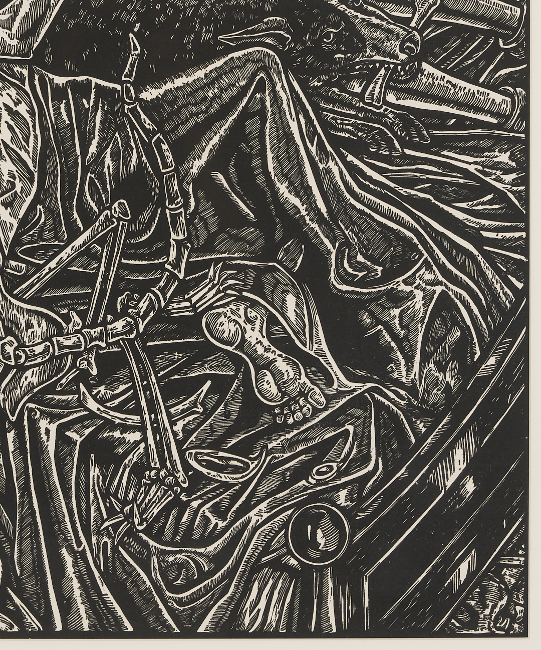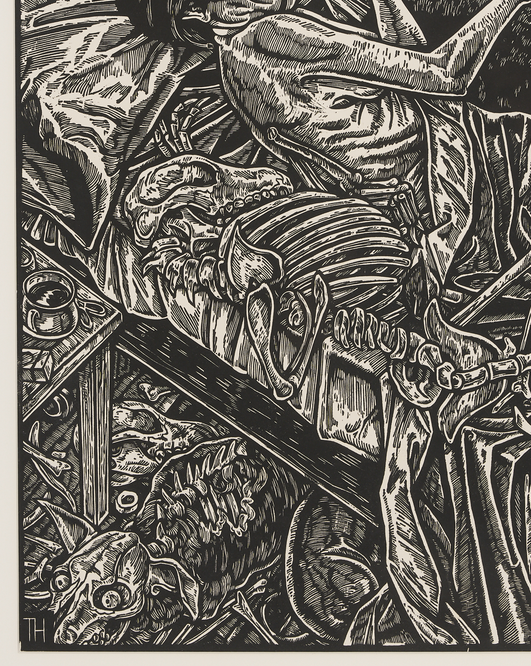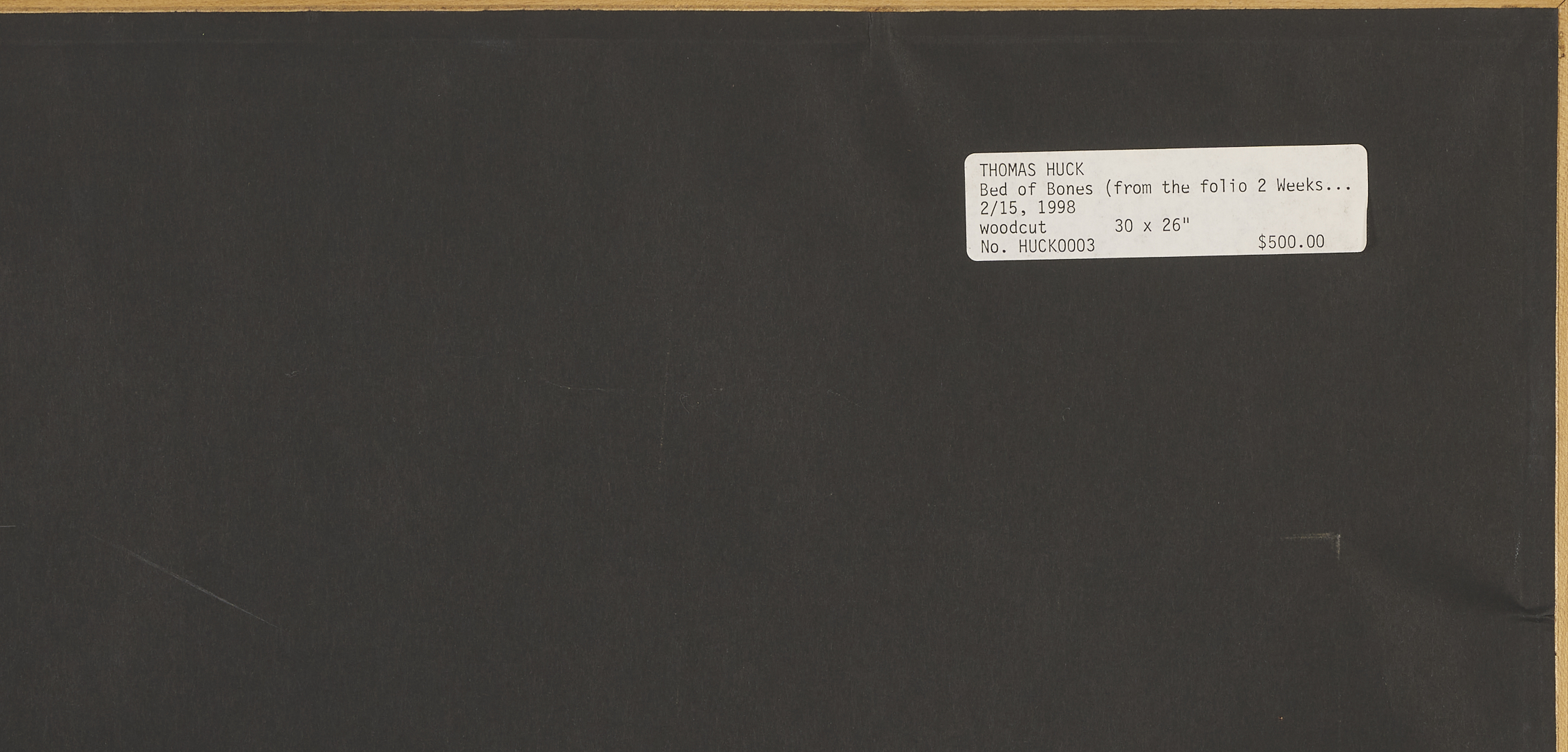 Tom Huck (American/Missouri, b. 1971) woodcut, “Bed of Bones,” from the series “2 Weeks in August: 14 Rural Absurdities,” 1998. Two human figures and a dog lie in bed while surrounded by various skeletal remains. Number 2 from the edition of 15. Housed under plexiglass in a modern wood frame with white mat. Sight: 29 1/2 in H in x 25 1/2 in W. Frame: 37 in H x 33 in W.