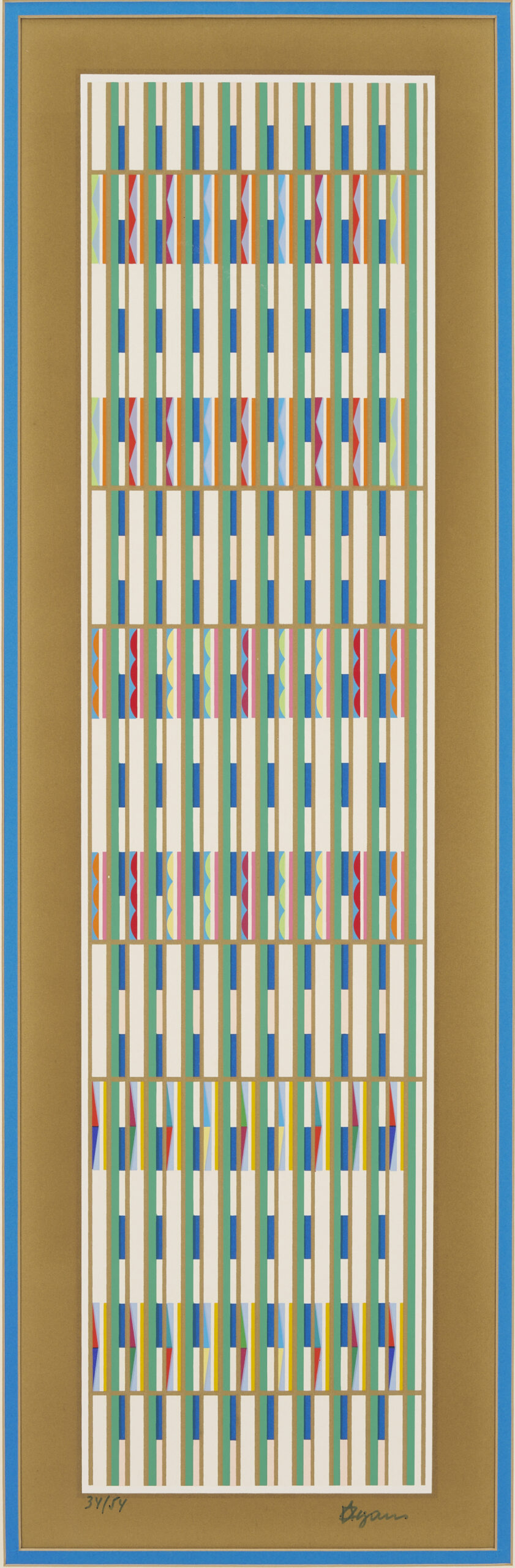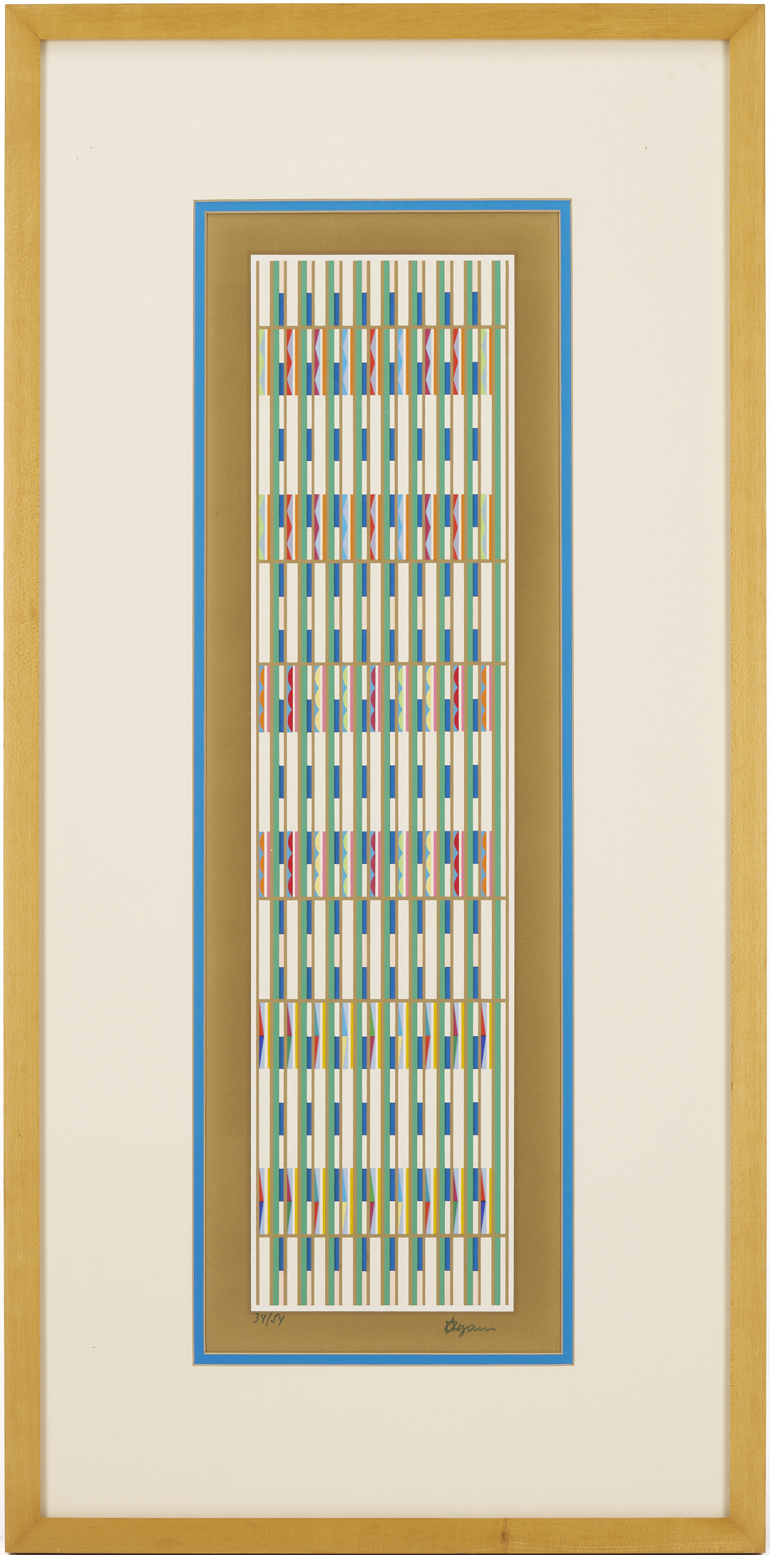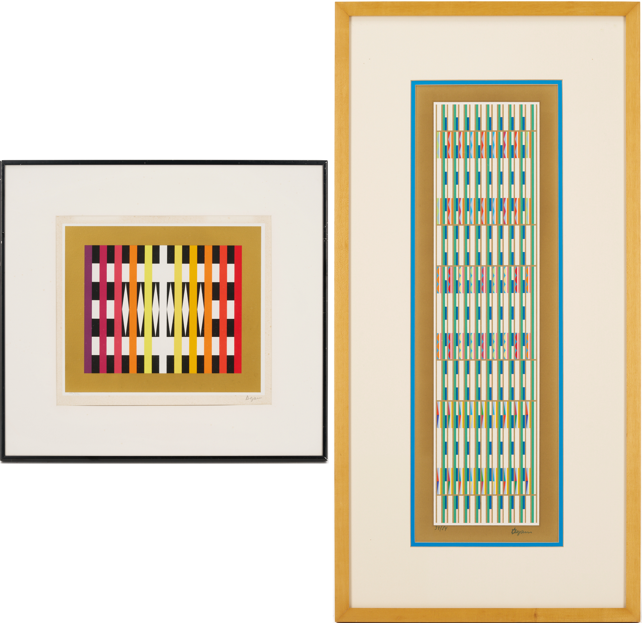 Yaacov (Gibstein) Agam (Israel/New York/France, born 1928) multi-color geometric abstraction Op Art screen prints, including one small horizontal print signed lower right and numbered 129/252 housed in a black metal frame (Sight: 10 1/4 in. H x 11 5/8 in. W. Framed: 16 5/8 in. H x 18 1/8 in. W), and one vertical print signed lower right and numbered 34/54 housed in a blonde wood frame (Sight: 25 1/2 in. H x 8 in. W. Framed: 35 in. H x 17 1/4 in. W).