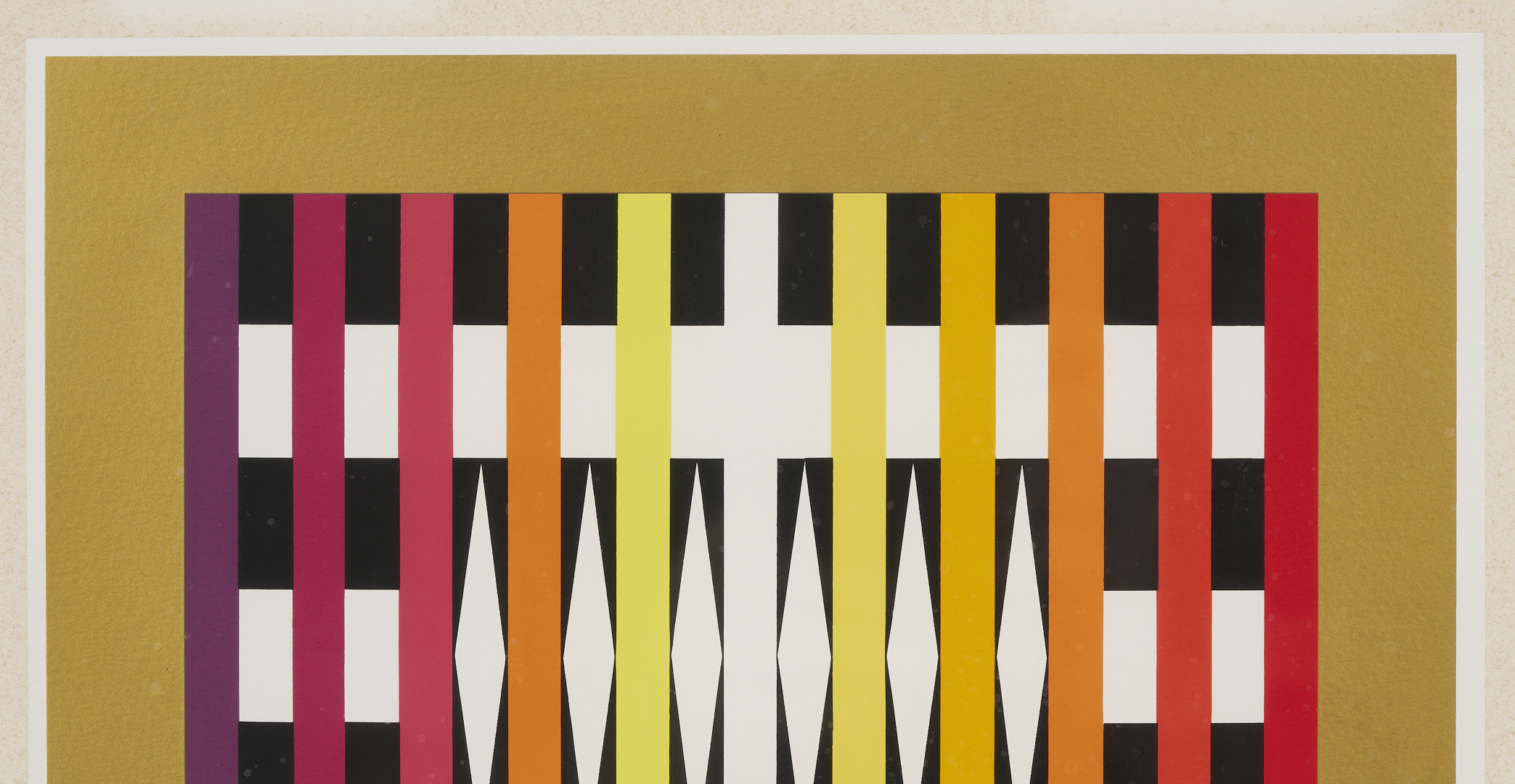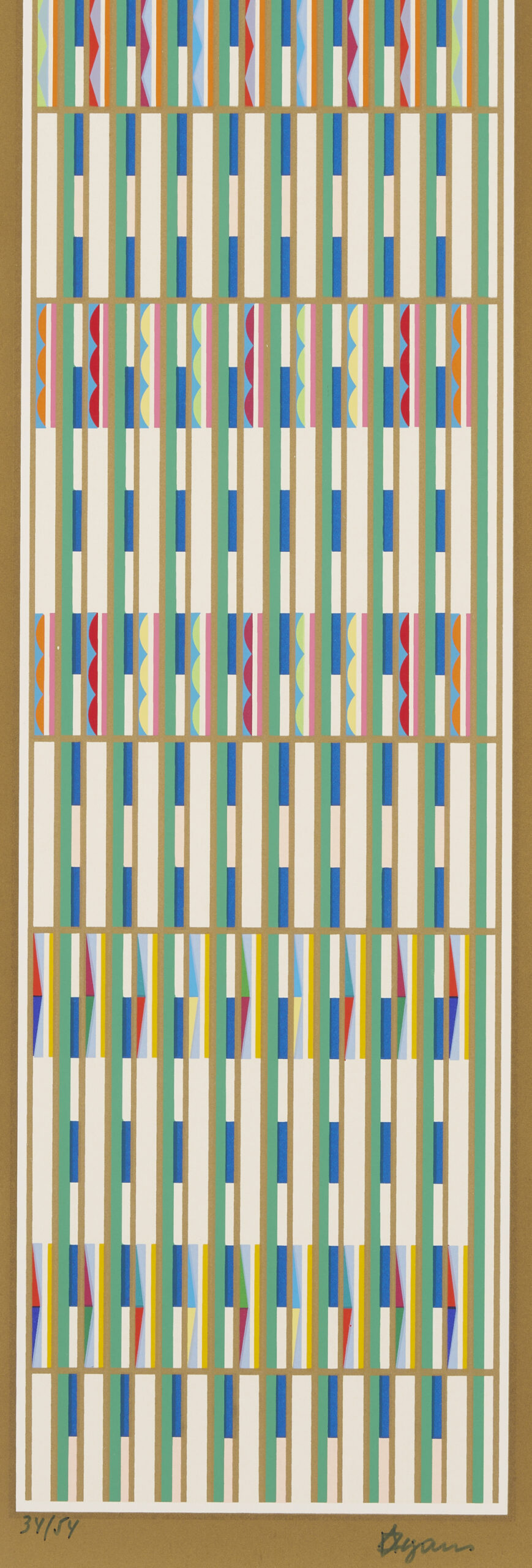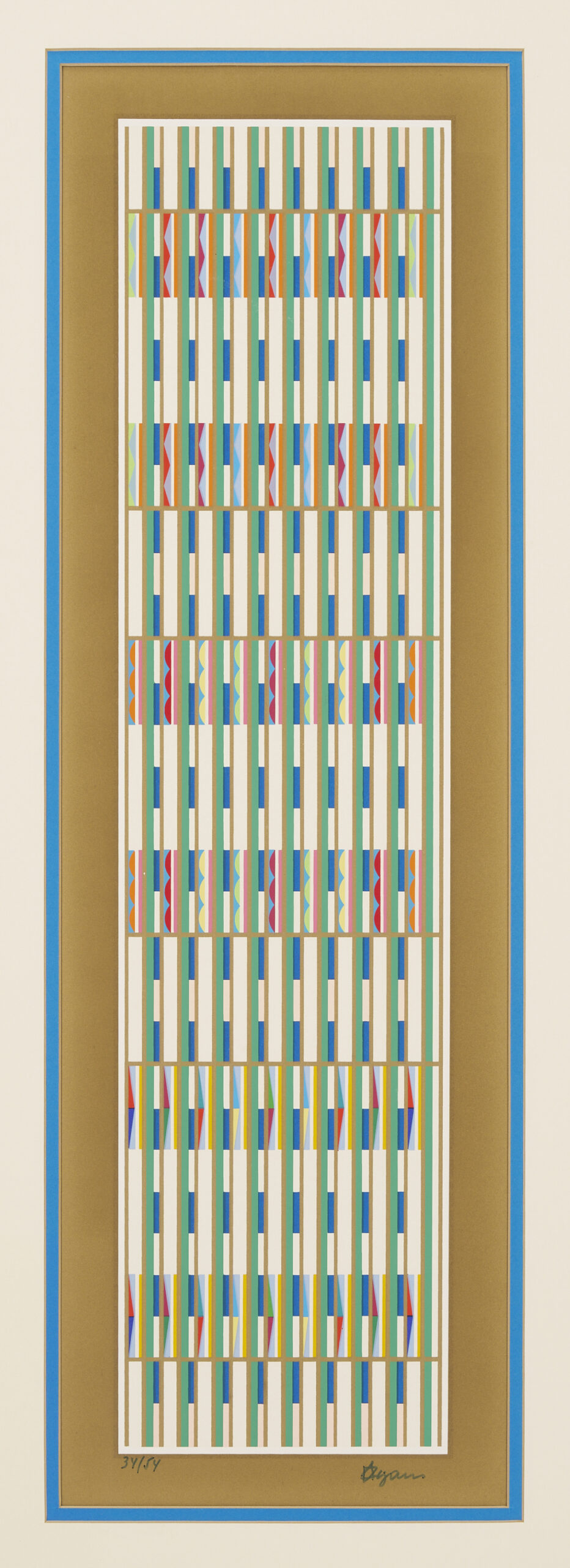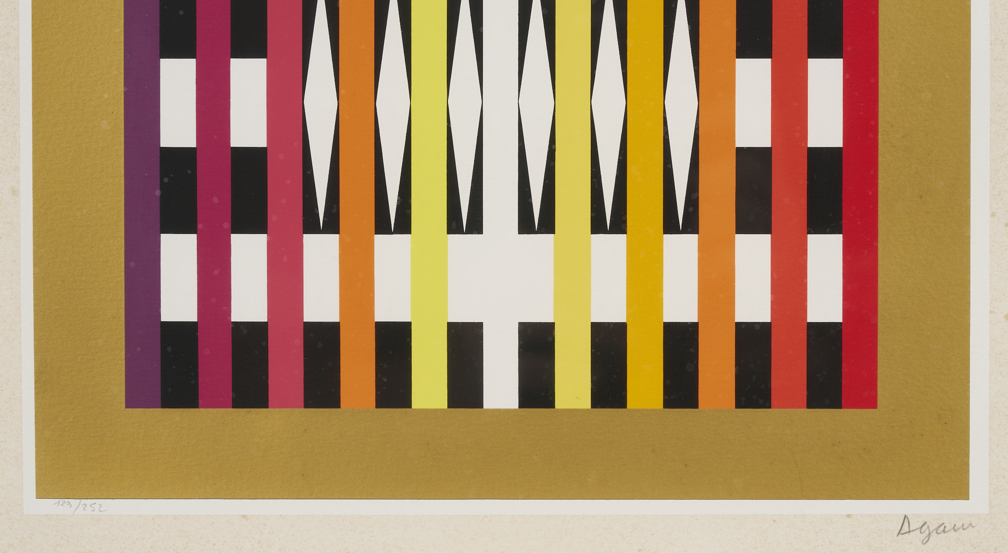 Yaacov (Gibstein) Agam (Israel/New York/France, born 1928) multi-color geometric abstraction Op Art screen prints, including one small horizontal print signed lower right and numbered 129/252 housed in a black metal frame (Sight: 10 1/4 in. H x 11 5/8 in. W. Framed: 16 5/8 in. H x 18 1/8 in. W), and one vertical print signed lower right and numbered 34/54 housed in a blonde wood frame (Sight: 25 1/2 in. H x 8 in. W. Framed: 35 in. H x 17 1/4 in. W).