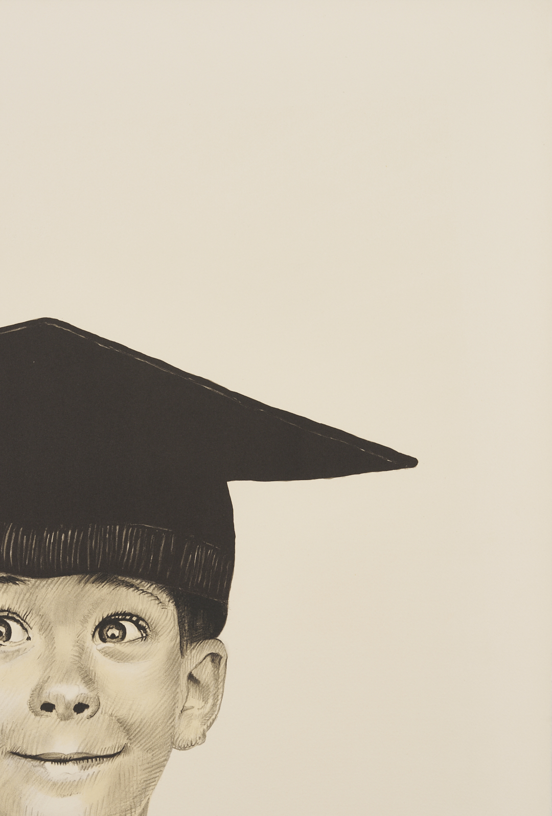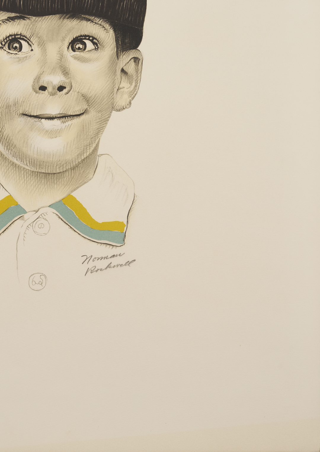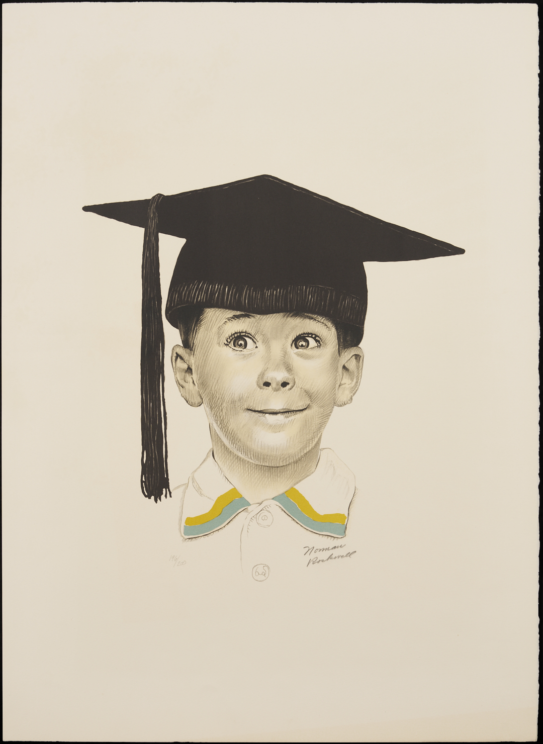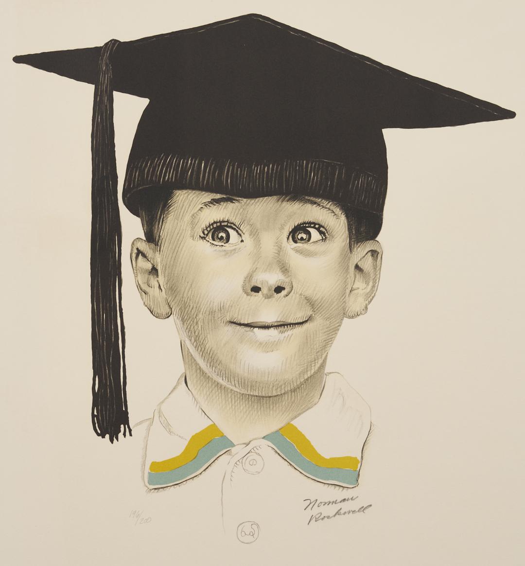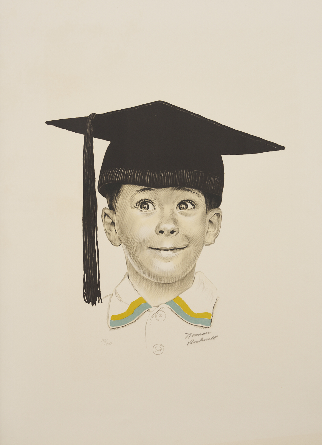 Norman Perceval Rockwell (New York/Massachusetts, 1894-1978) color lithograph on Arches paper, Big Day, 1959. A young boy shown from the neck up smiles and wears an oversized graduation hat or mortarboard. Printed by Circle Gallery, with blindstamp to lower left corner. Signed in pencil, lower right, and numbered 196/200, lower left. Unframed. Sheet: 29 1/2 in. H x 21 1/4 in. W. Note: “Originally created for a 1959 Fidelity Bank advertisement…[t]he print suggests that a family should start preparing for this child’s graduation day early with Fidelity Bank.” (Source: Norman Rockwell Museum)
