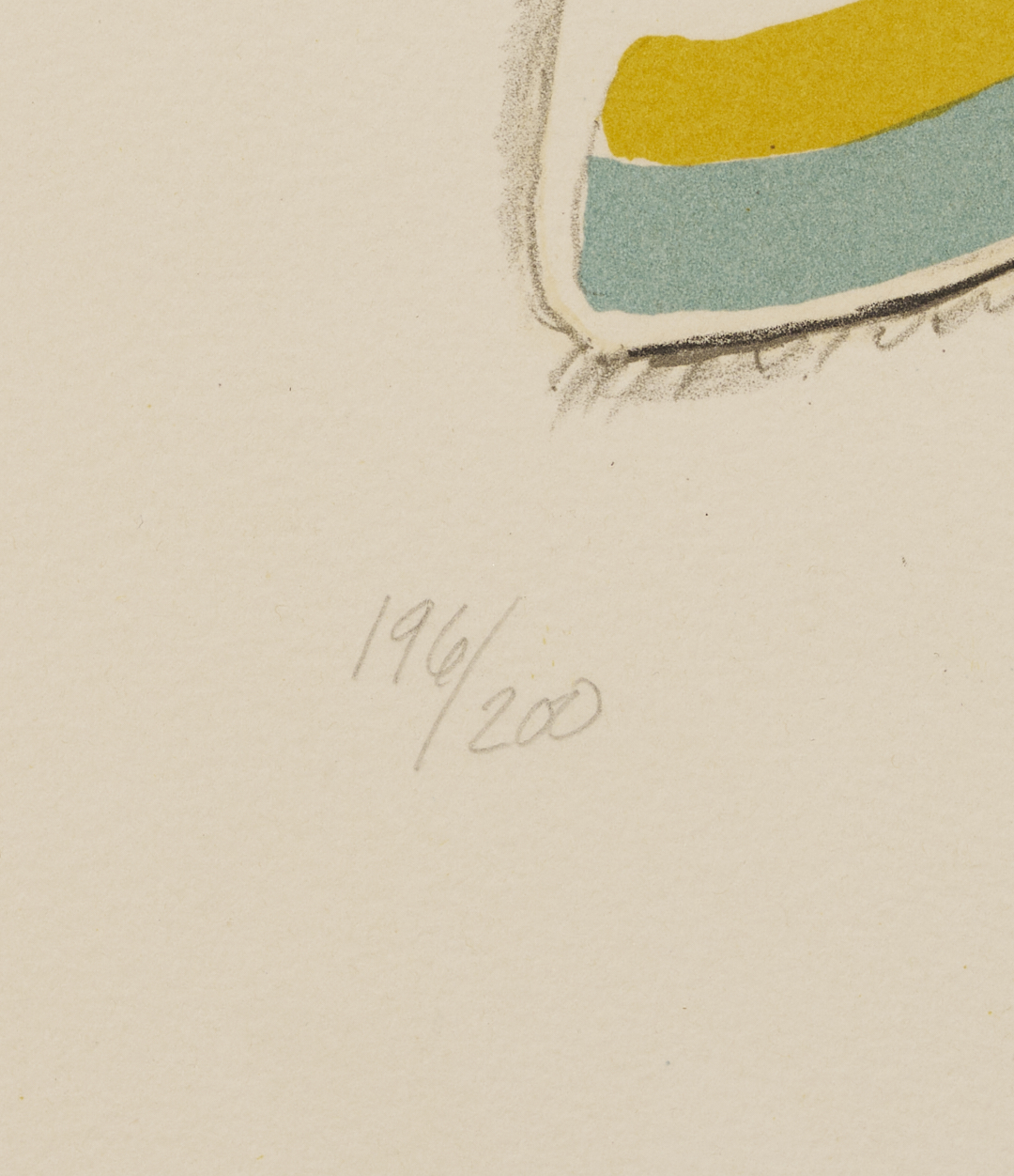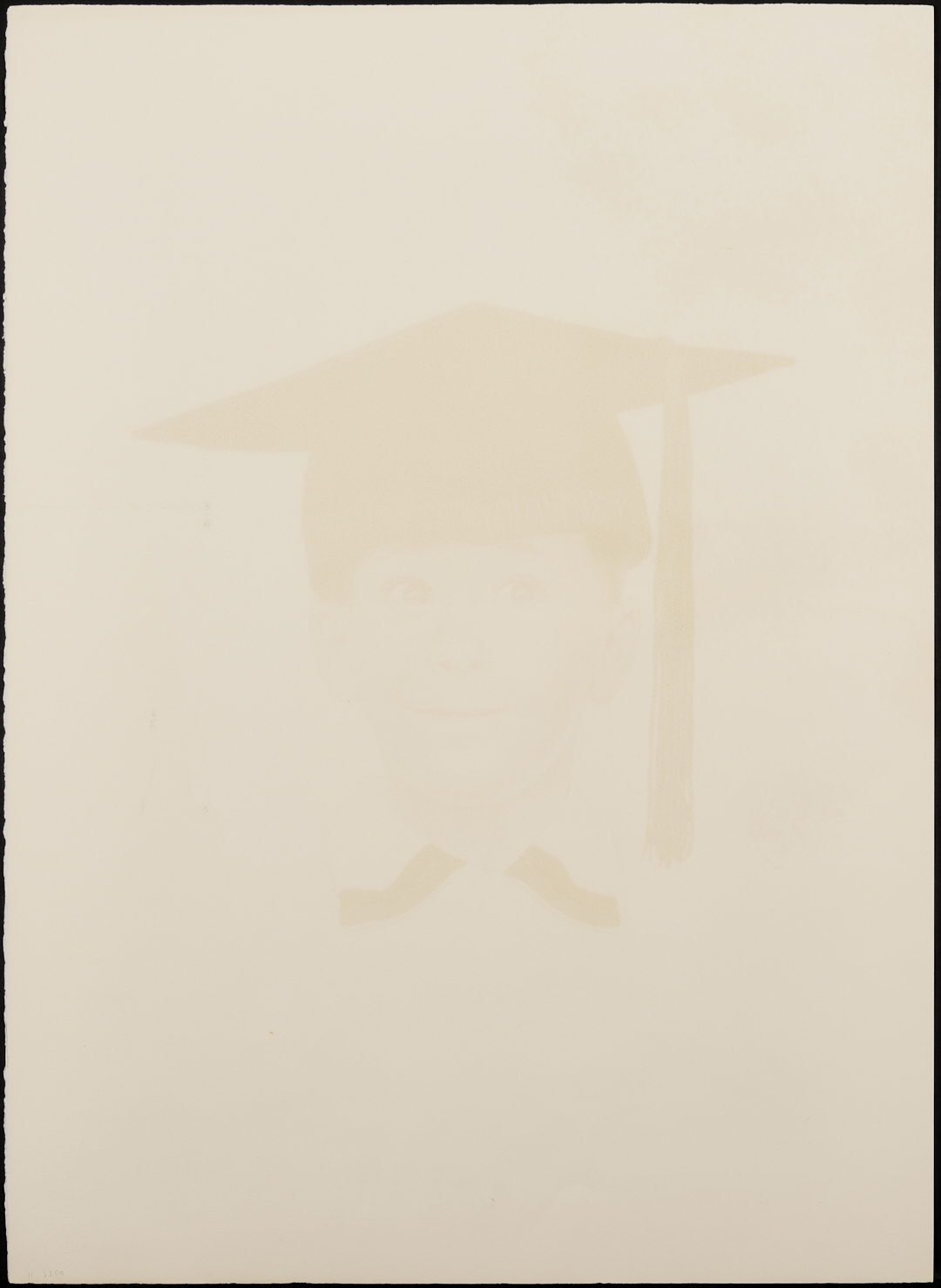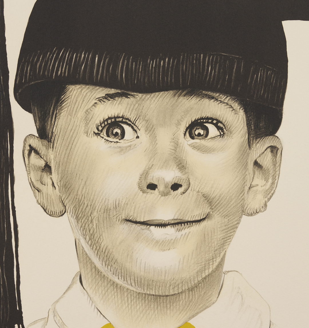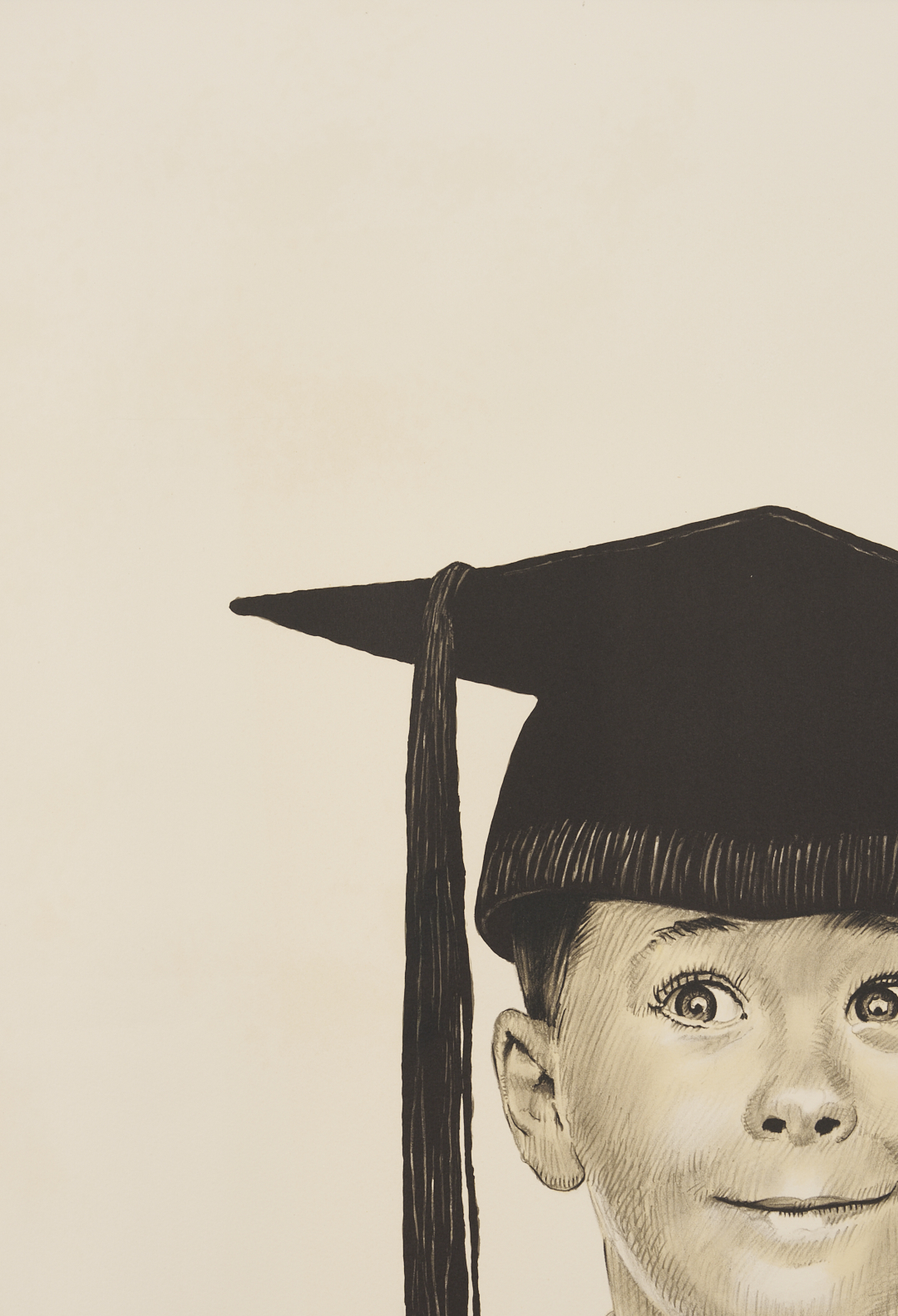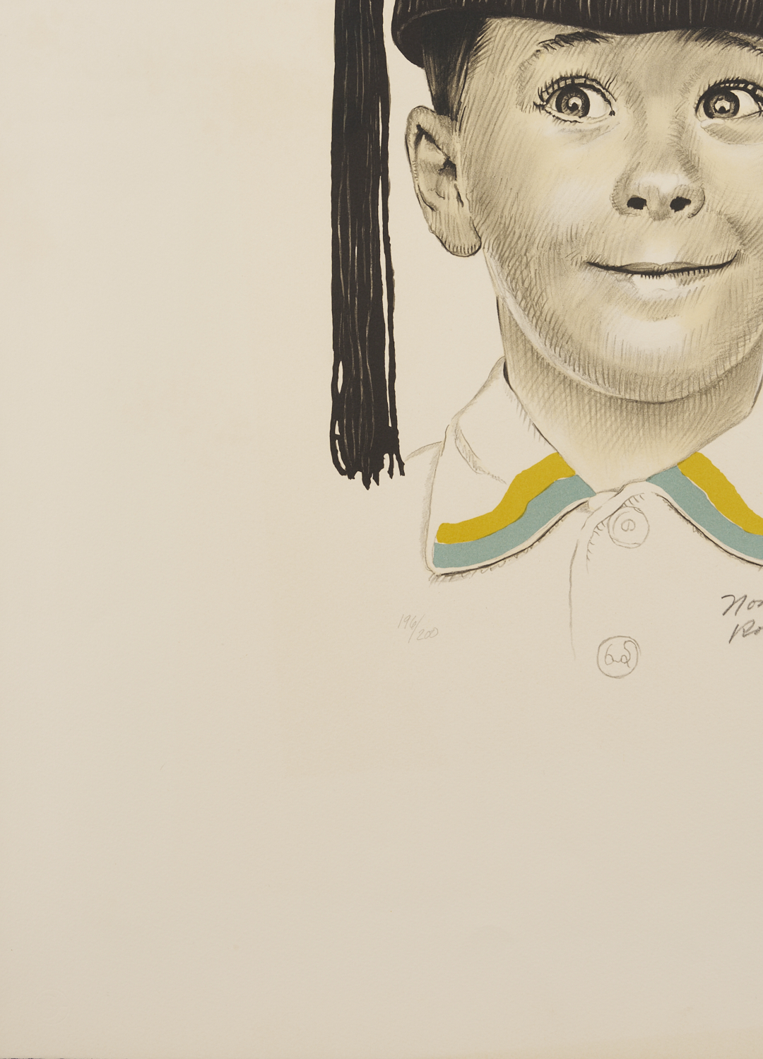Norman Perceval Rockwell (New York/Massachusetts, 1894-1978) color lithograph on Arches paper, Big Day, 1959. A young boy shown from the neck up smiles and wears an oversized graduation hat or mortarboard. Printed by Circle Gallery, with blindstamp to lower left corner. Signed in pencil, lower right, and numbered 196/200, lower left. Unframed. Sheet: 29 1/2 in. H x 21 1/4 in. W. Note: “Originally created for a 1959 Fidelity Bank advertisement…[t]he print suggests that a family should start preparing for this child’s graduation day early with Fidelity Bank.” (Source: Norman Rockwell Museum)