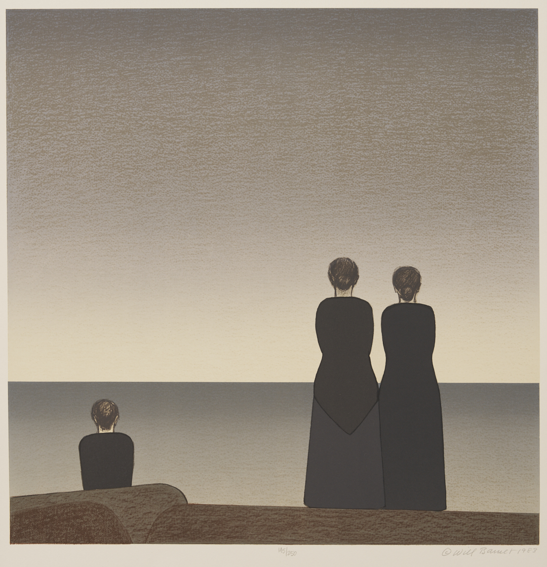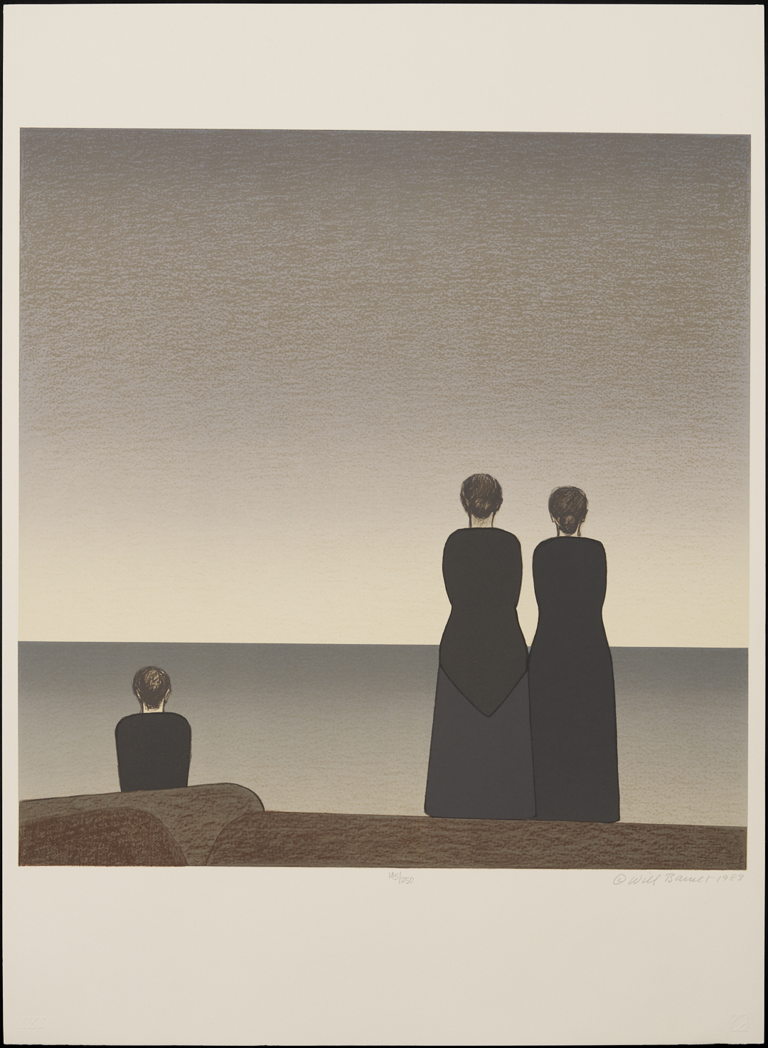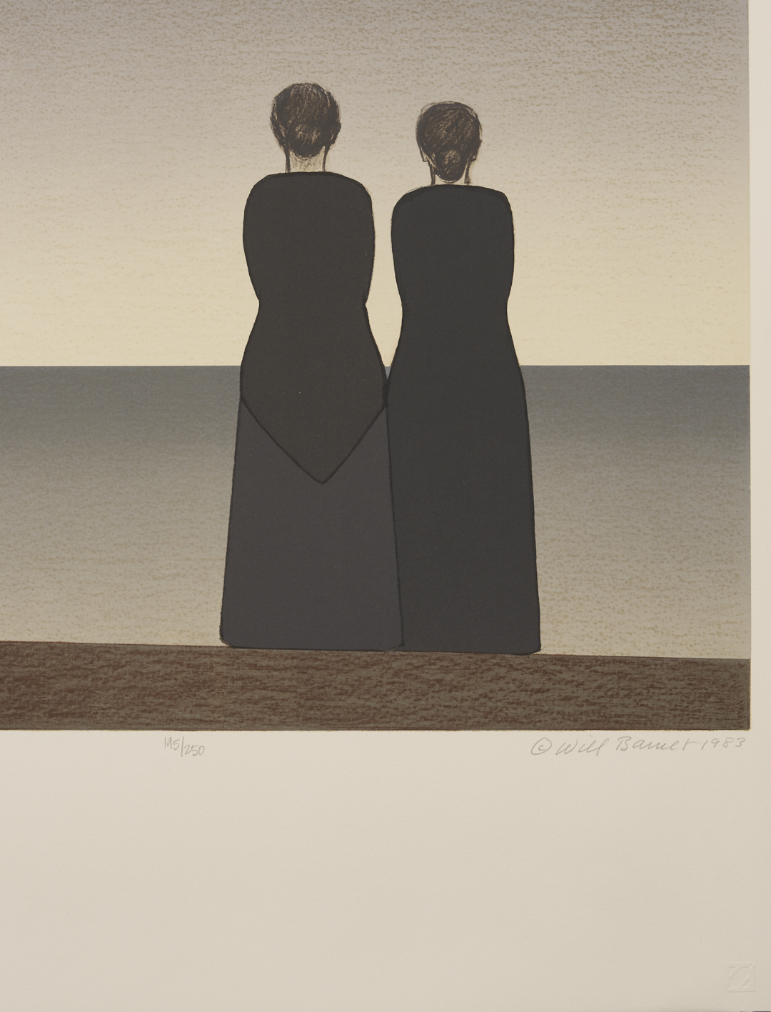 Will Barnet (American, 1911-2012) color lithograph on Somerset paper, “Peter Grimes,” 1983. Two women in black and seen from behind look out over what appears to be a body of water while a third figure sits to their left, partially obscured by rocky forms that fill the foreground. From the 1984 Metropolitan Opera Fine Art II portfolio. Signed, dated, and numbered 195/250 in pencil, lower margin. Printed by American Atelier and co-published by Circle Fine Art and Metropolitan Opera Association, with American Atelier and Metropolitan Opera Association blind stamps to lower corners and printed publisher information plus copyright date en verso. Unframed. Sheet: 30 in. H x 22 in. W. Note: This image is a reference to a section from the narrative poem “The Borough” by George Crabbe and a subsequent opera by Benjamin Britten.