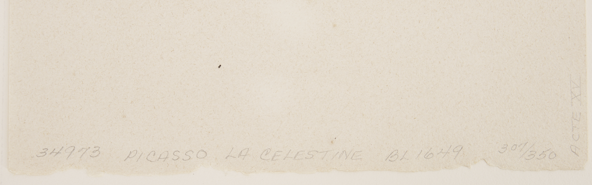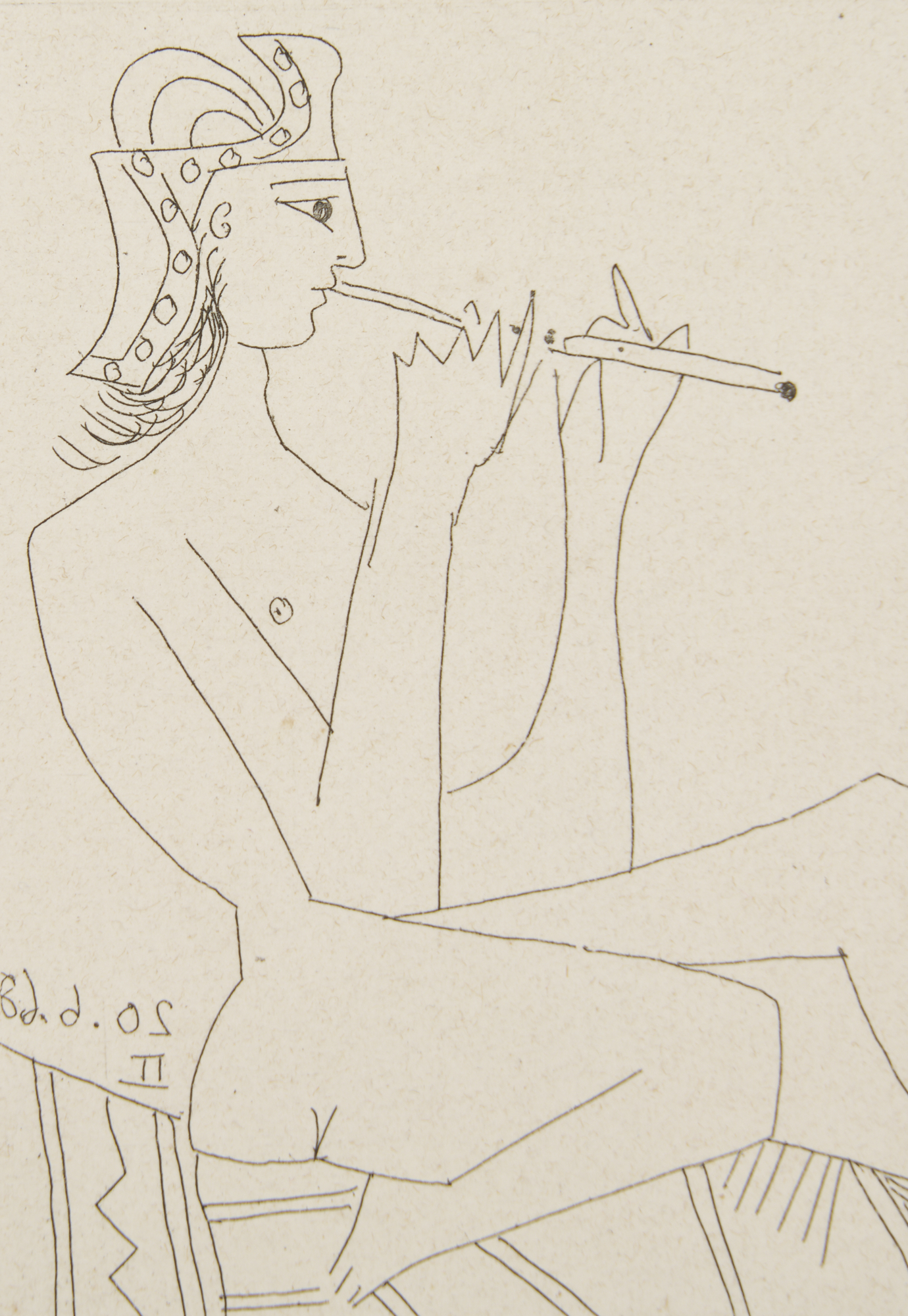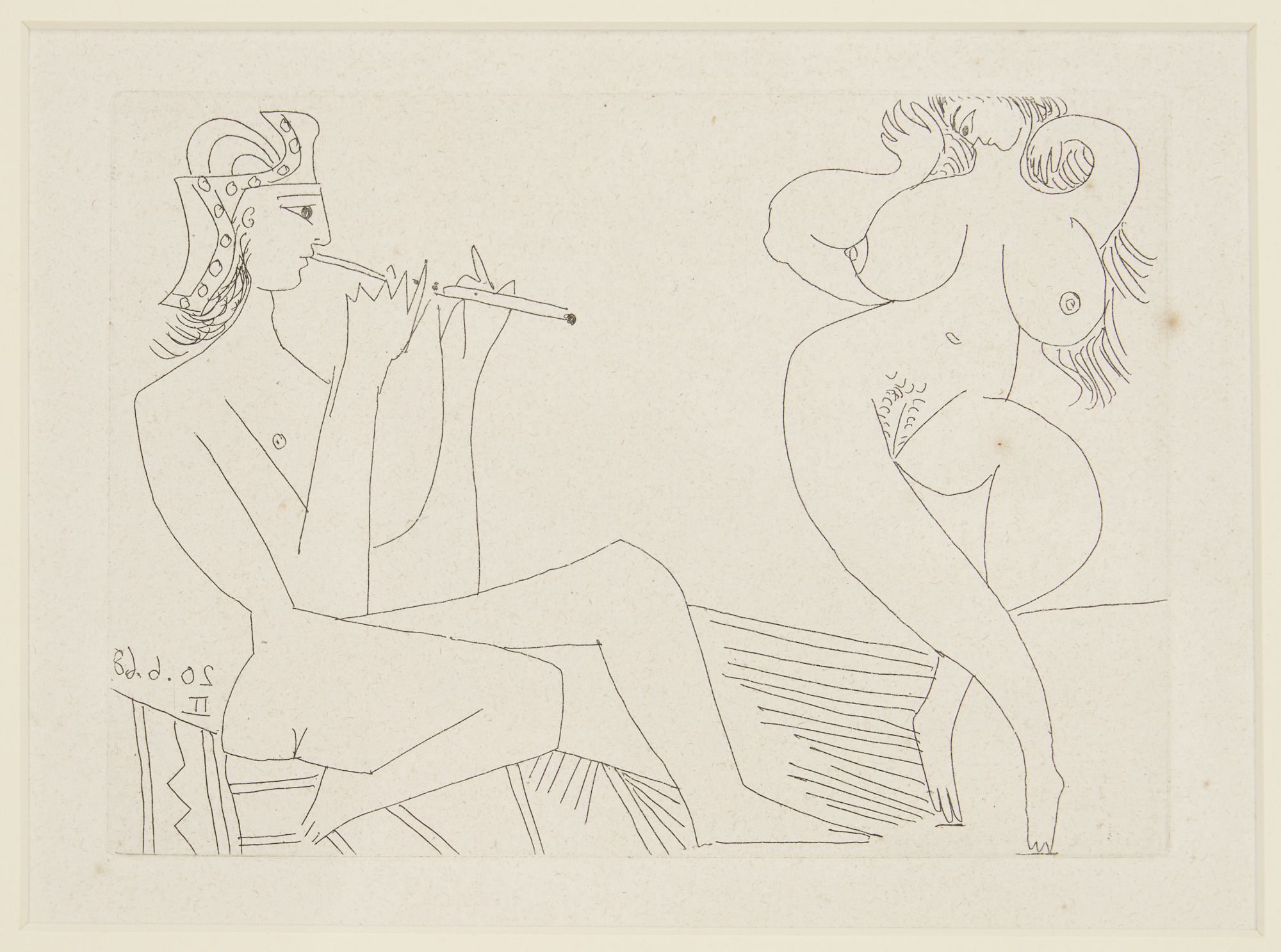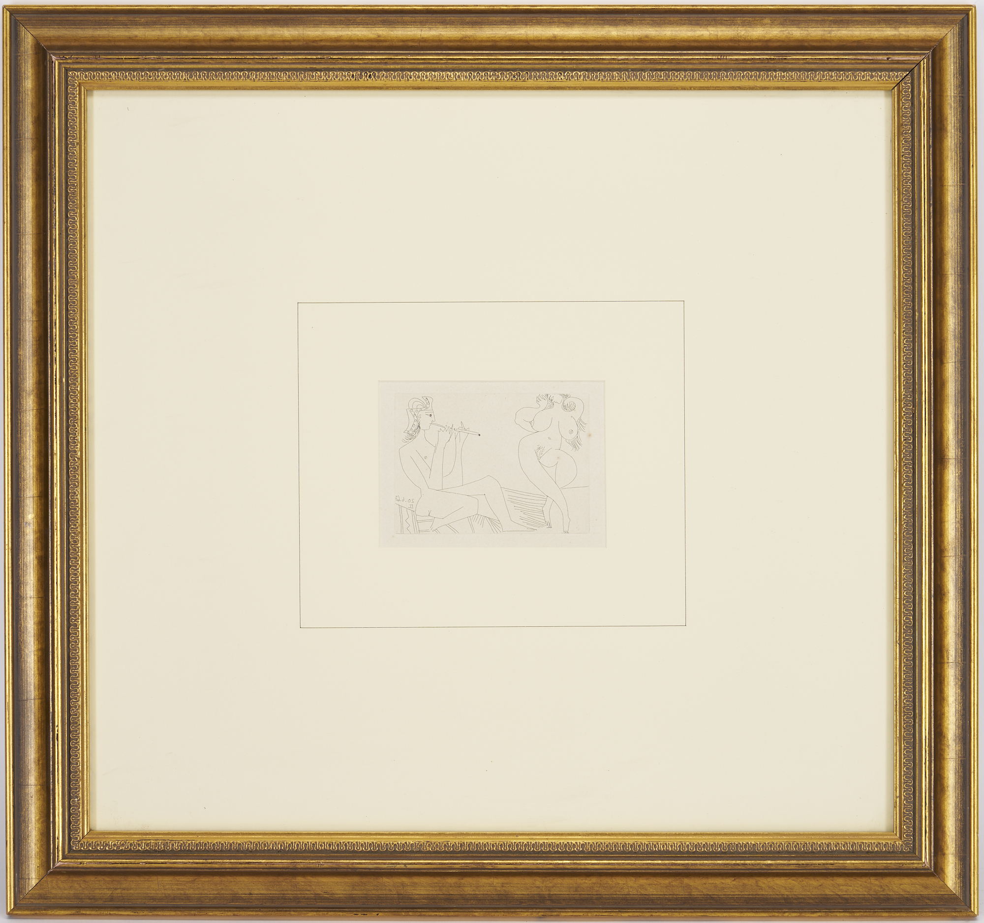 Pablo Picasso (Spanish, 1881-1973) etching in black ink on laid paper entitled Flutiste grec et Danseuese and depicting a nude, male flute-player in distinctive headgear and a nude female dancer. From the book La Celestine by Fernando de Rojas published by Atelier Crommelynck, Paris, 1971. Plate 169 of Series 347. Unsigned. Dated in the plate, lower right. With La Celestine watermark, lower center. Inscribed in pencil en verso “34973 Picasso La Celestine BL 1649 307/350 Acte XV.” This information is repeated on sticker affixed to backing. Ref.: Cramer Books 149. Housed under plexiglass in a gilt wood frame with ivory mat and French line. Plate: 3 1/2″ H x 4 13/16″ W. Sheet: 8 1/4 ” H x 6 1/8″ W. Frame: 22 3/4″ H x 24 6/16″ W.