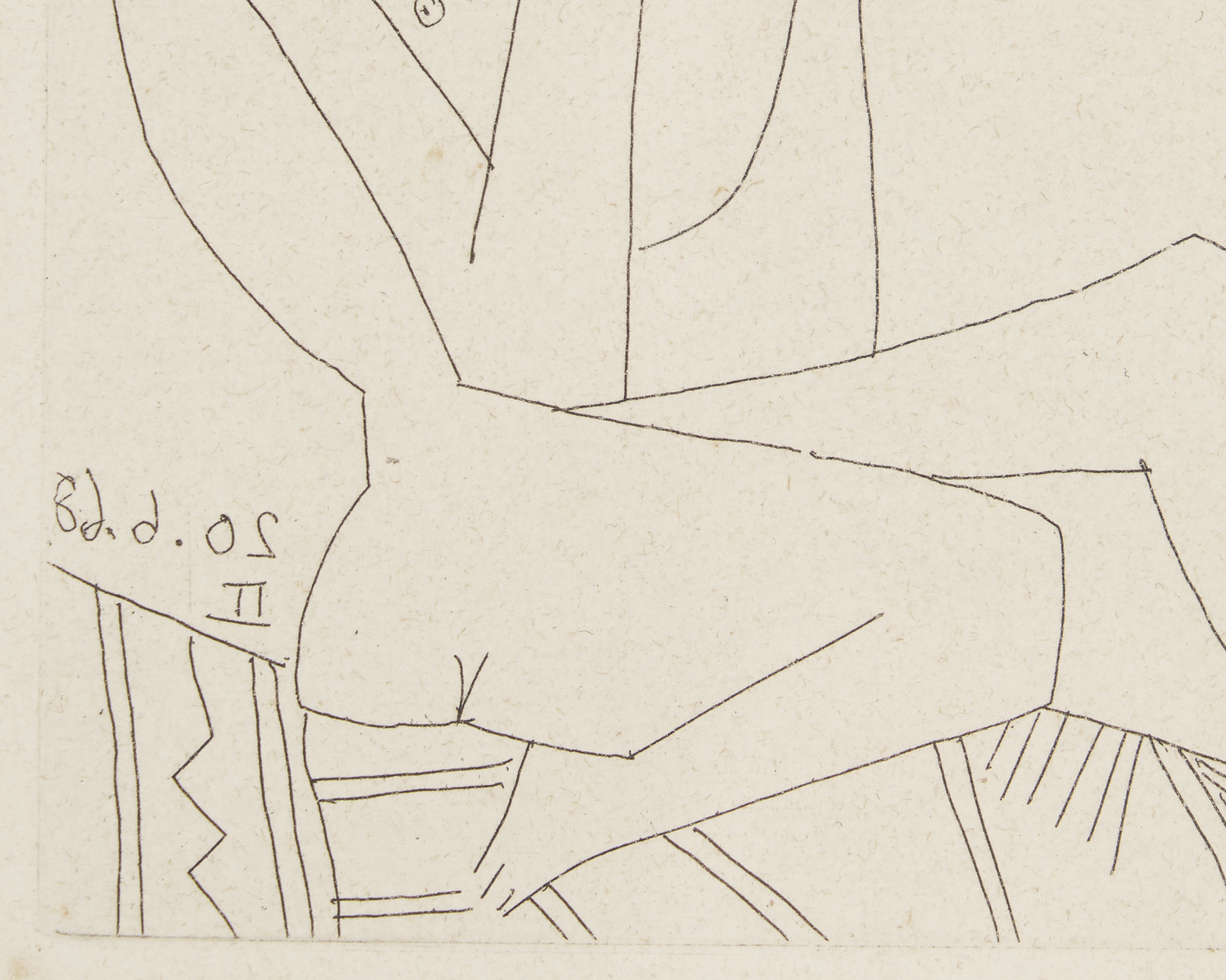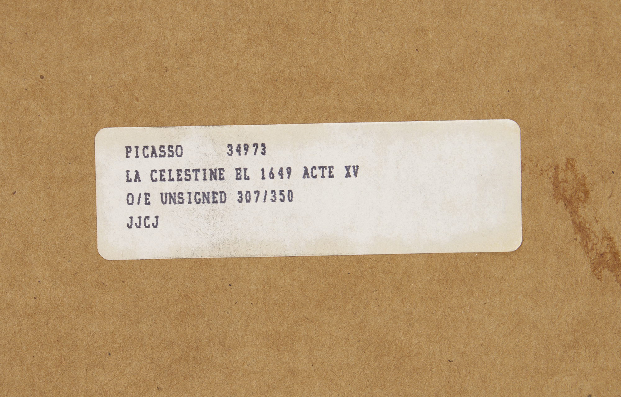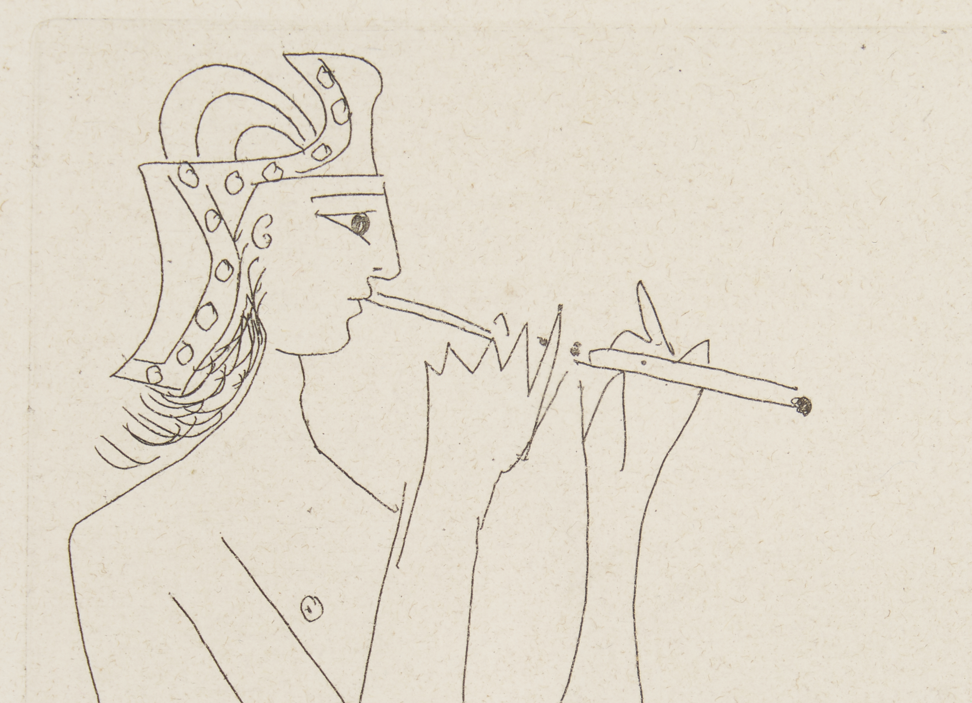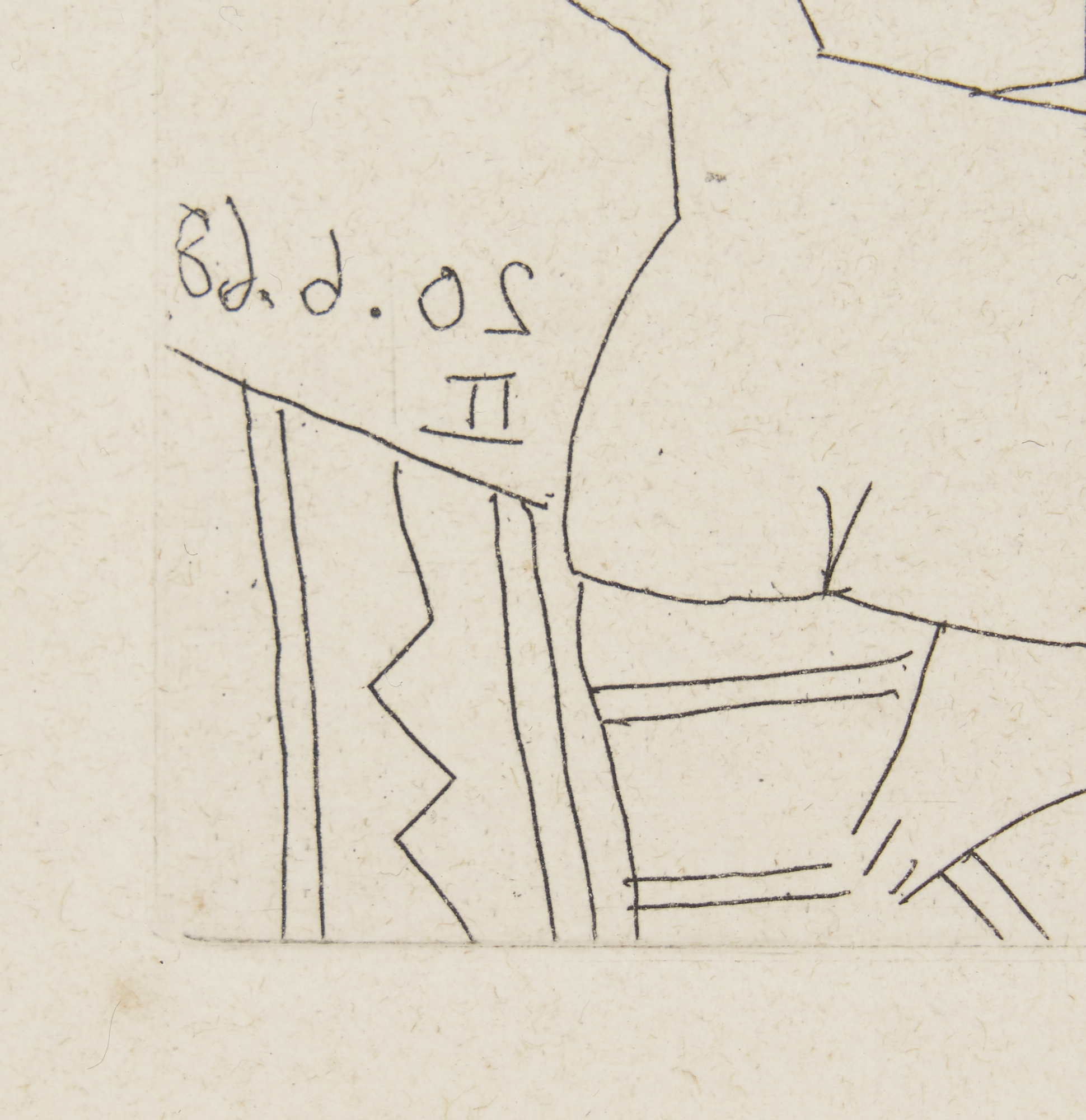 Pablo Picasso (Spanish, 1881-1973) etching in black ink on laid paper entitled Flutiste grec et Danseuese and depicting a nude, male flute-player in distinctive headgear and a nude female dancer. From the book La Celestine by Fernando de Rojas published by Atelier Crommelynck, Paris, 1971. Plate 169 of Series 347. Unsigned. Dated in the plate, lower right. With La Celestine watermark, lower center. Inscribed in pencil en verso “34973 Picasso La Celestine BL 1649 307/350 Acte XV.” This information is repeated on sticker affixed to backing. Ref.: Cramer Books 149. Housed under plexiglass in a gilt wood frame with ivory mat and French line. Plate: 3 1/2″ H x 4 13/16″ W. Sheet: 8 1/4 ” H x 6 1/8″ W. Frame: 22 3/4″ H x 24 6/16″ W.