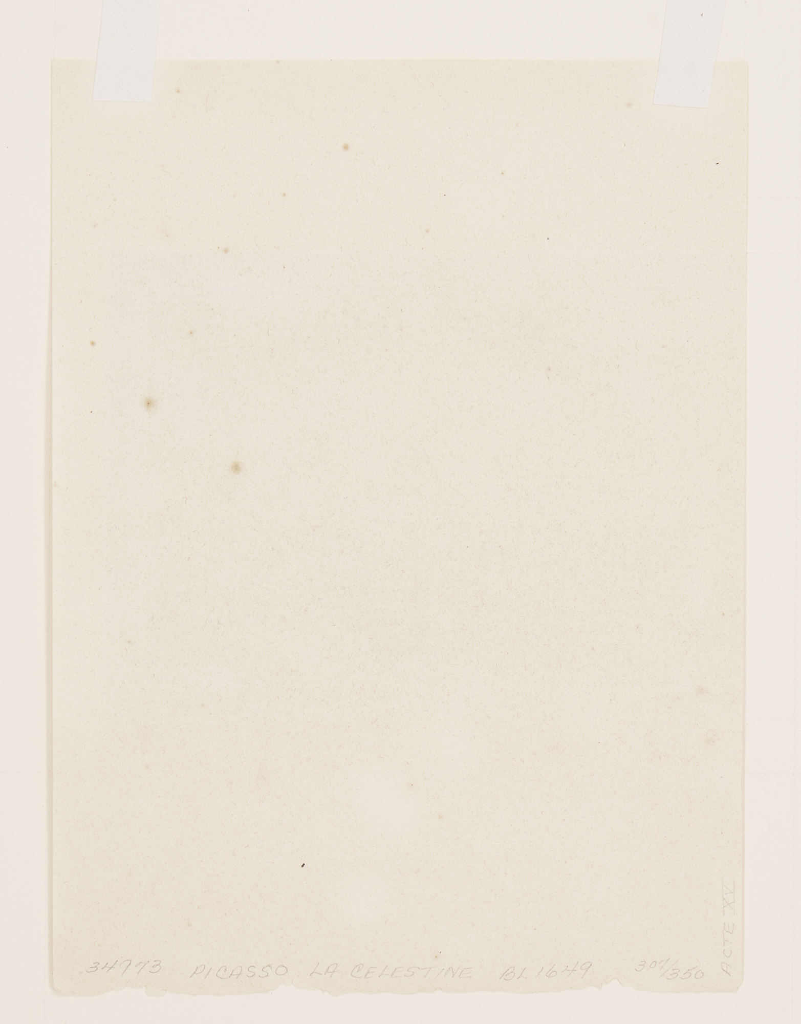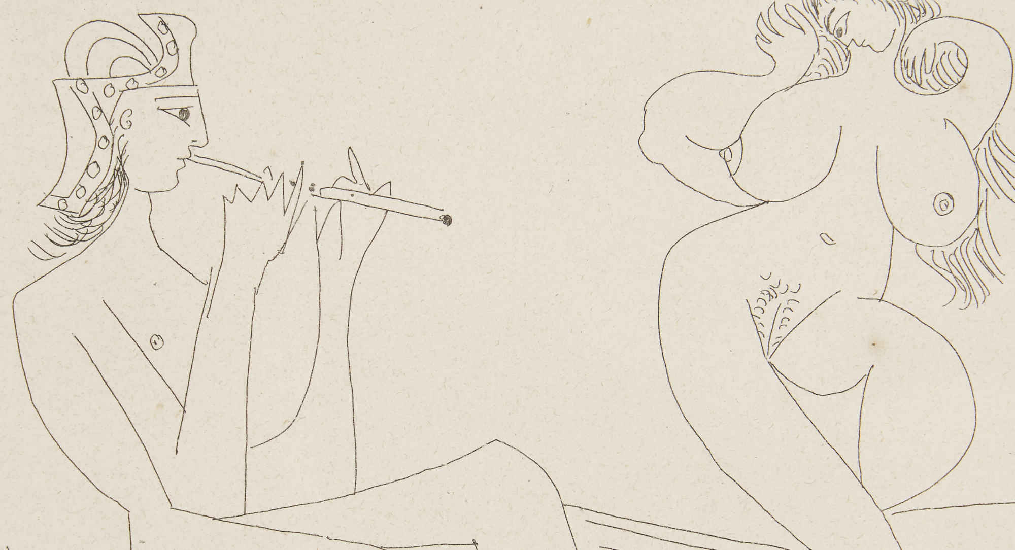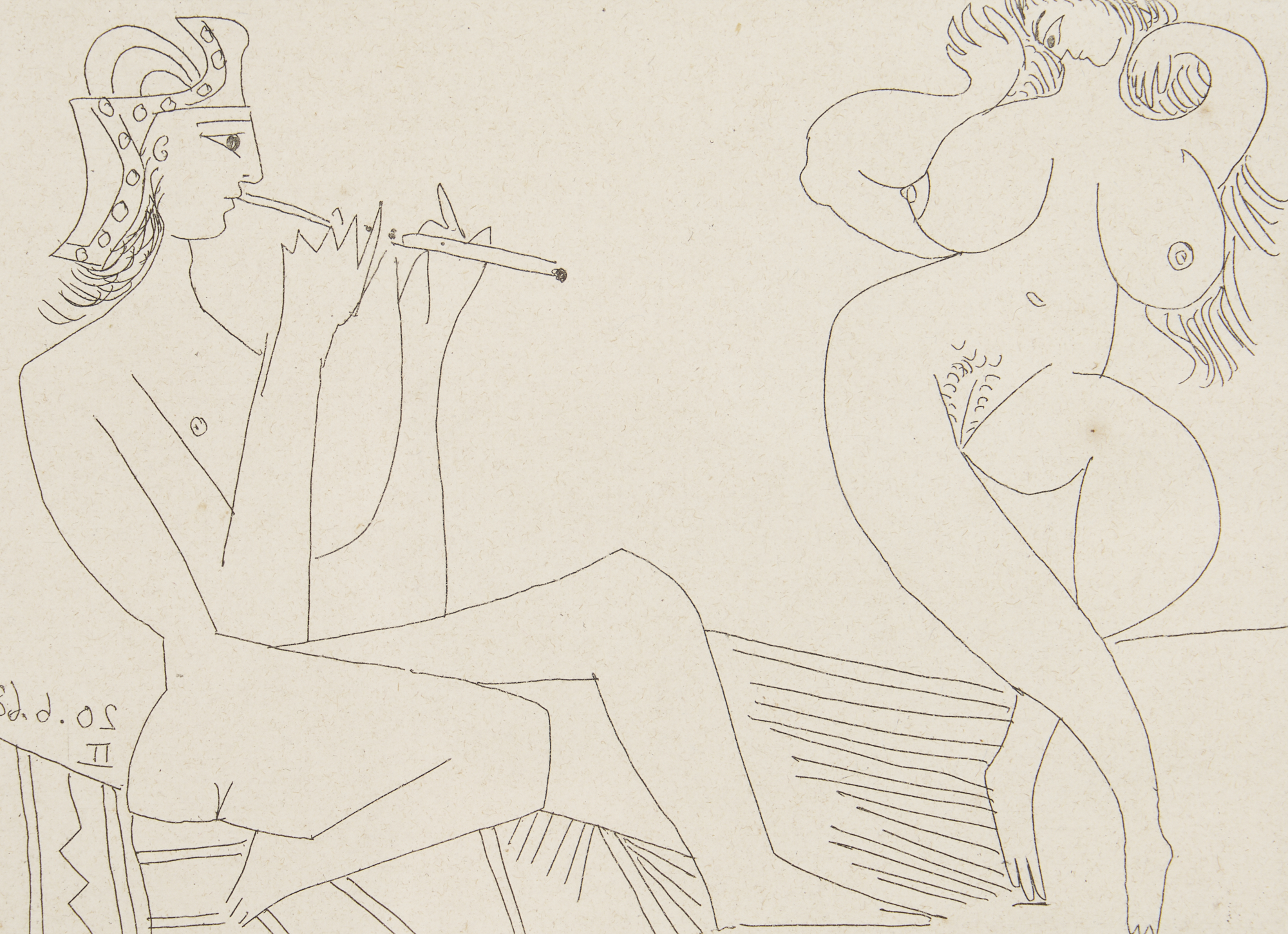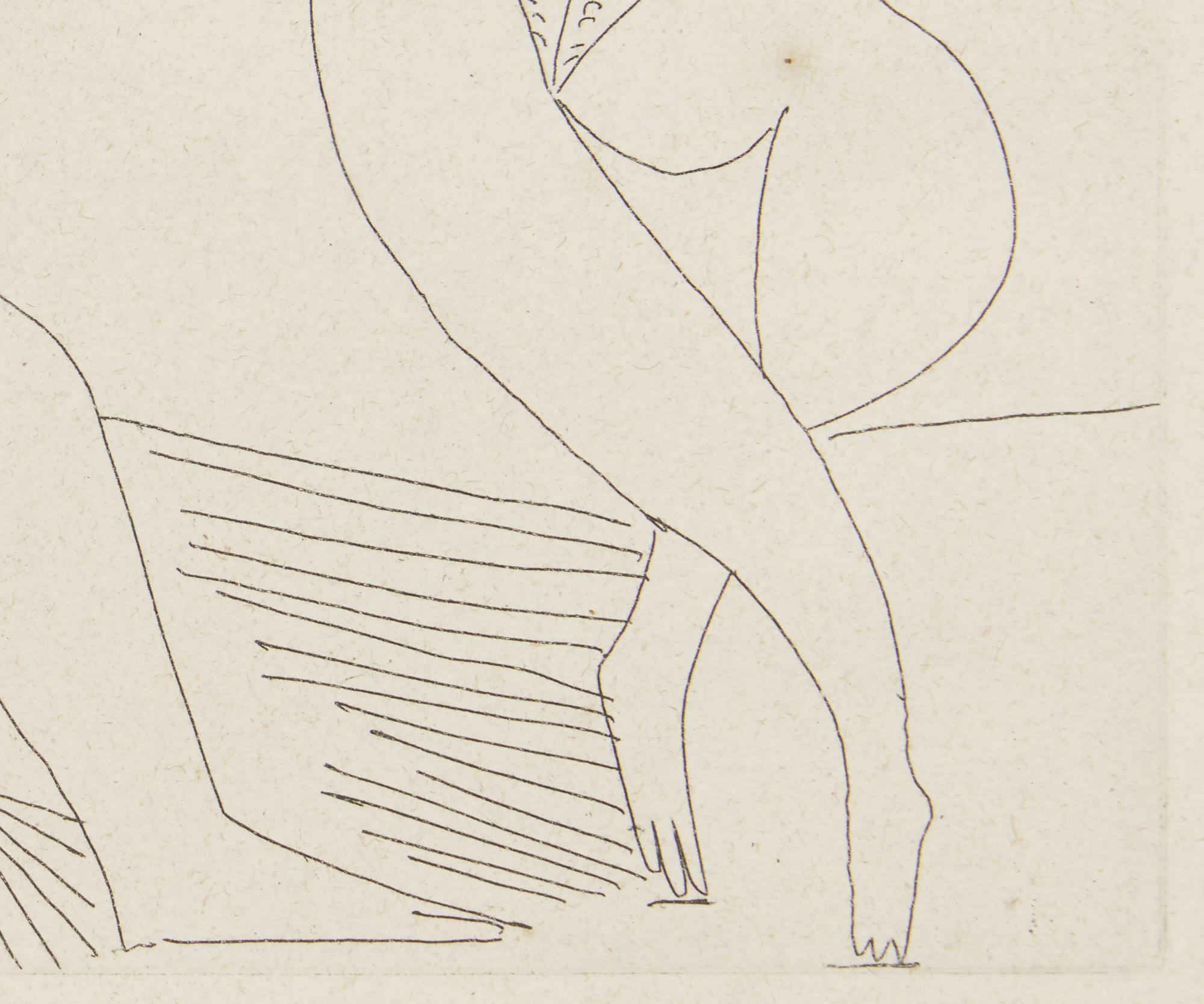 Pablo Picasso (Spanish, 1881-1973) etching in black ink on laid paper entitled Flutiste grec et Danseuese and depicting a nude, male flute-player in distinctive headgear and a nude female dancer. From the book La Celestine by Fernando de Rojas published by Atelier Crommelynck, Paris, 1971. Plate 169 of Series 347. Unsigned. Dated in the plate, lower right. With La Celestine watermark, lower center. Inscribed in pencil en verso “34973 Picasso La Celestine BL 1649 307/350 Acte XV.” This information is repeated on sticker affixed to backing. Ref.: Cramer Books 149. Housed under plexiglass in a gilt wood frame with ivory mat and French line. Plate: 3 1/2″ H x 4 13/16″ W. Sheet: 8 1/4 ” H x 6 1/8″ W. Frame: 22 3/4″ H x 24 6/16″ W.