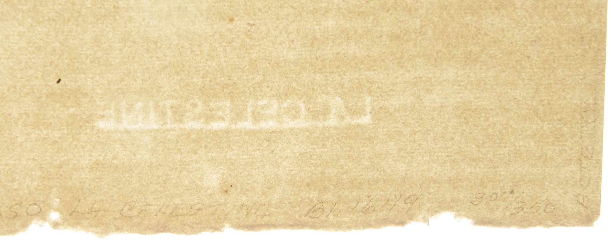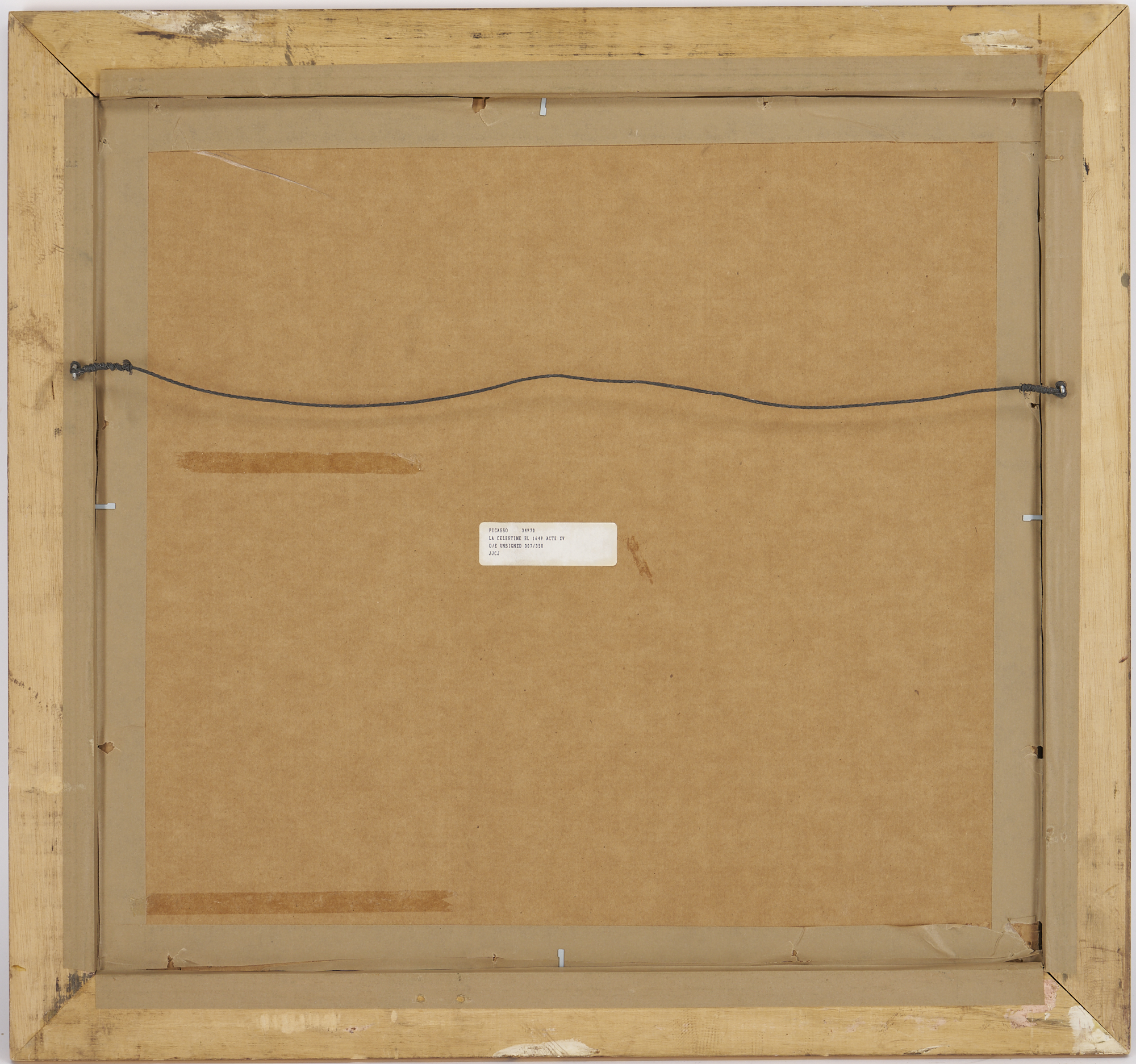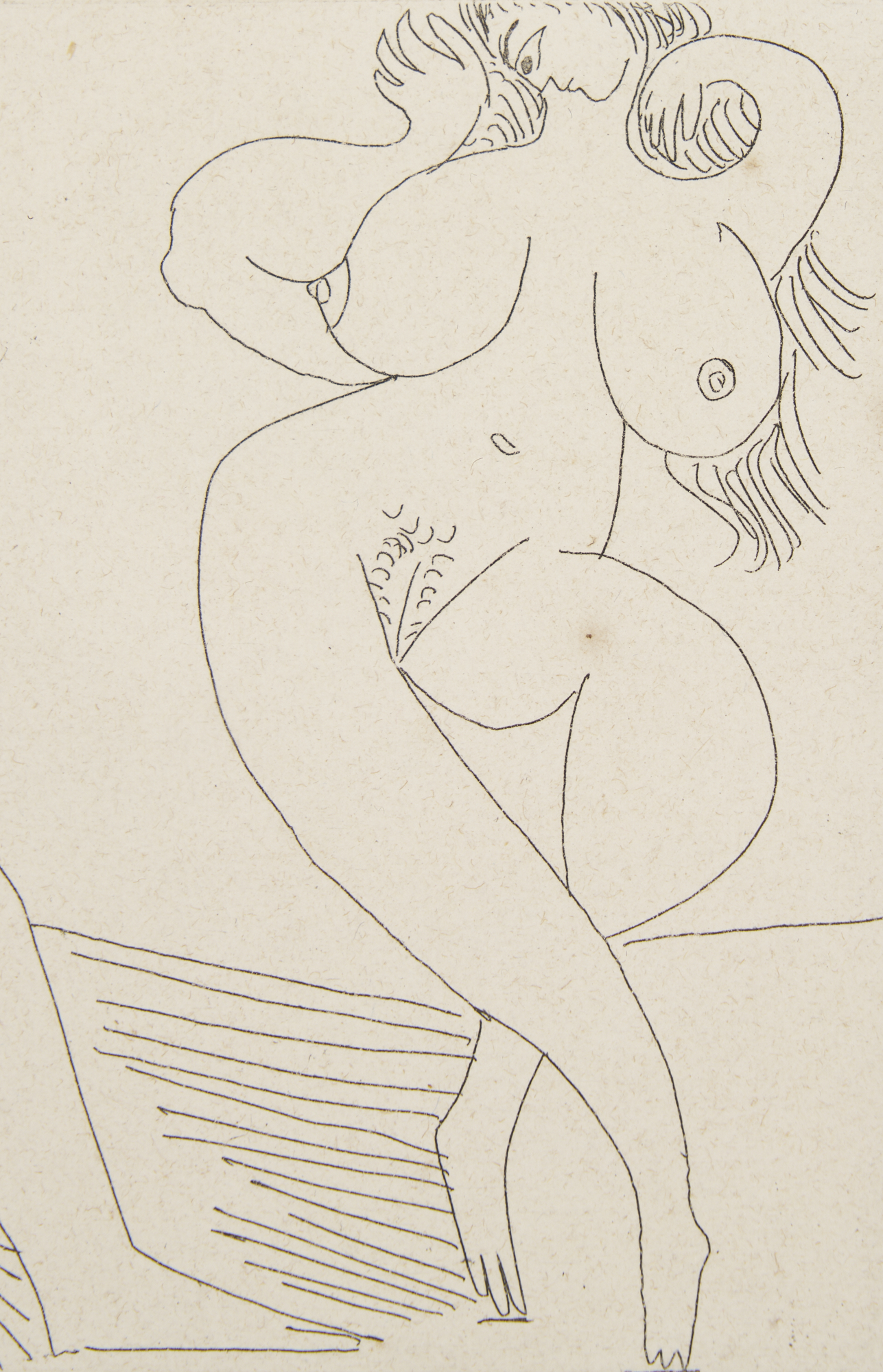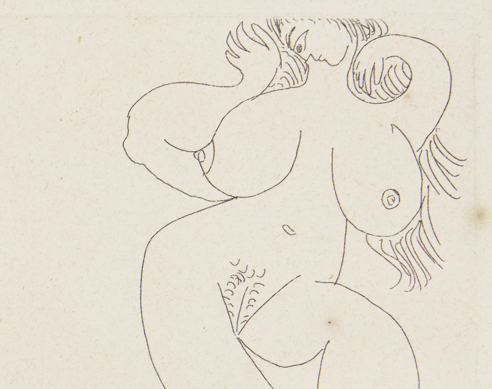 Pablo Picasso (Spanish, 1881-1973) etching in black ink on laid paper entitled Flutiste grec et Danseuese and depicting a nude, male flute-player in distinctive headgear and a nude female dancer. From the book La Celestine by Fernando de Rojas published by Atelier Crommelynck, Paris, 1971. Plate 169 of Series 347. Unsigned. Dated in the plate, lower right. With La Celestine watermark, lower center. Inscribed in pencil en verso “34973 Picasso La Celestine BL 1649 307/350 Acte XV.” This information is repeated on sticker affixed to backing. Ref.: Cramer Books 149. Housed under plexiglass in a gilt wood frame with ivory mat and French line. Plate: 3 1/2″ H x 4 13/16″ W. Sheet: 8 1/4 ” H x 6 1/8″ W. Frame: 22 3/4″ H x 24 6/16″ W.